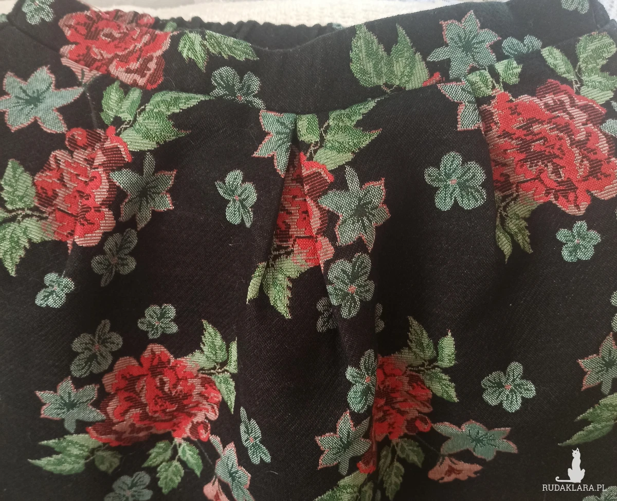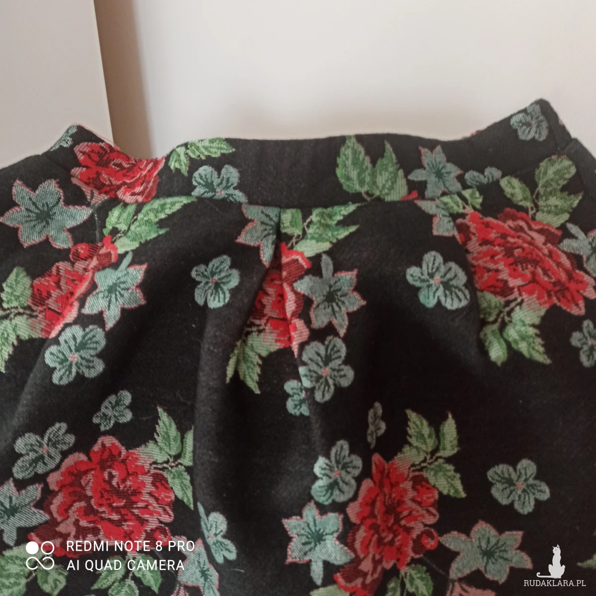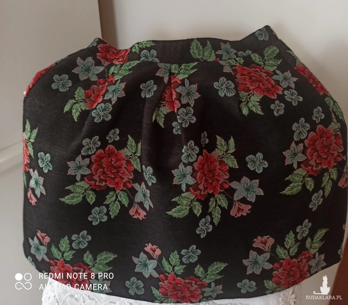 Żakardowa czarna spódniczka nowa w kwiaty. Pasek z gumką, z czterema zakładkami na przodzie. Na podszewce. Bardzo elegancka na specjalne okazje. Obwód paska bez rozciągania 64 cm, długość 43 cm z paskiem.