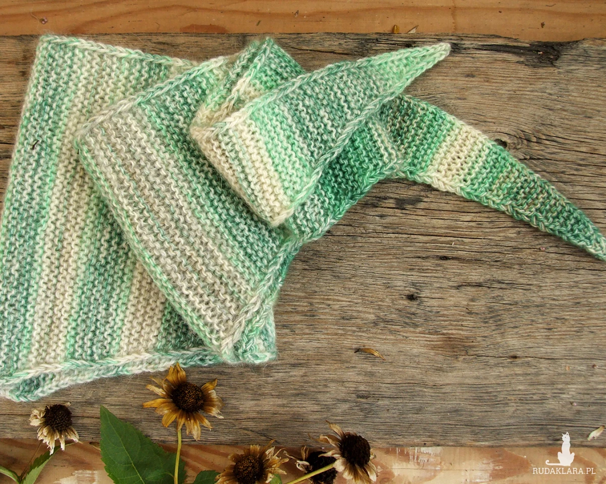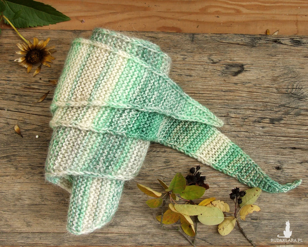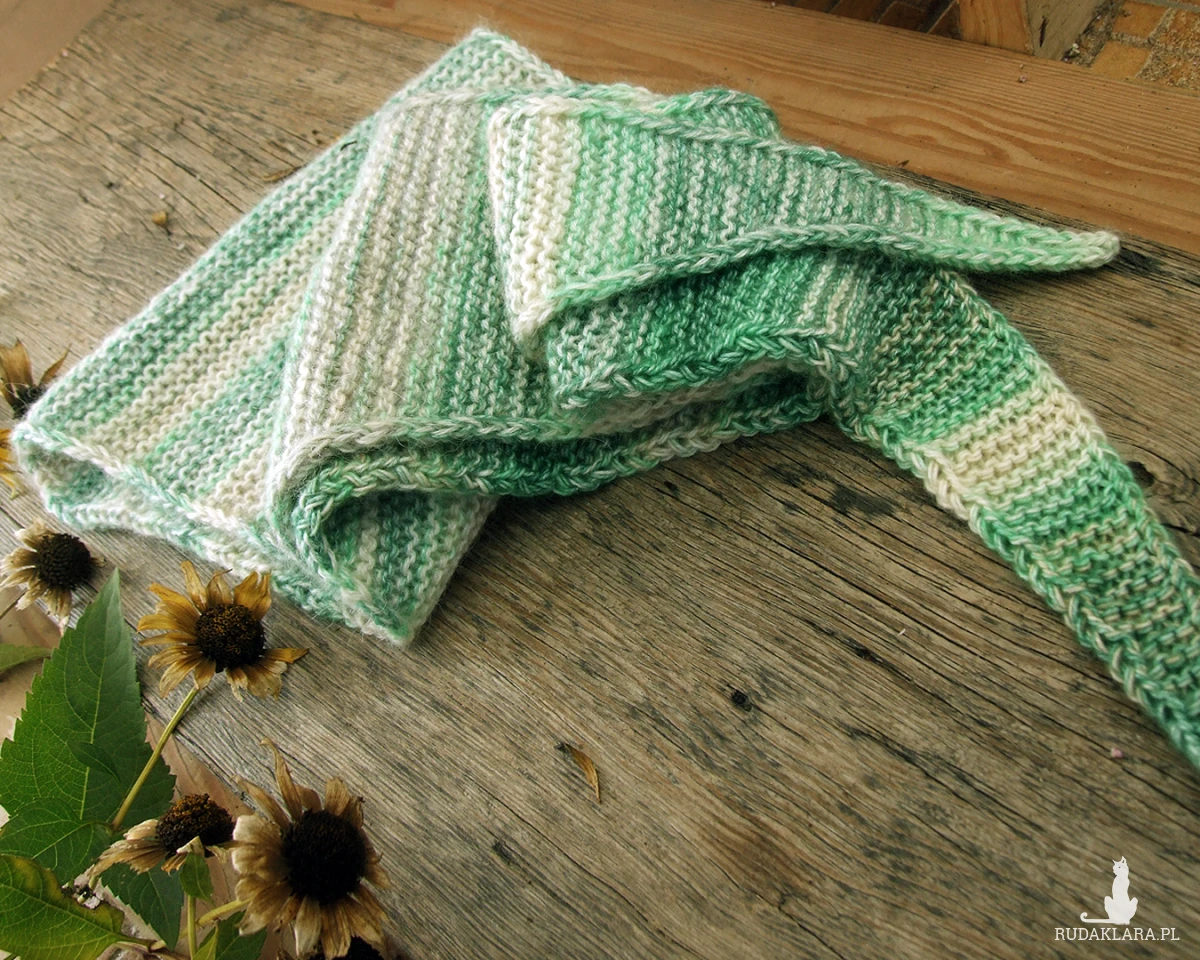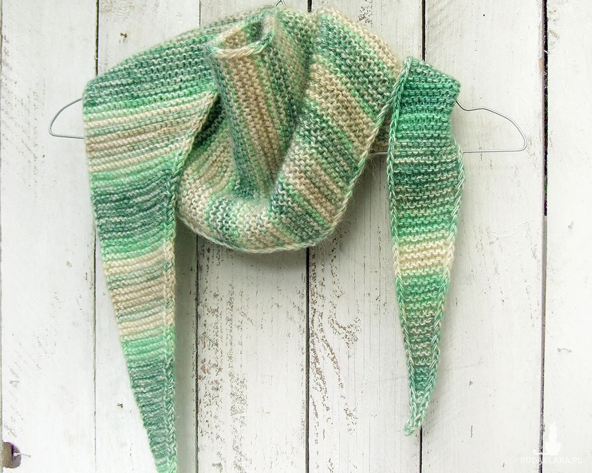 Szalik ma kształt trójkąta z bardzo długimi bokami, przypomina trochę wąską chustę. Dzięki temu bardzo ładnie i dokładnie otula szyję, a długie boki możemy fantazyjnie zawiązać.