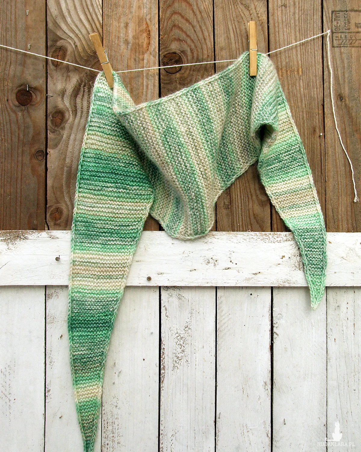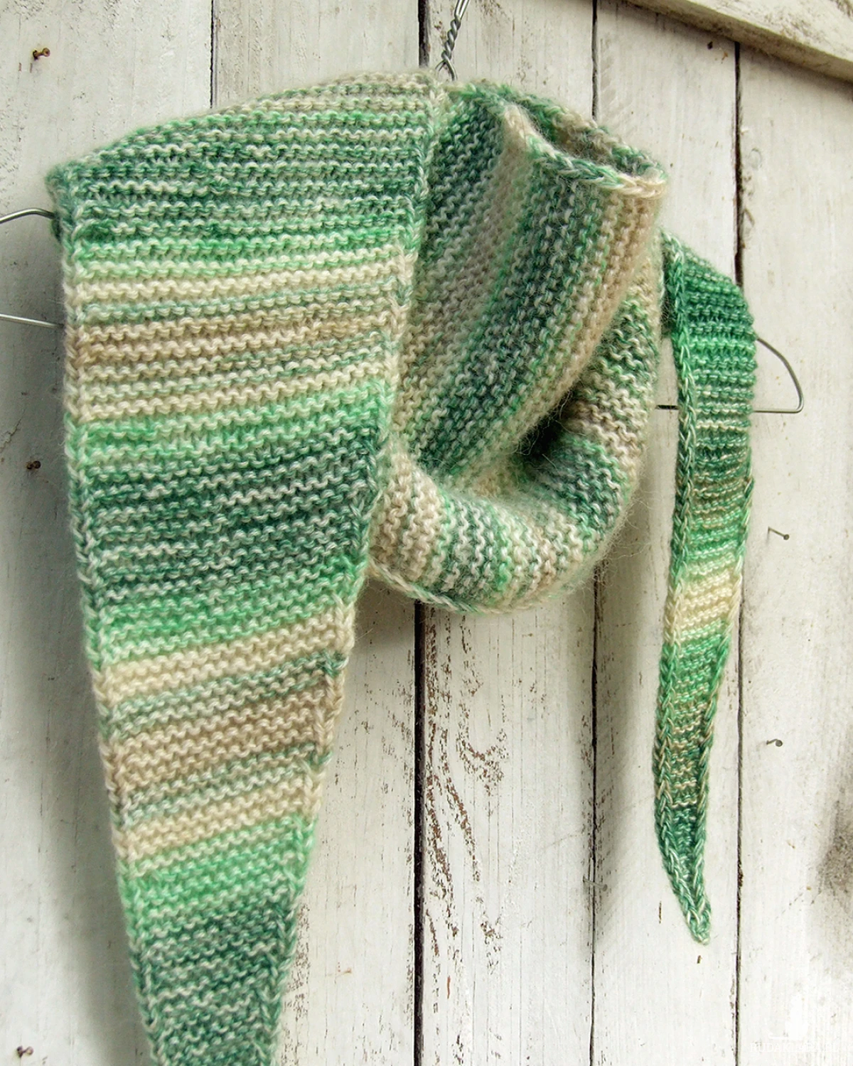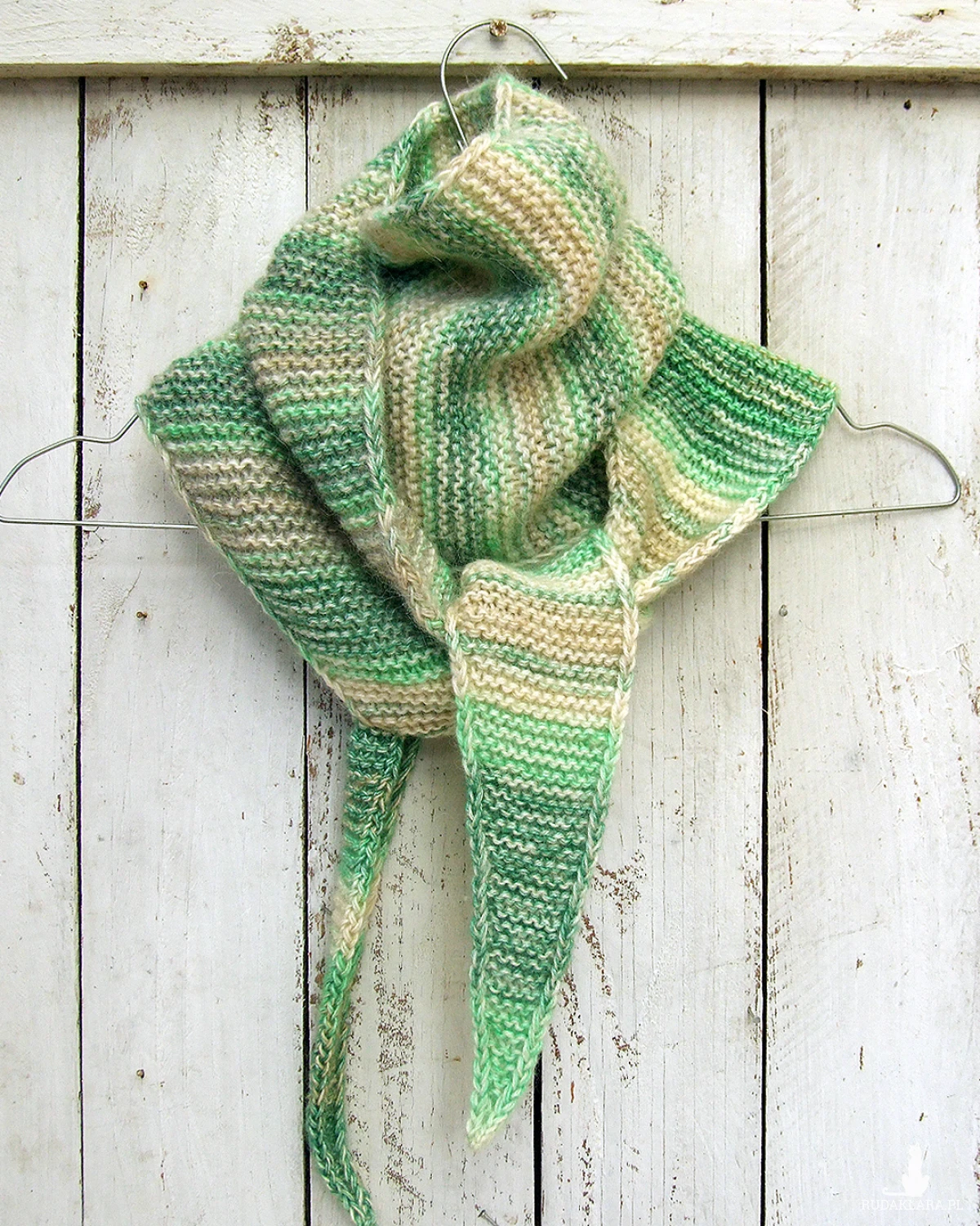 Kolory: włóczka cieniowana od jasnej do ciemnej zieleni, waniliowy i trochę jasnej szarości.