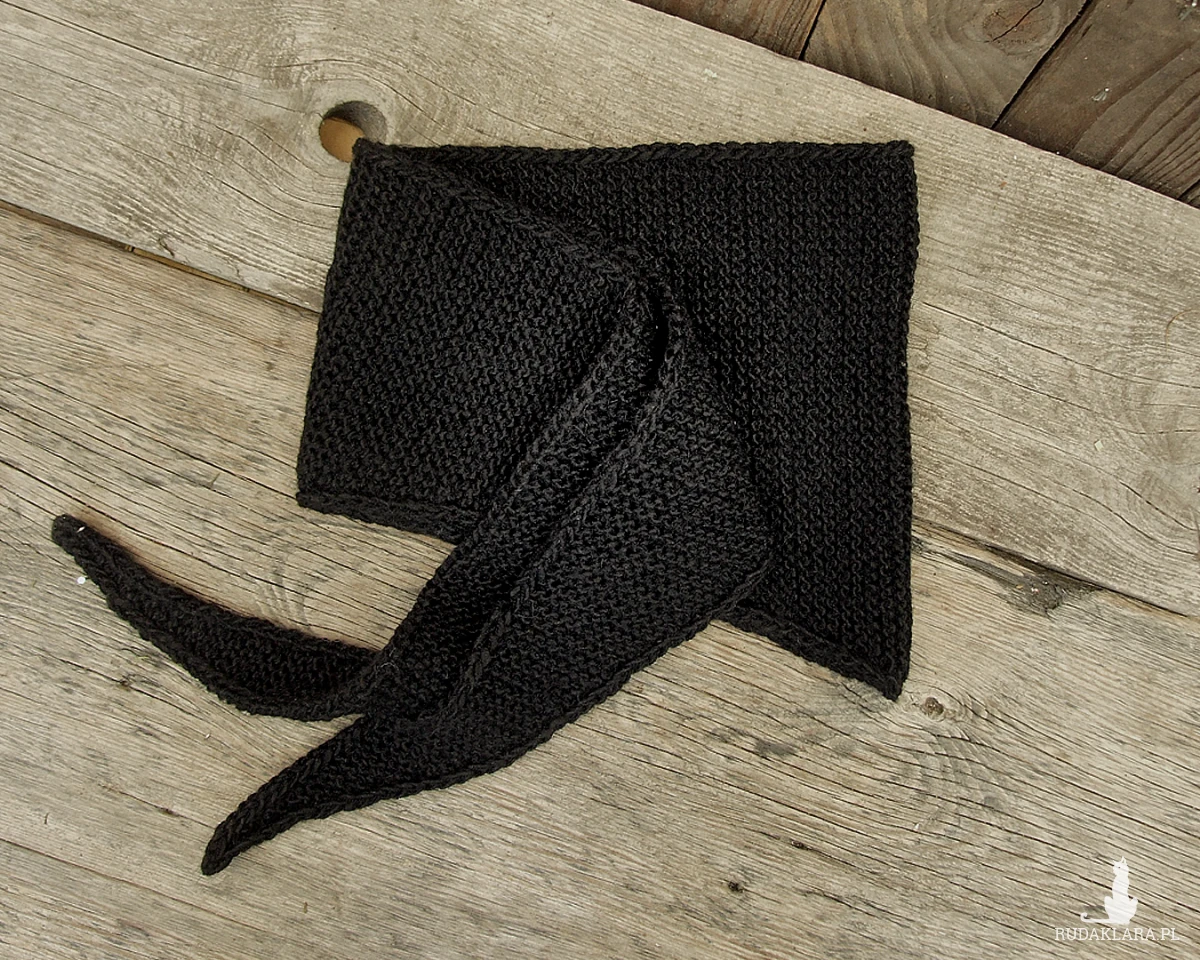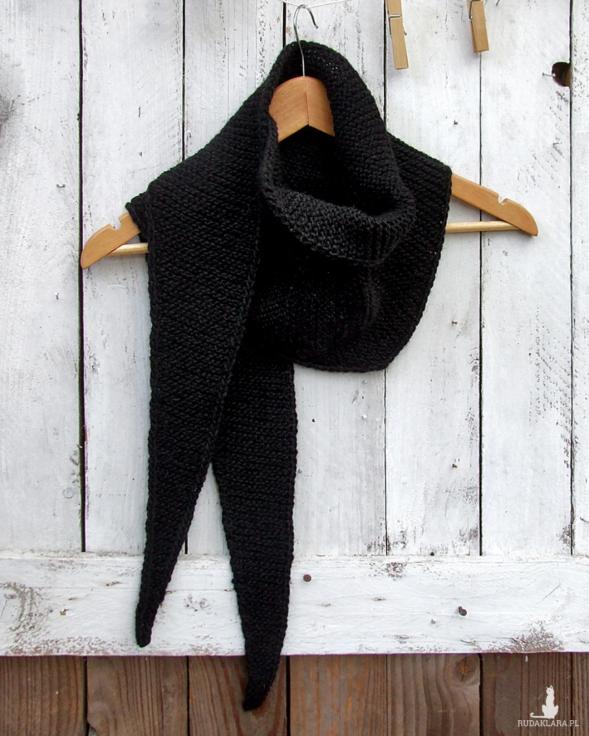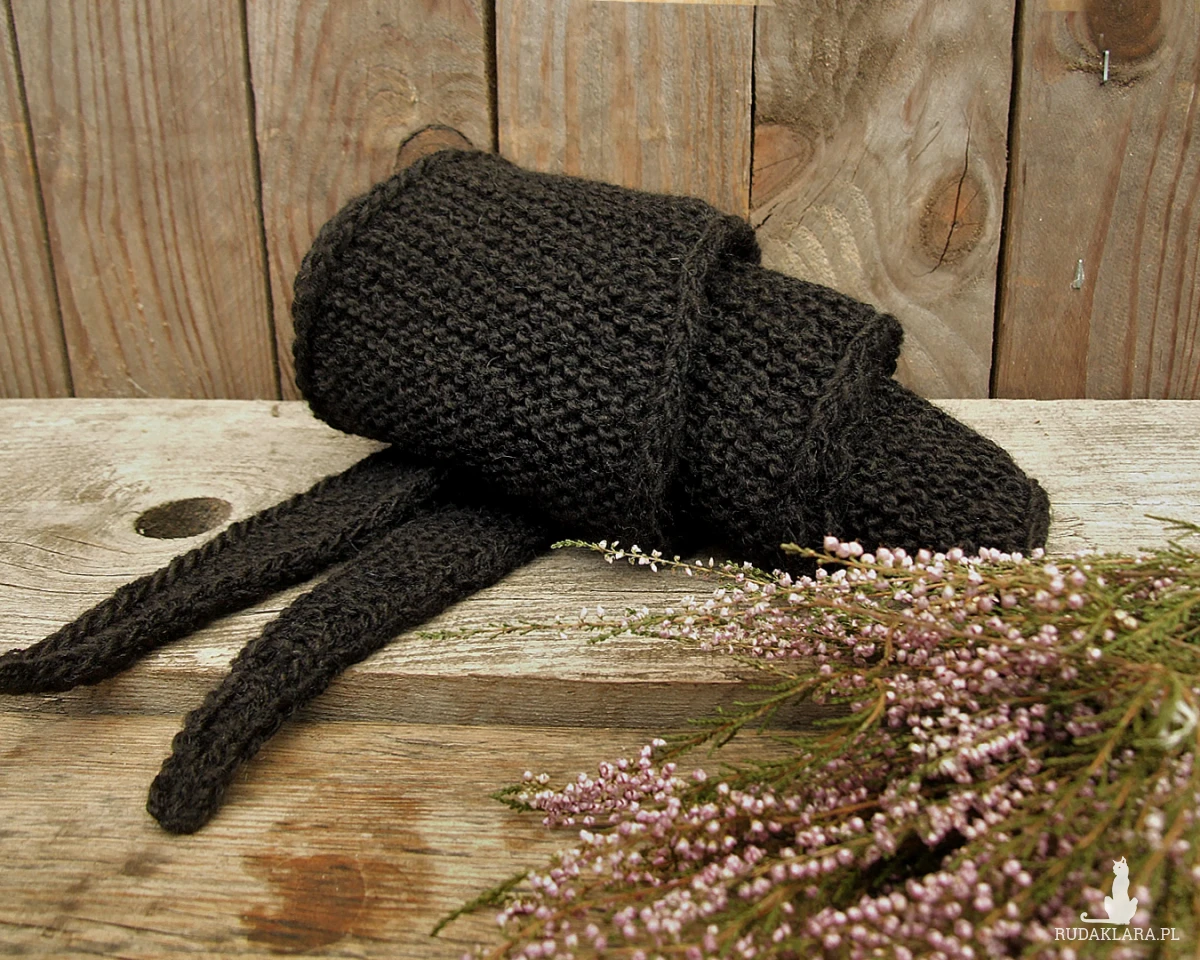 Czarny, wełniany szalik wykonany ręcznie na drutach. Miękki, z grubszą fakturą i delikatnym krótkim włoskiem. Alternatywa dla dużych szali i chust, która bardzo dobrze chroni przed zimnem i oryginalnie wygląda.