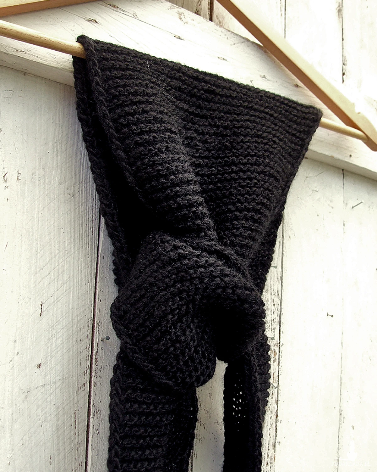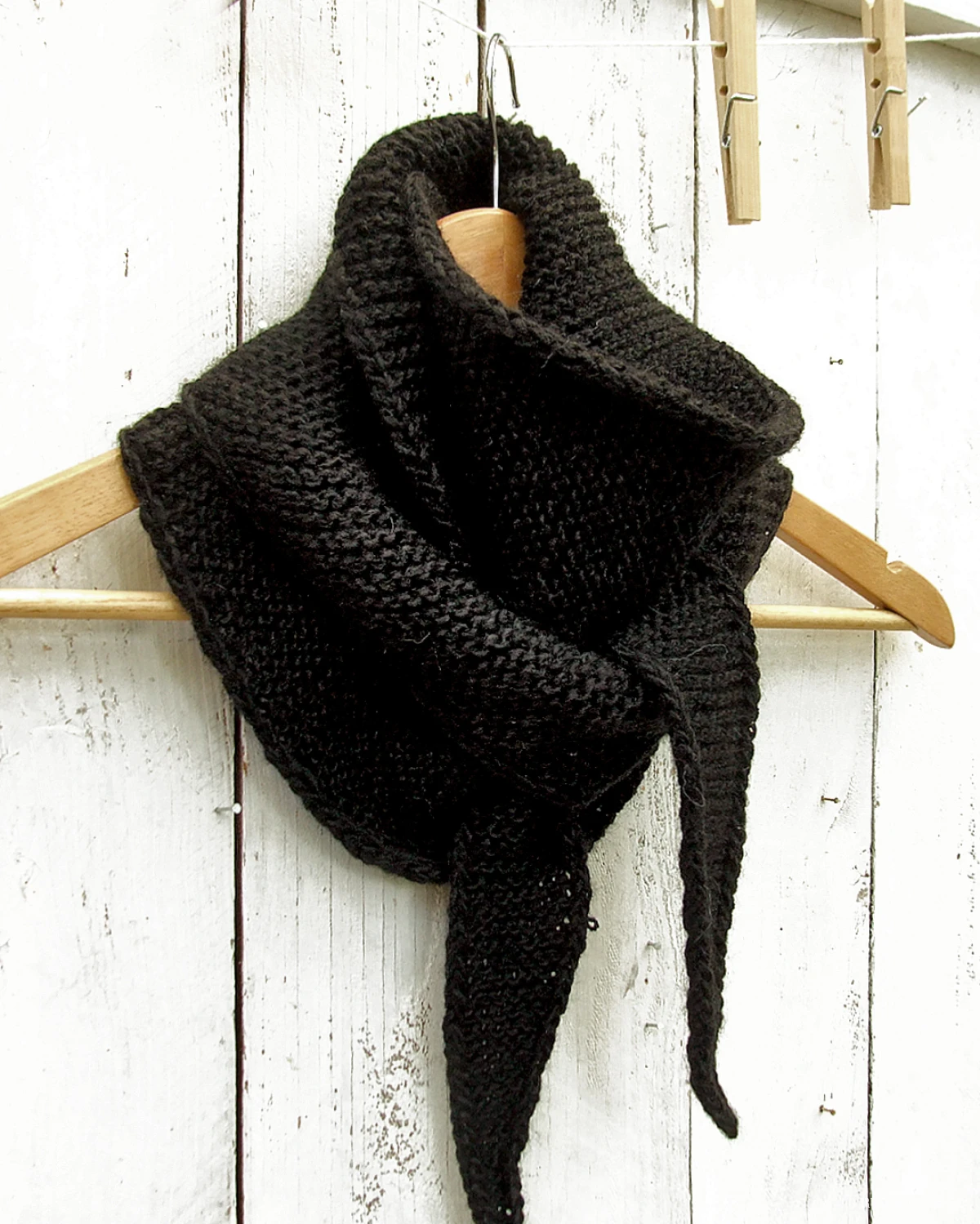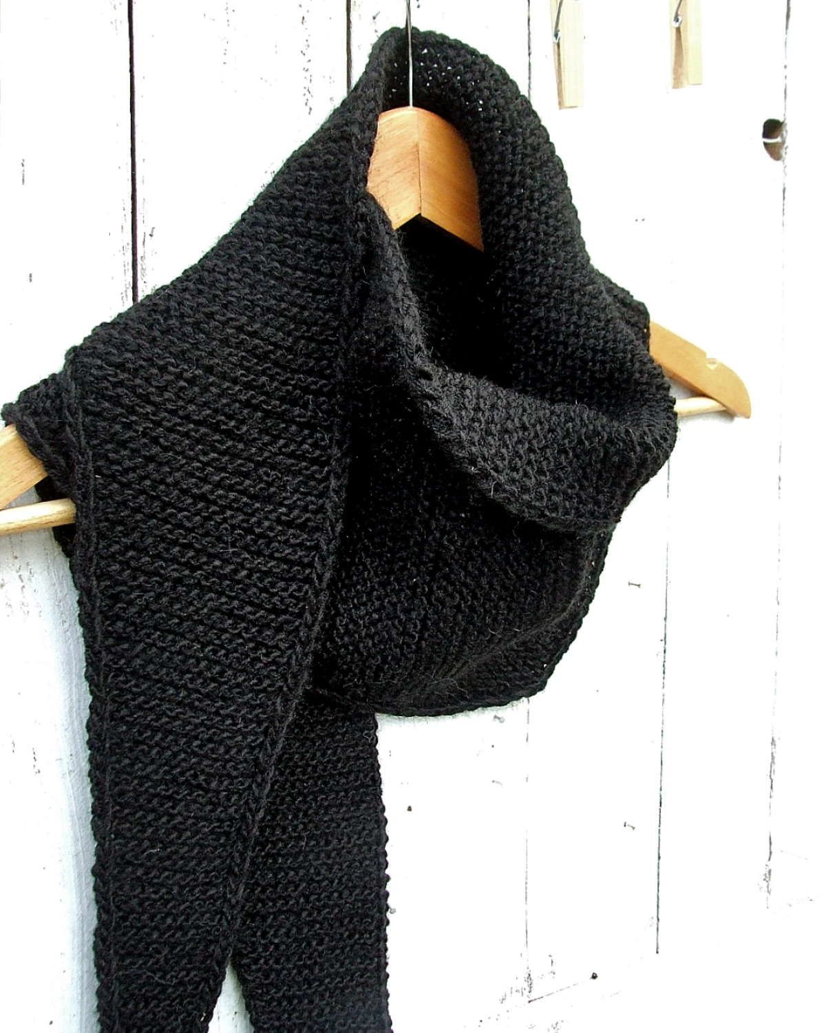 Czarny, wełniany szalik wykonany ręcznie na drutach. Miękki, z grubszą fakturą i delikatnym krótkim włoskiem. Alternatywa dla dużych szali i chust, która bardzo dobrze chroni przed zimnem i oryginalnie wygląda.
