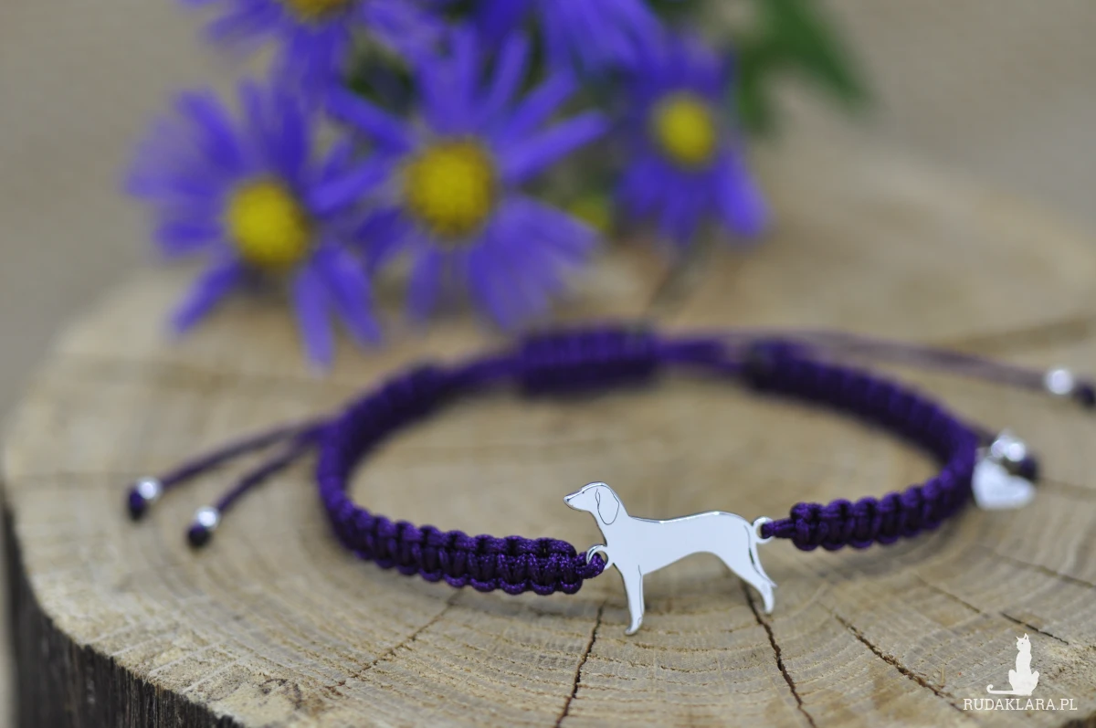 Gończy wykonany ze srebrnej blachy próby 925, wymiary pieska: 19,4 x 15 mm, grubość 0,8 mm oraz srebrne kulki.