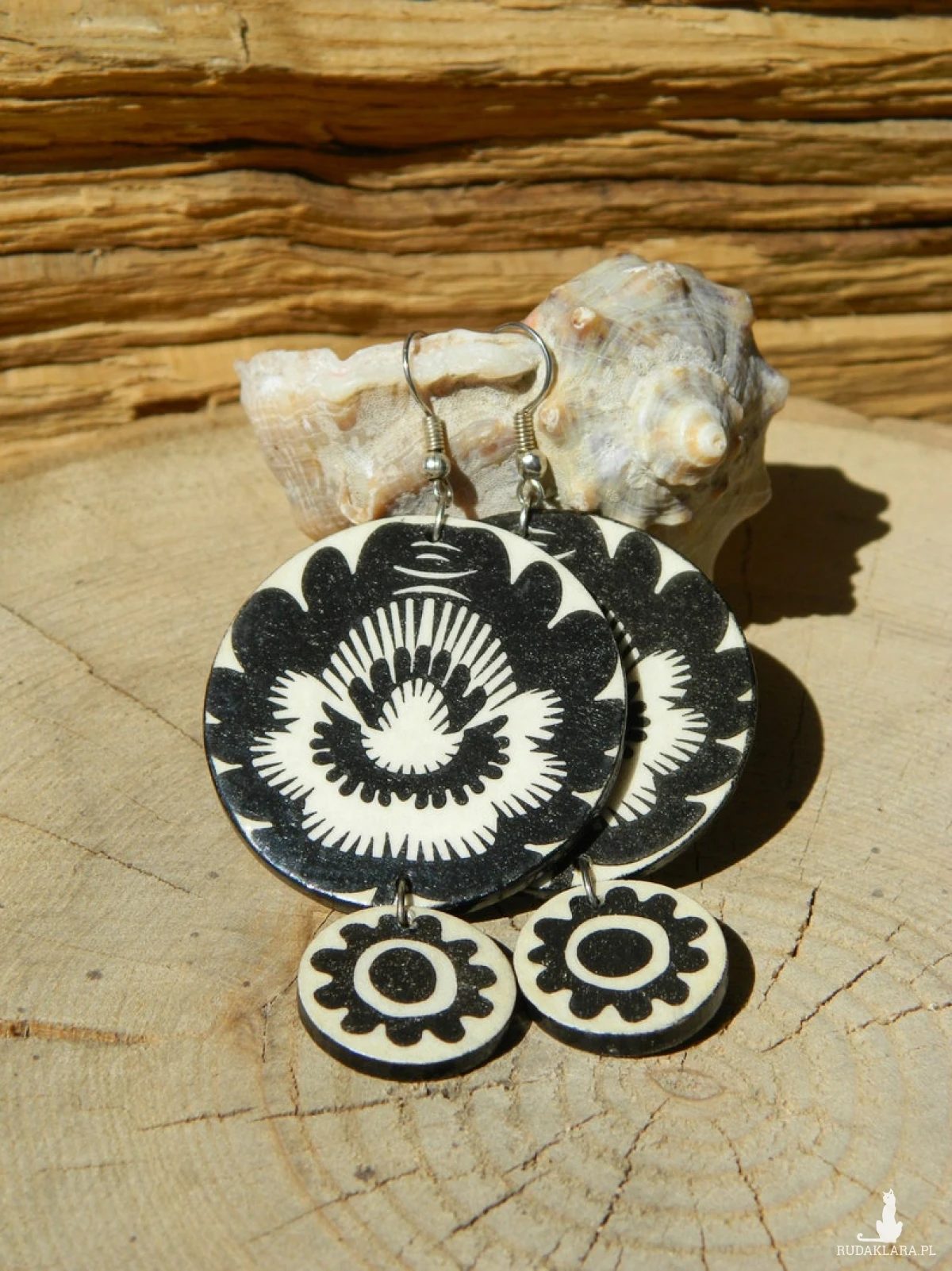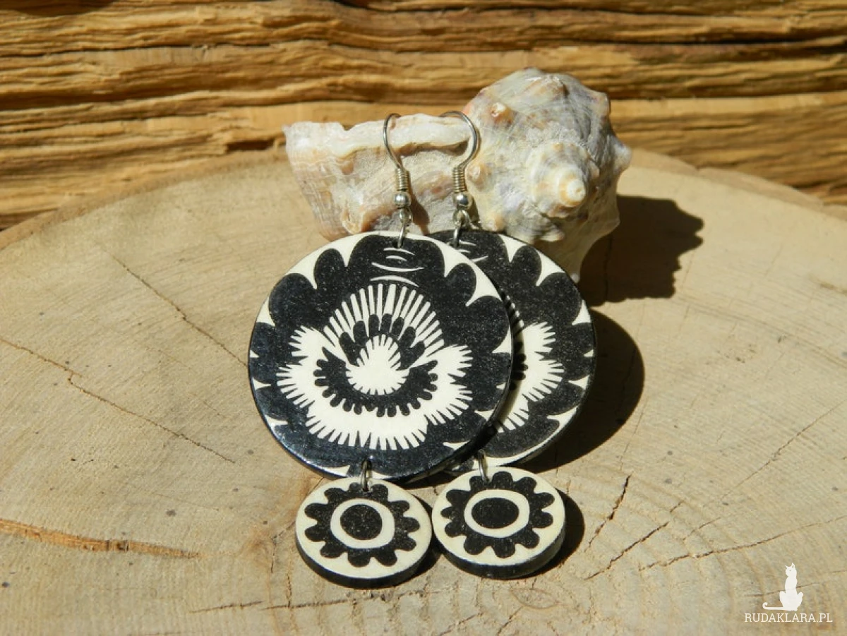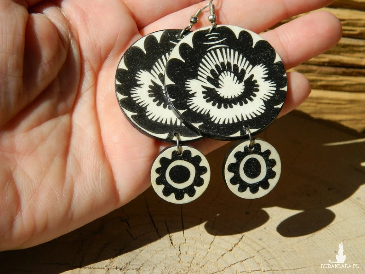 Folkowe czarno - białe lekkie kolczyki z drewna, monochromatyczna biżuteria do czarnej sukienki, prezent urodzinowy dla córki