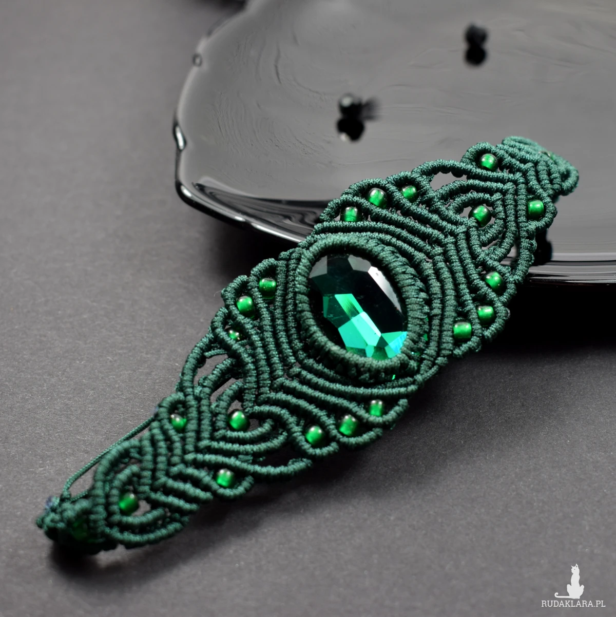 zieleni. W centrum kompozycji znajduje się szmaragdowy kryształ, który