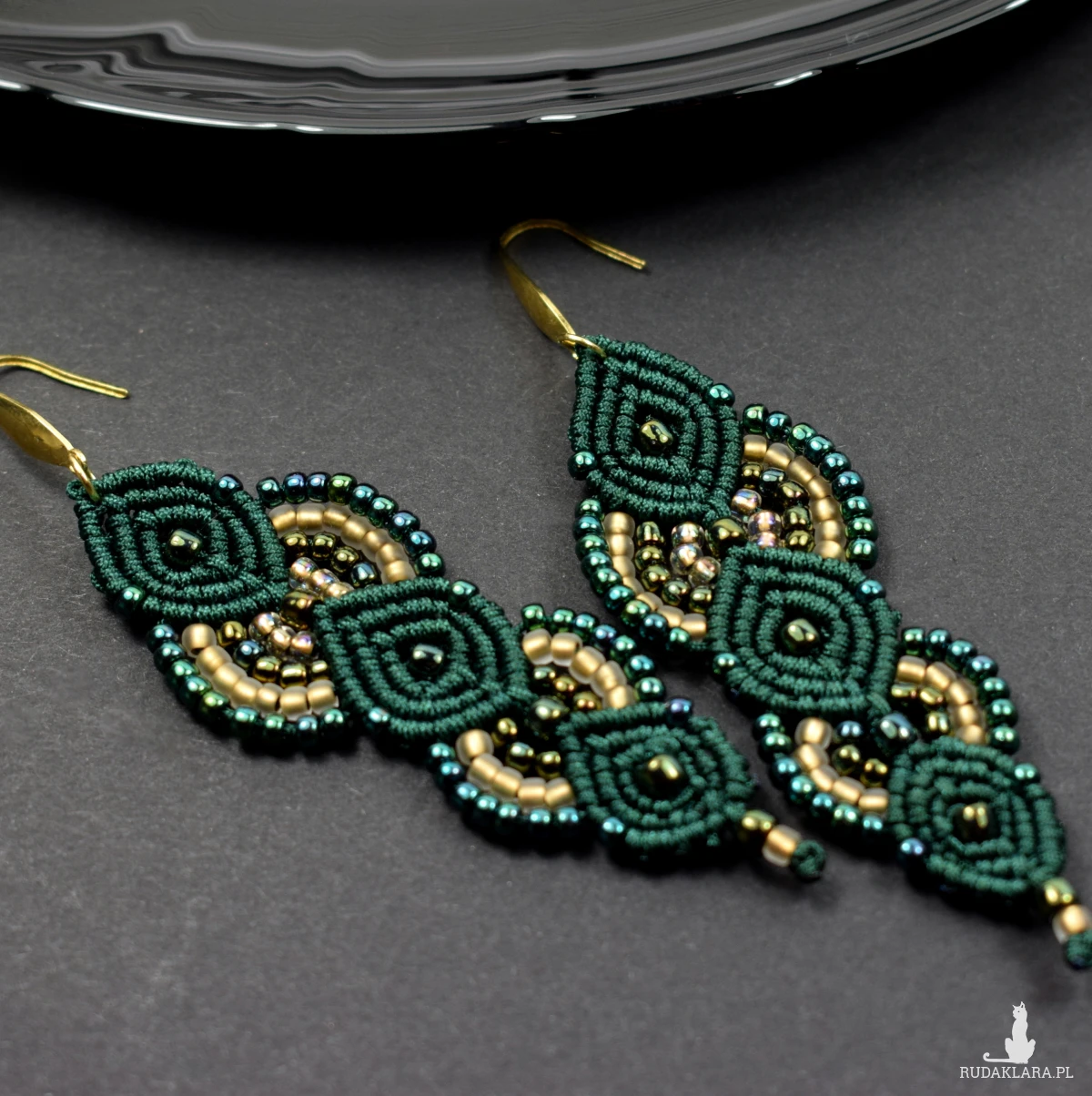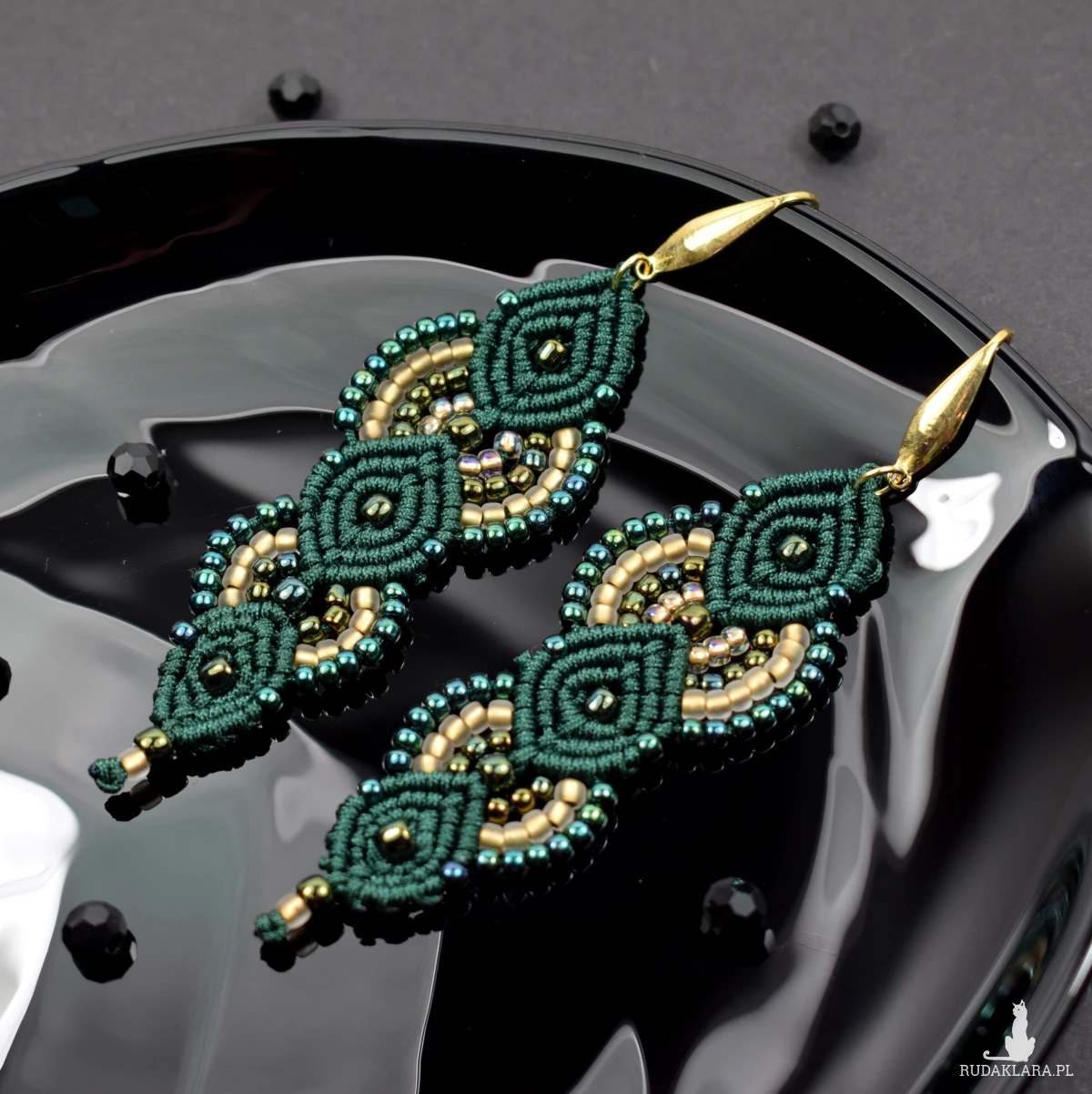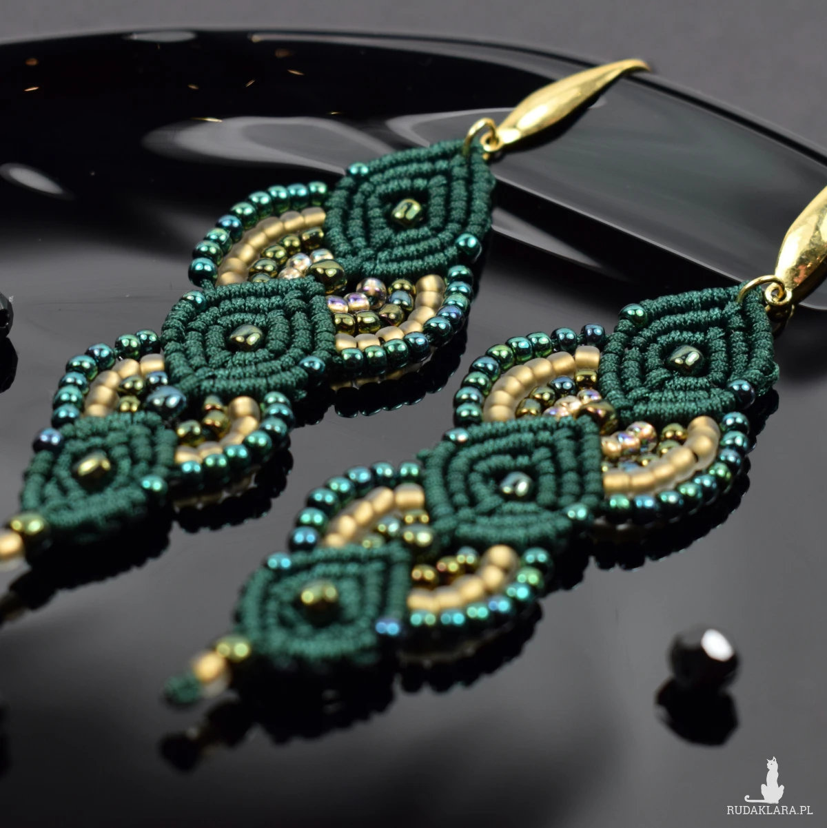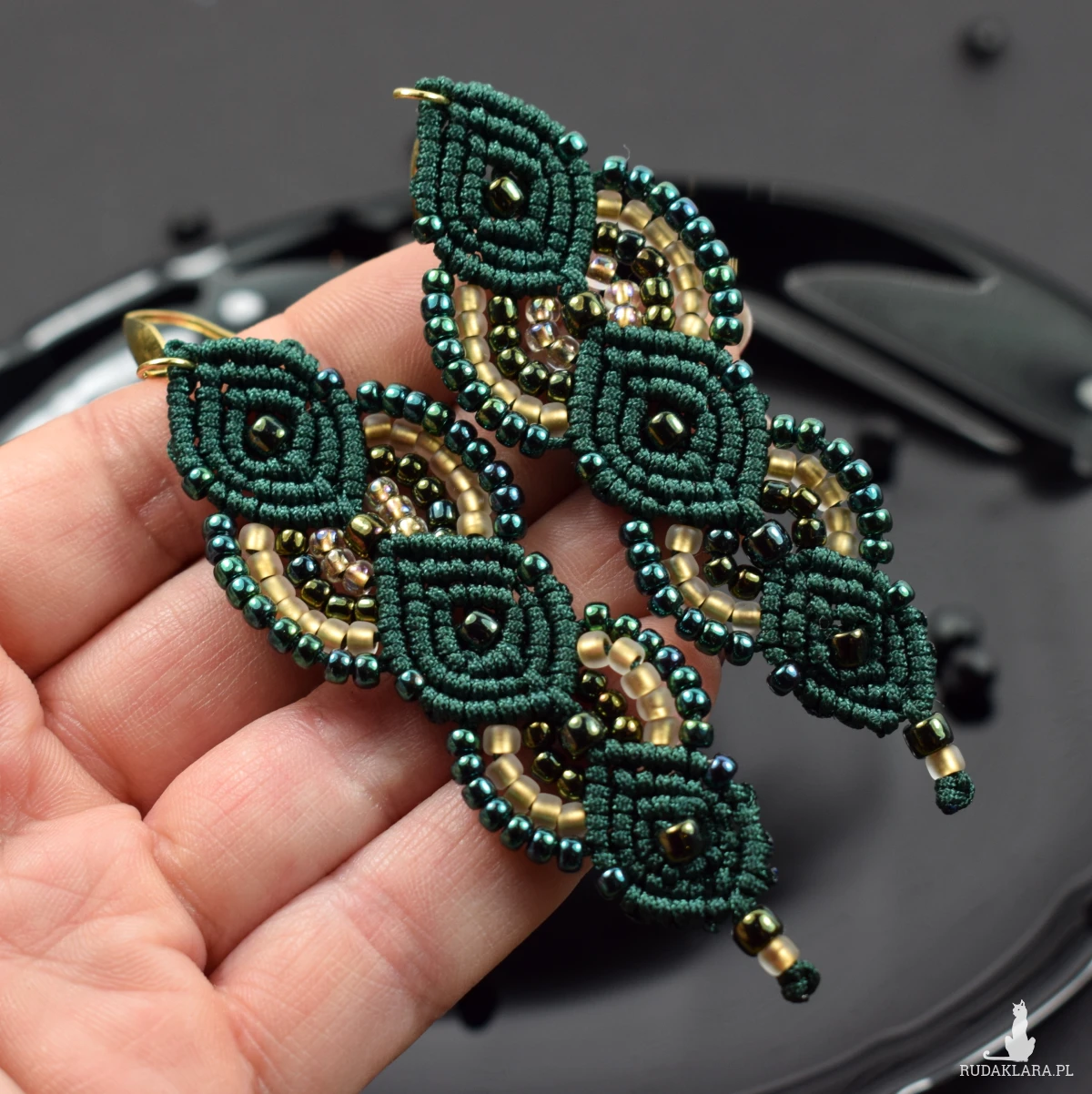Ręcznie wykonane kolczyki stworzone techniką makramy z profesjonalnego sznurka w głębokim, butelkowym odcieniu zieleni. Ozdobione drobnymi koralikami w tonacjach złota, szmaragdu i zieleni, które pięknie odbijają światło, nadając im subtelnego blasku i elegancji.