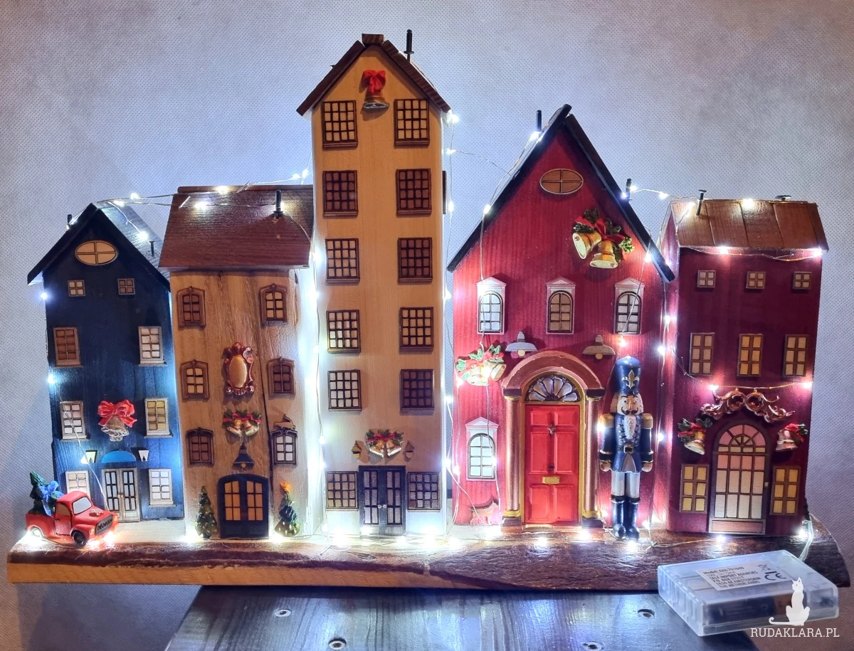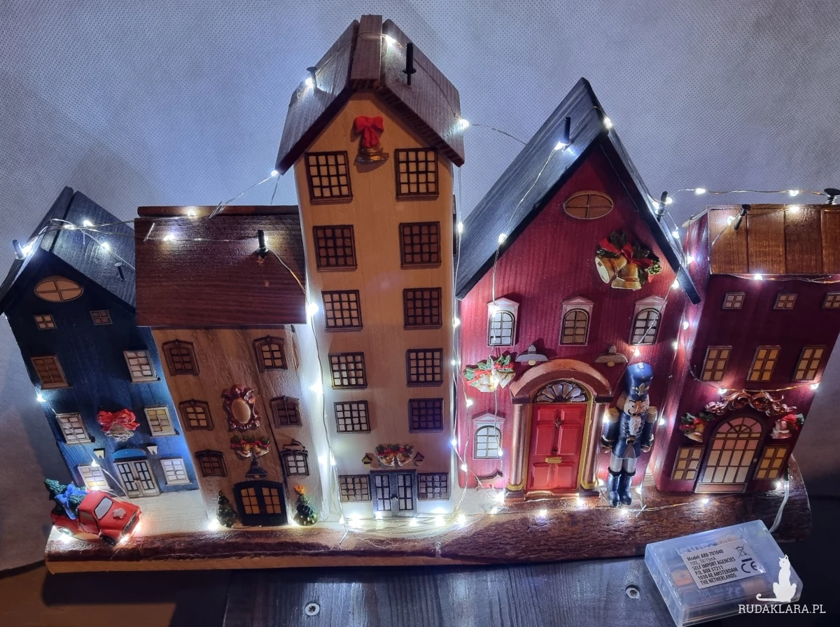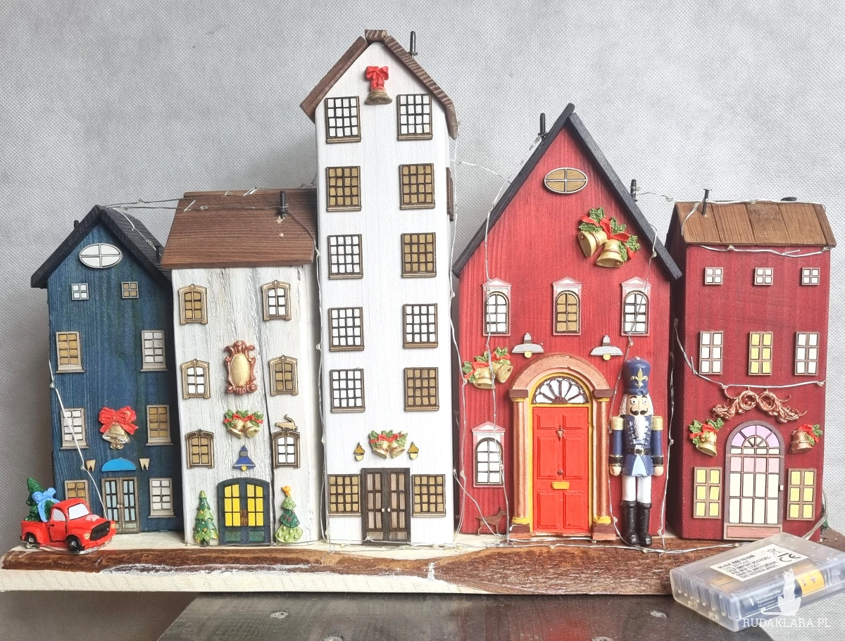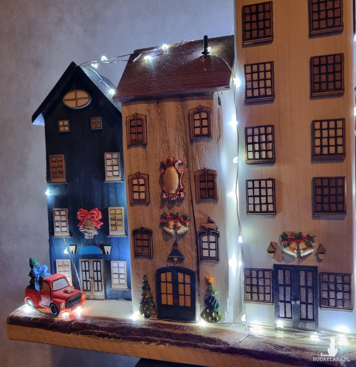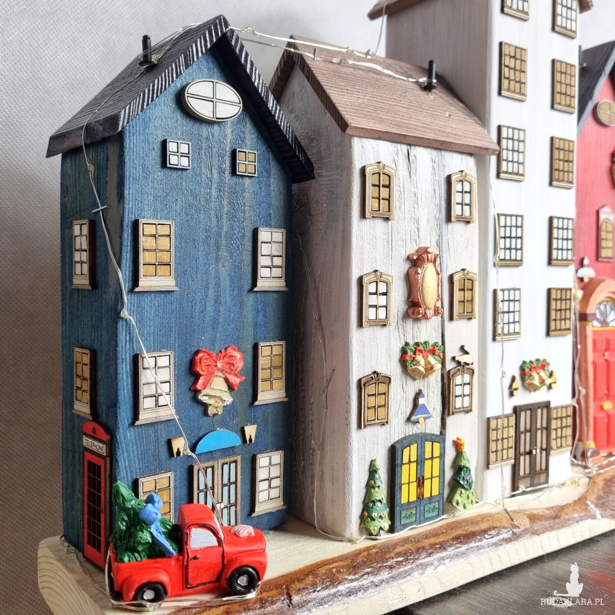 Świąteczna ozdoba, świecące miasteczko. Domki wykonane desek ze starych palet z odzysku. Drewno bejcowane, woskowane, malowane w różnych odcieniach - ładnie podkreślające starość drewna - malowane bezbarwną farbą akrylową. Drewniane, wycinane okna i drzwi, również inne detale świąteczne z gipsu. Długość 48 cm, wysokość 38 cm, grubość 9 cm. (6)