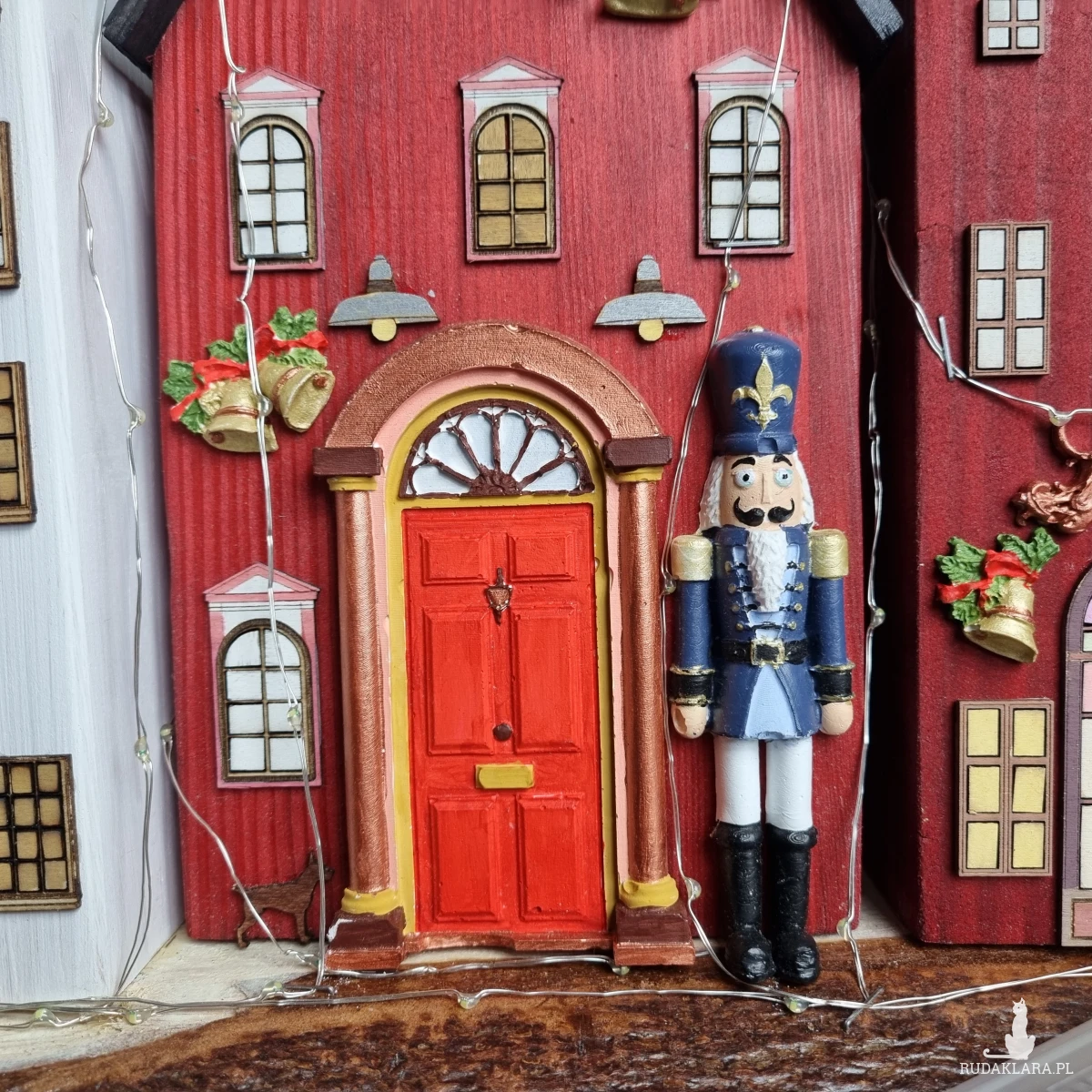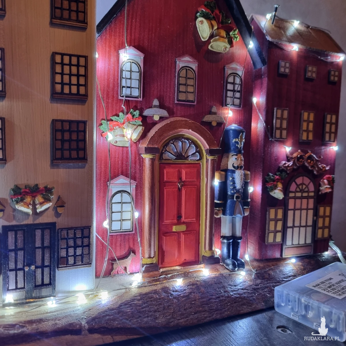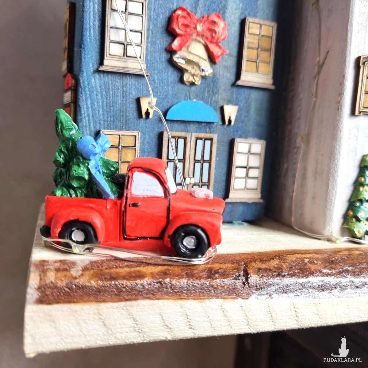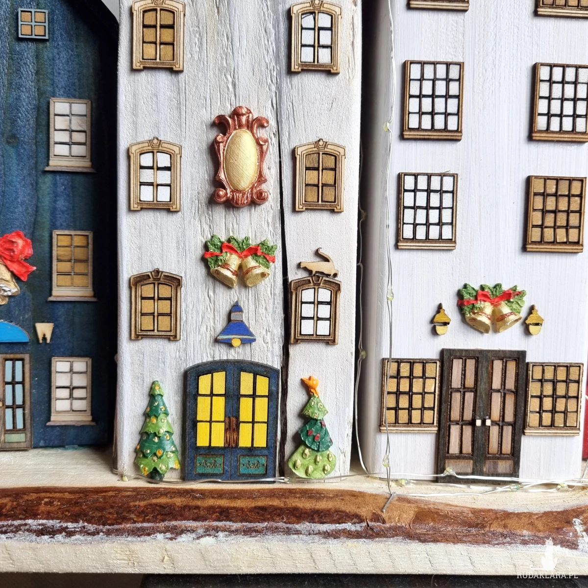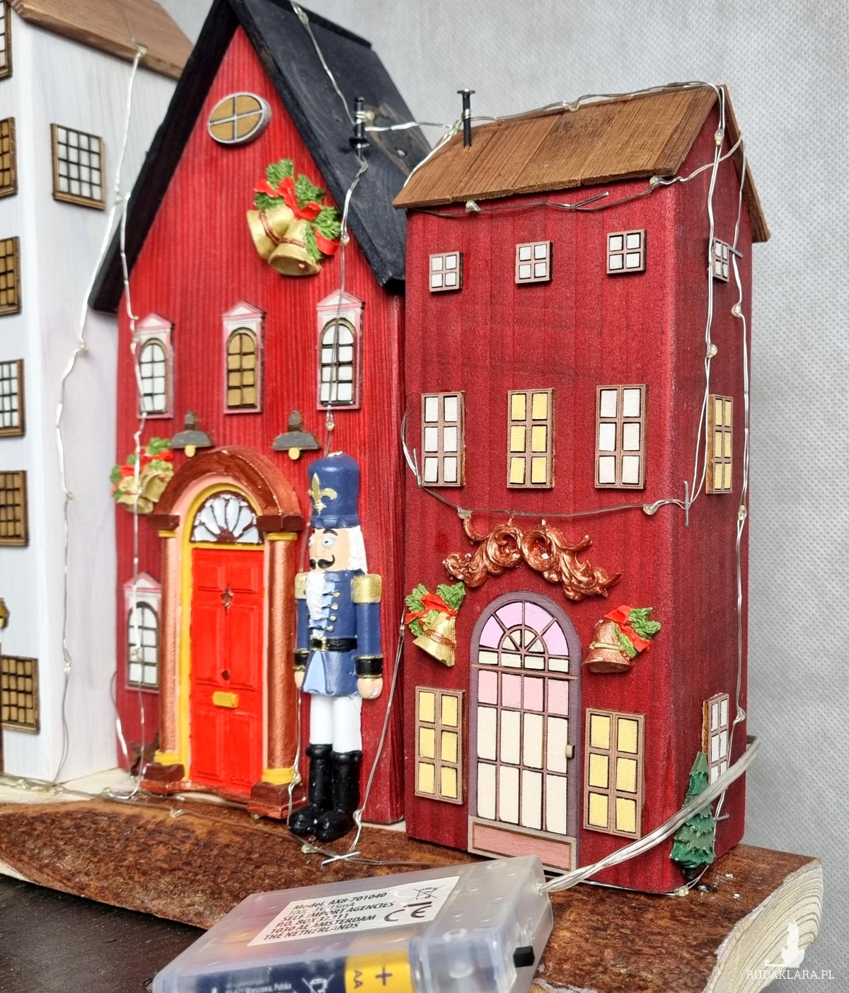 Świąteczna ozdoba, świecące miasteczko. Domki wykonane desek ze starych palet z odzysku. Drewno bejcowane, woskowane, malowane w różnych odcieniach - ładnie podkreślające starość drewna - malowane bezbarwną farbą akrylową. Drewniane, wycinane okna i drzwi, również inne detale świąteczne z gipsu. Długość 48 cm, wysokość 38 cm, grubość 9 cm. (6)