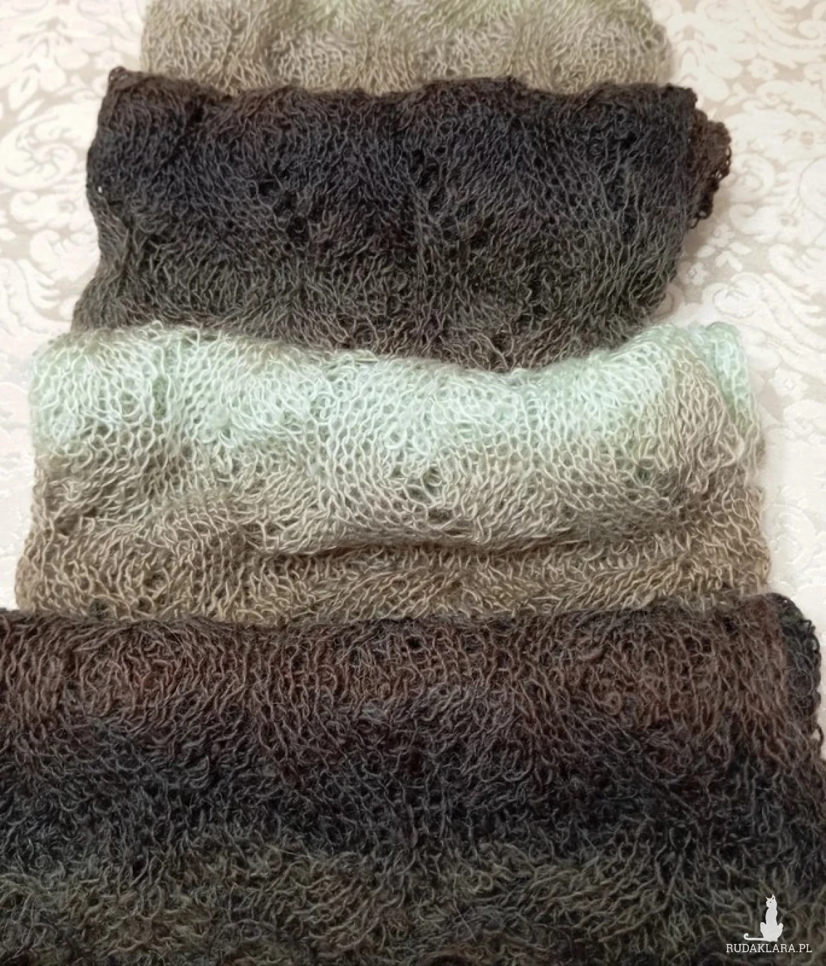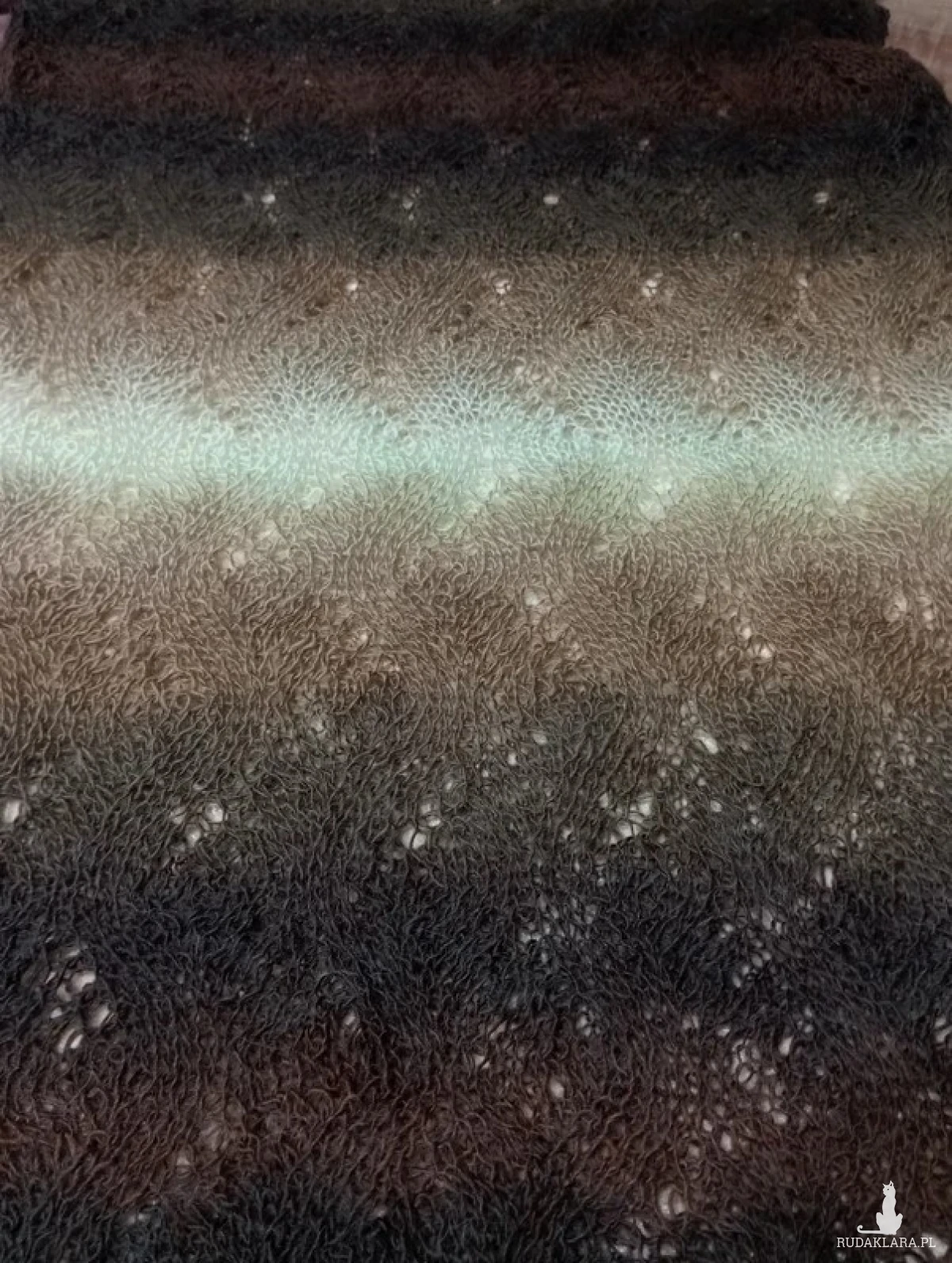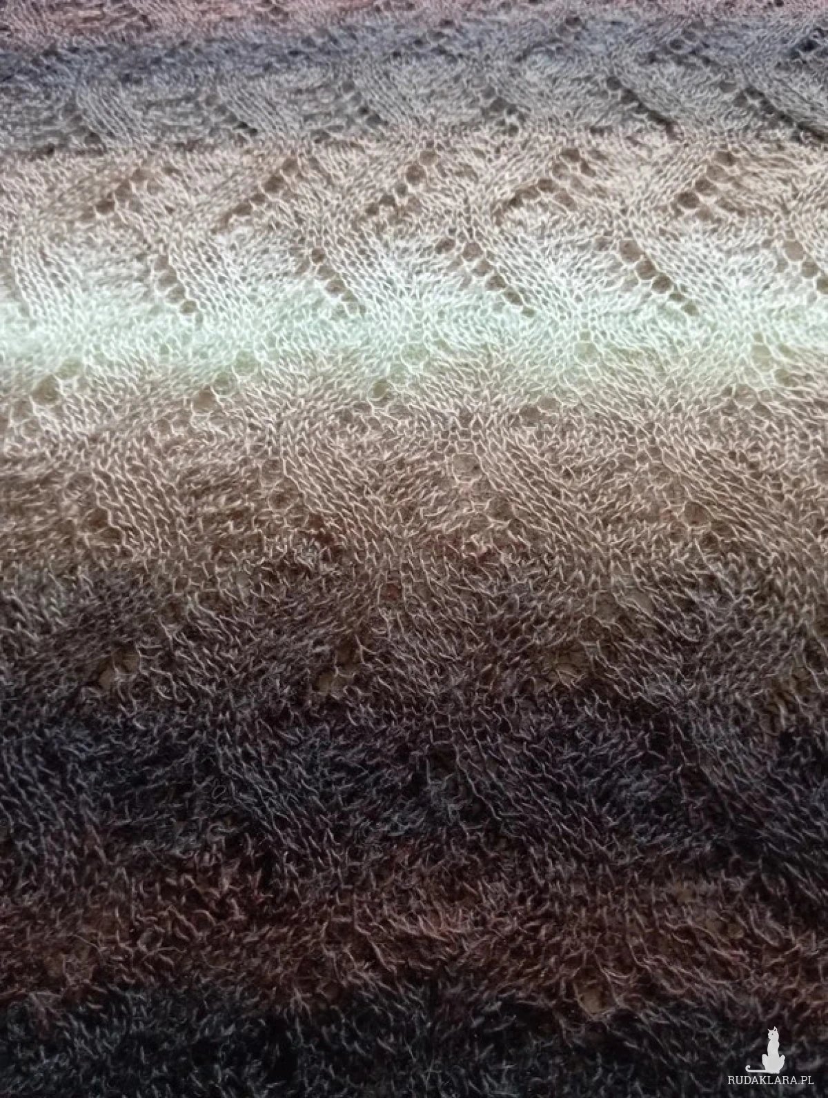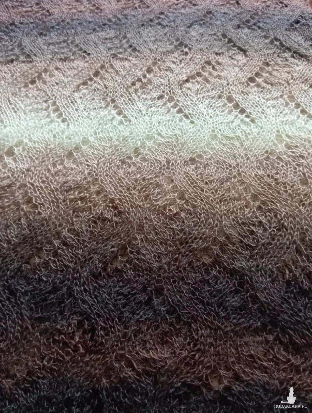 Ażurowy cieniowany szal robiony na drutach (odcienie beżu i brązu), rękodzieło. Wymiary: 70 cm x 200 cm. Szal zrobiony z mięciutkiej, ciepłej niegryzącej włóczki, wełna z akrylem.