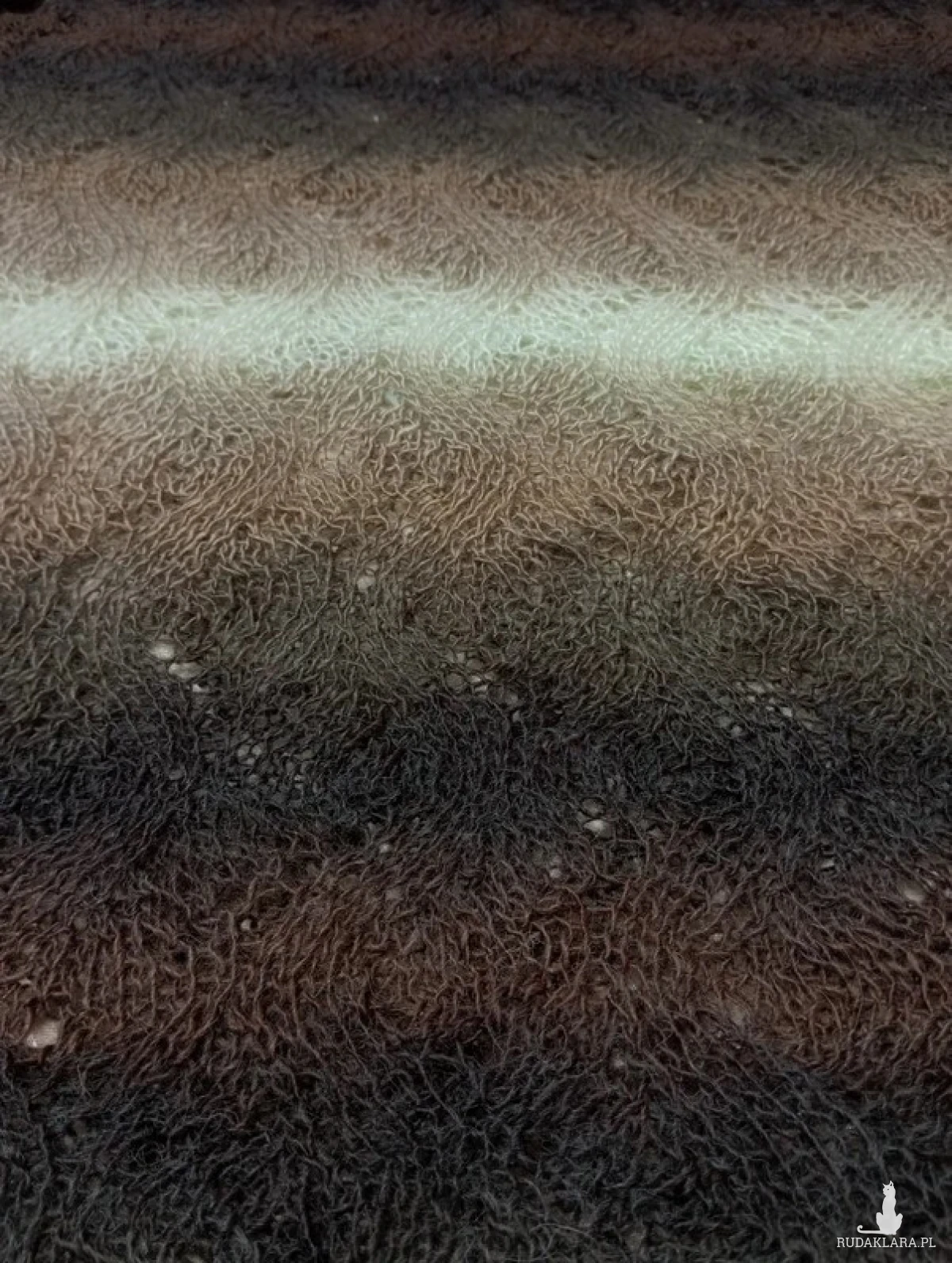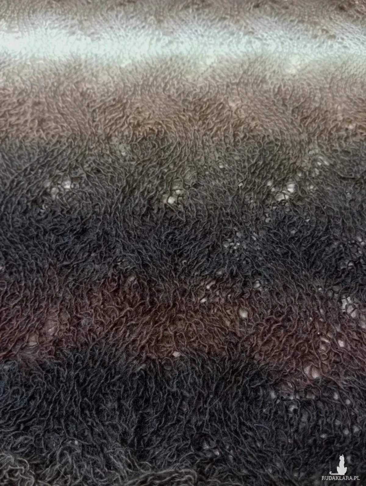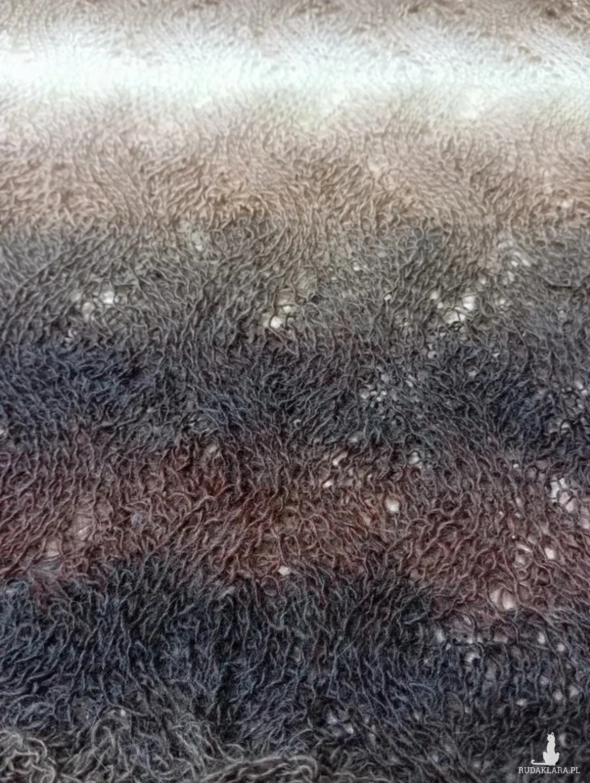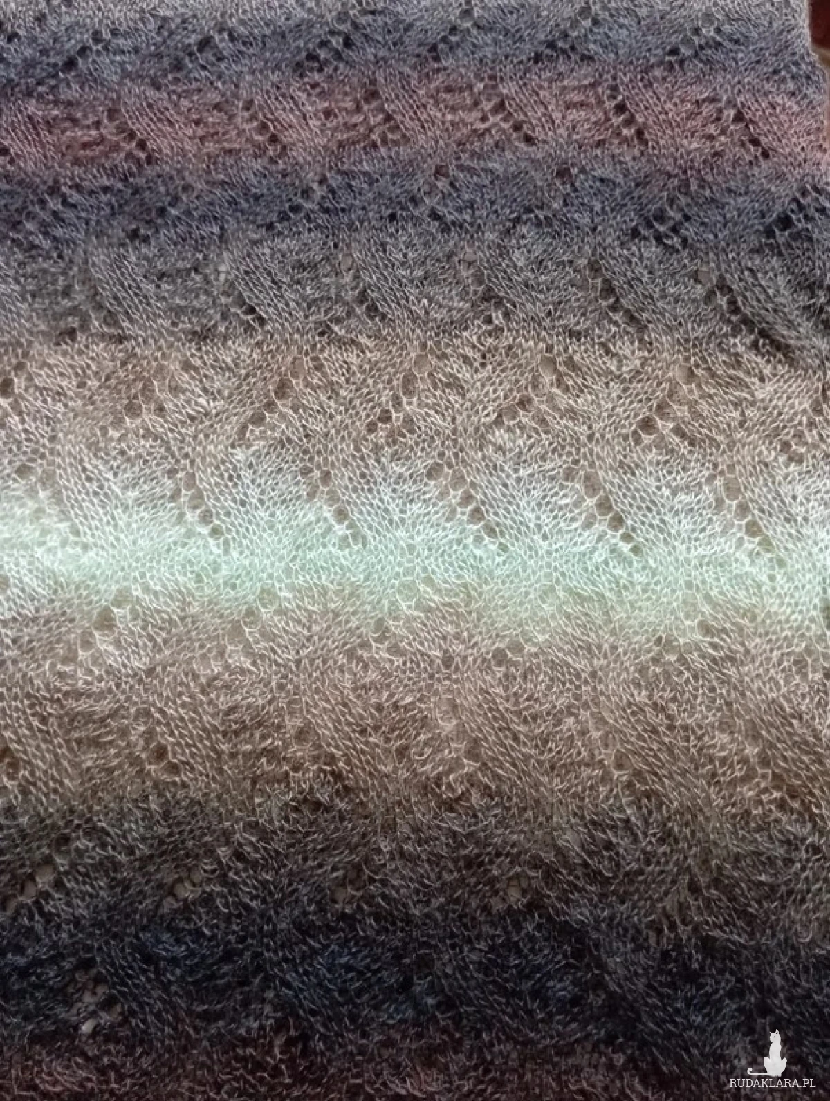 Ażurowy cieniowany szal robiony na drutach (odcienie beżu i brązu), rękodzieło. Wymiary: 70 cm x 200 cm. Szal zrobiony z mięciutkiej, ciepłej niegryzącej włóczki, wełna z akrylem.