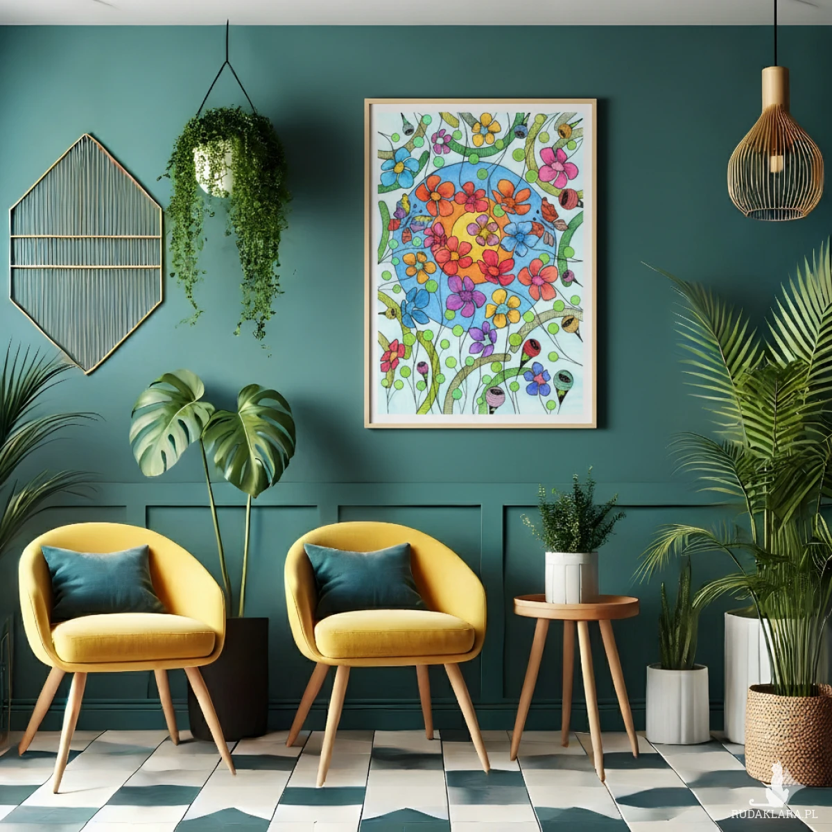 Centralne koło, płynnie przechodzące od gorącej pomarańczy do chłodnego błękitu, działa jak źródło energii. Symbolizuje ono pełnię i cykliczność życia, otoczoną przez mnóstwo kwiatów — każdy z nich w intensywnym, niemal elektrycznym kolorze.