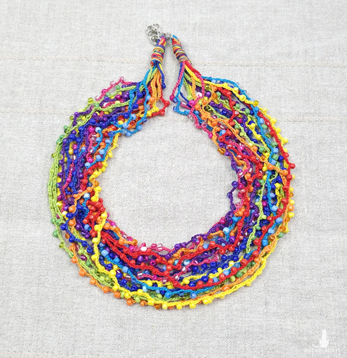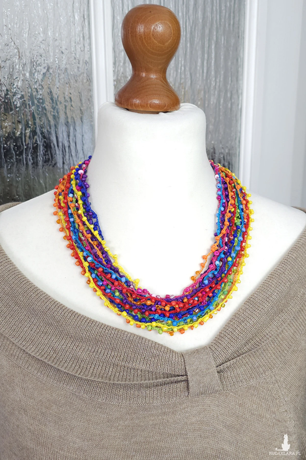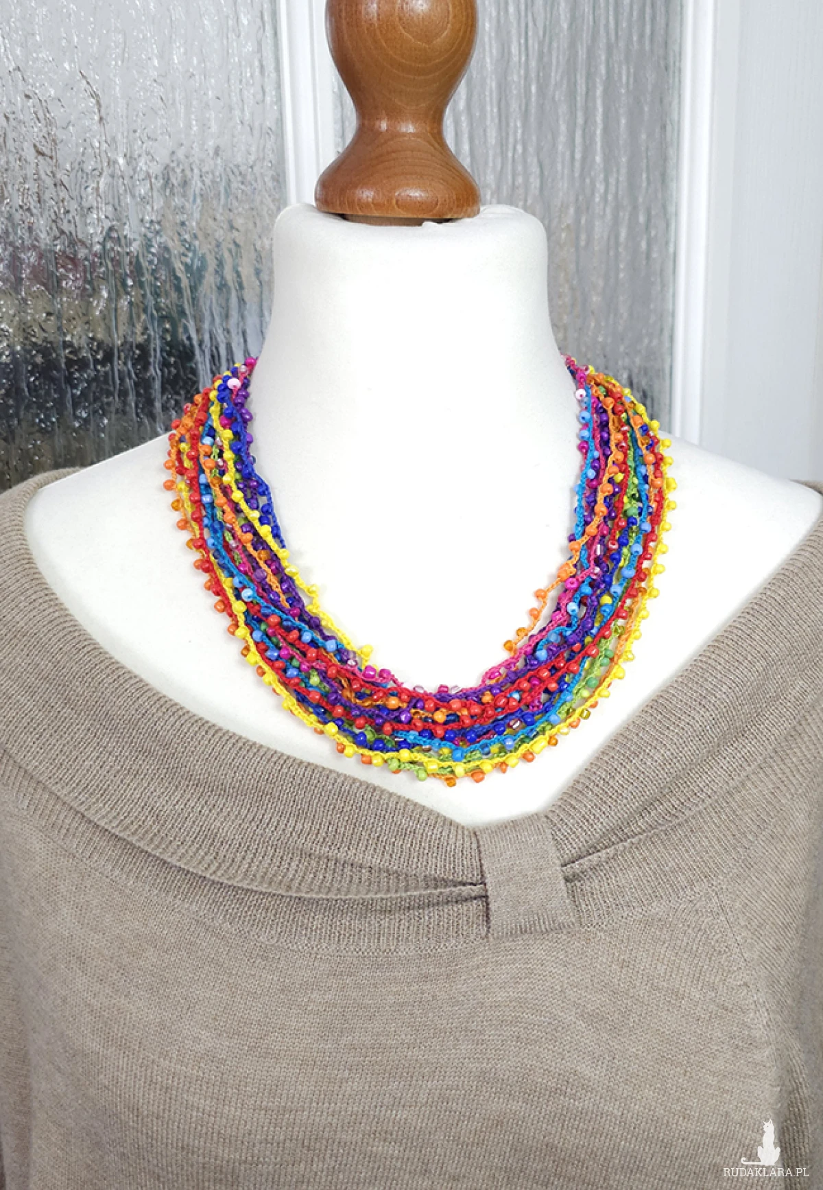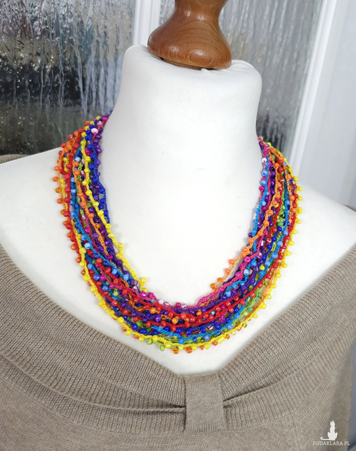 Ręcznie robiony, z 15 cienkich sznurków, które splatają się w barwną, wielowarstwową kompozycję. Każdy sznurek ozdobiony jest drobnymi, szklanymi koralikami o średnicy 3-4 mm, które mienią się w odcieniach tęczy, od soczystej czerwieni, przez pomarańcz, żółty, zielony, aż po głęboki błękit i fiolet.