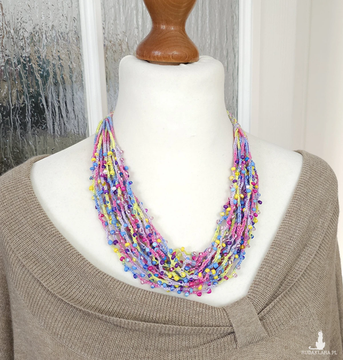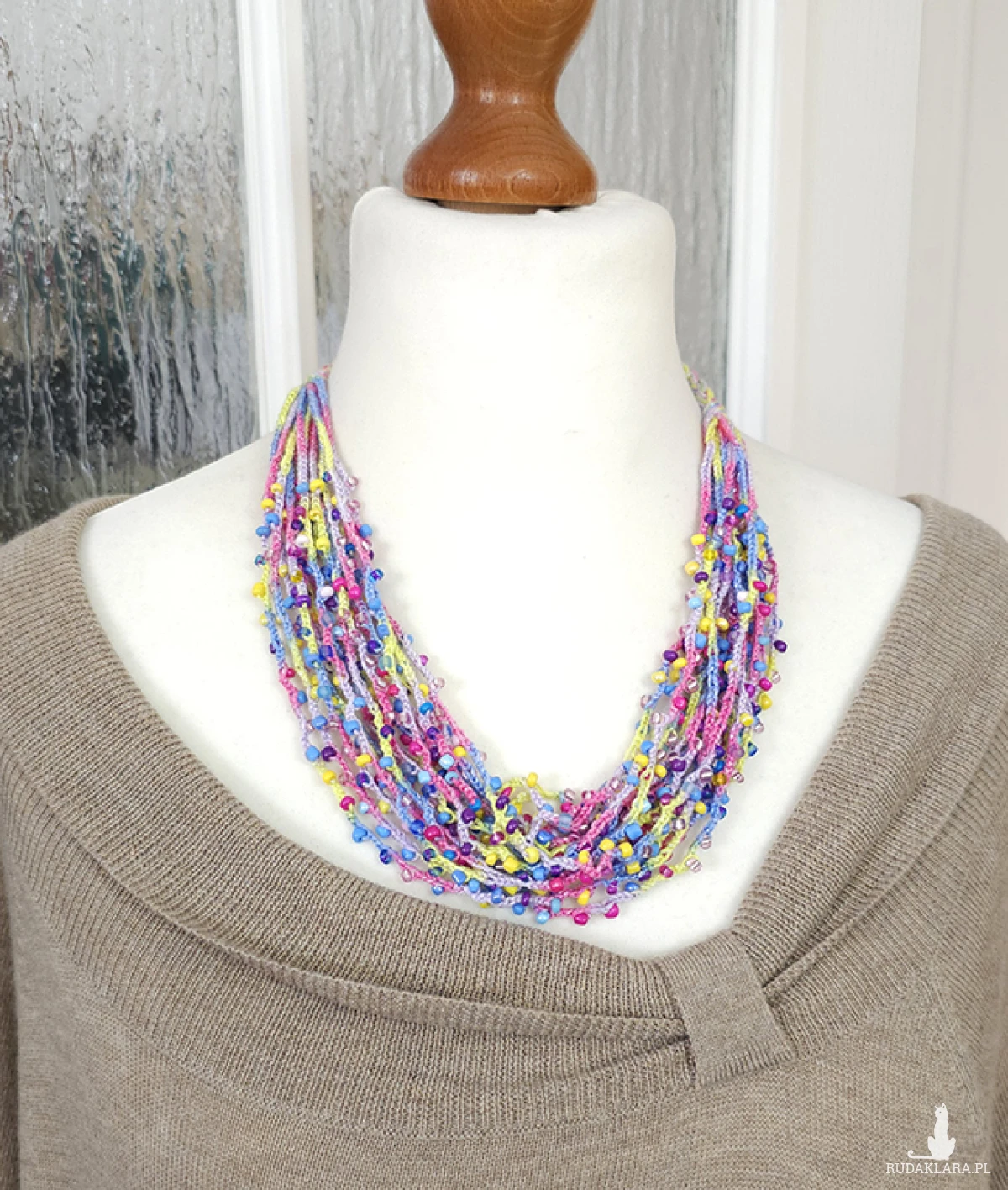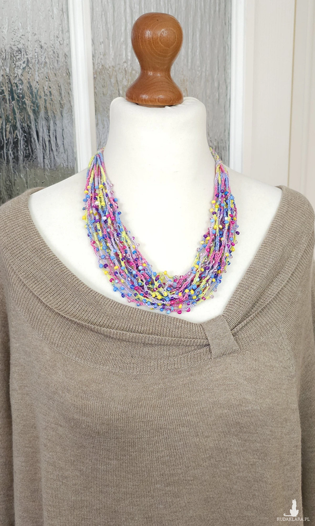 Ten ręcznie wykonany, wielopasmowy naszyjnik zachwyca feerią barw: delikatnym różem, błękitem, żółcią i fioletem.