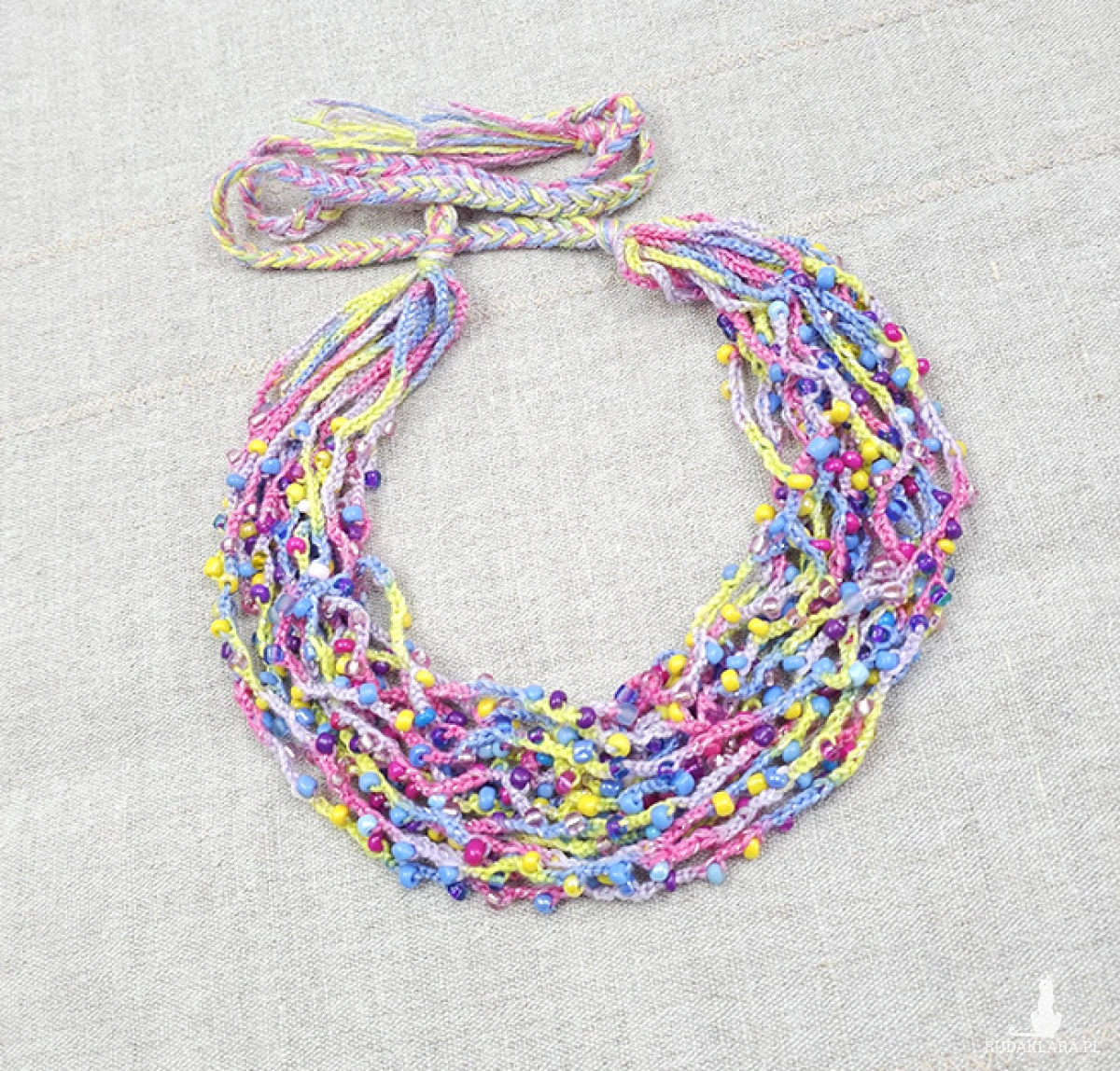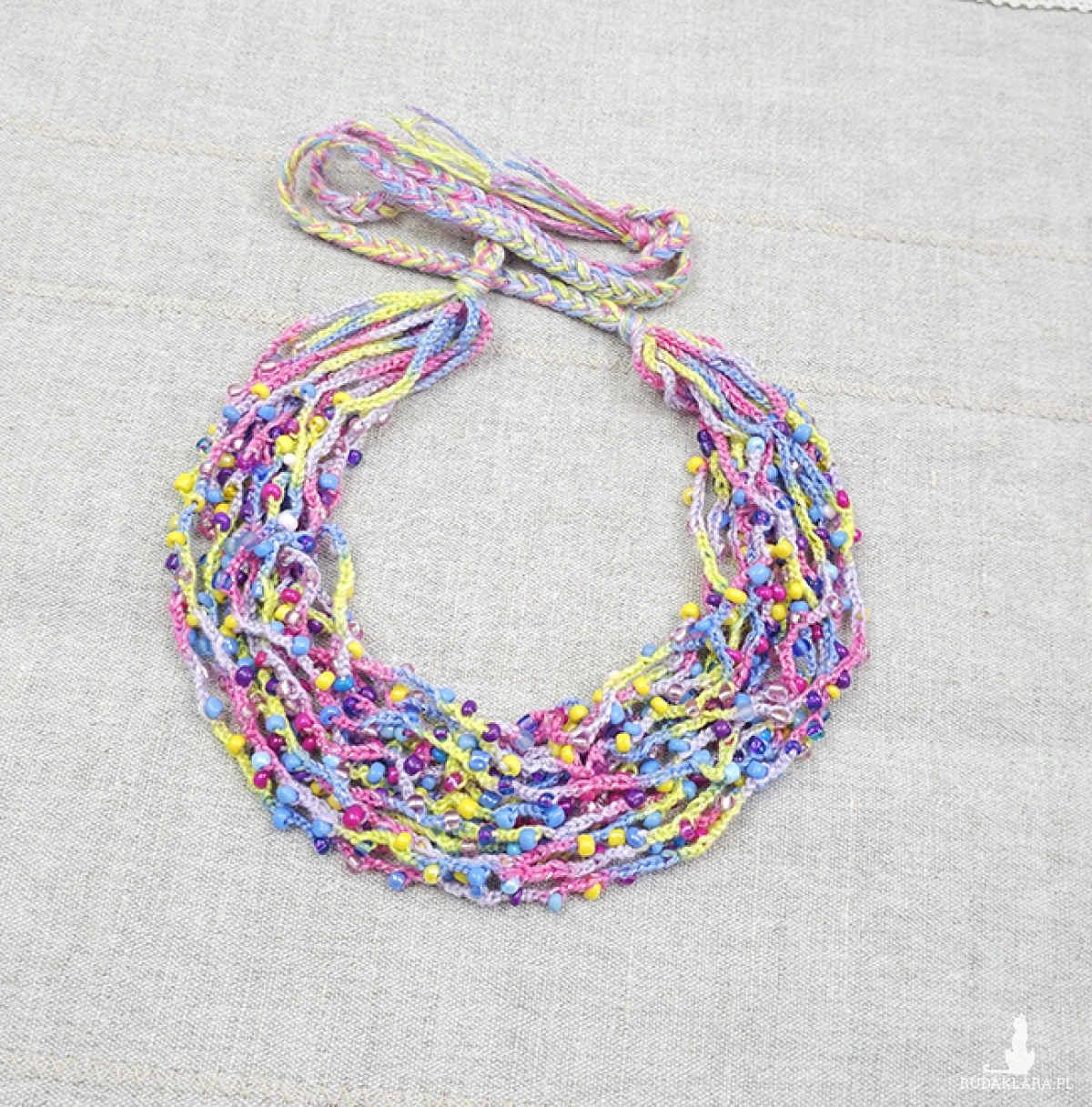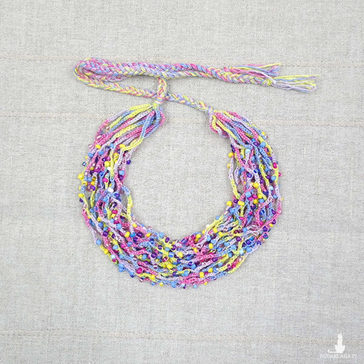 Ten ręcznie wykonany, wielopasmowy naszyjnik zachwyca feerią barw: delikatnym różem, błękitem, żółcią i fioletem.