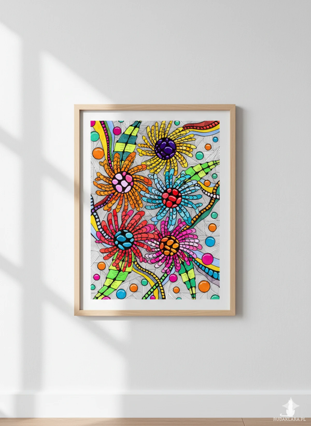Wibrująca, fantastyczna ilustracja przedstawiająca pięć silnie stylizowanych, promienistych kwiatów