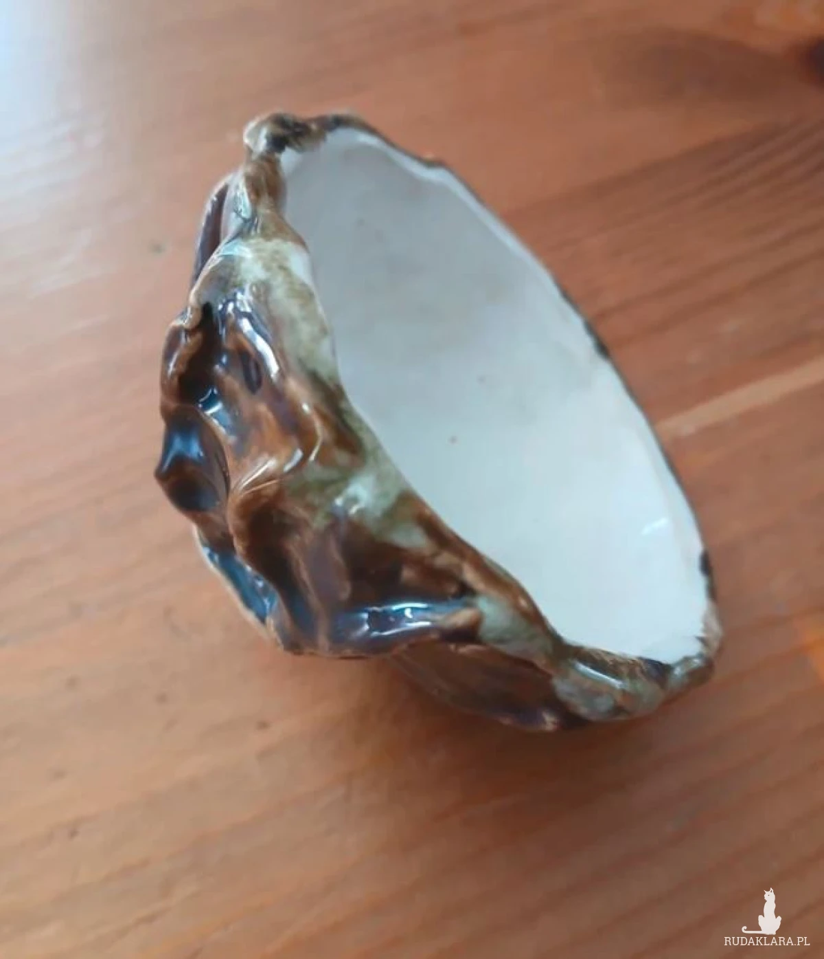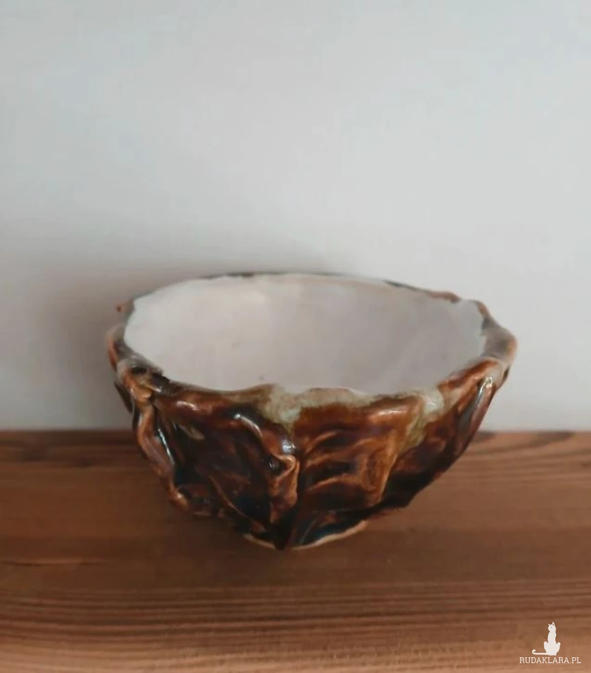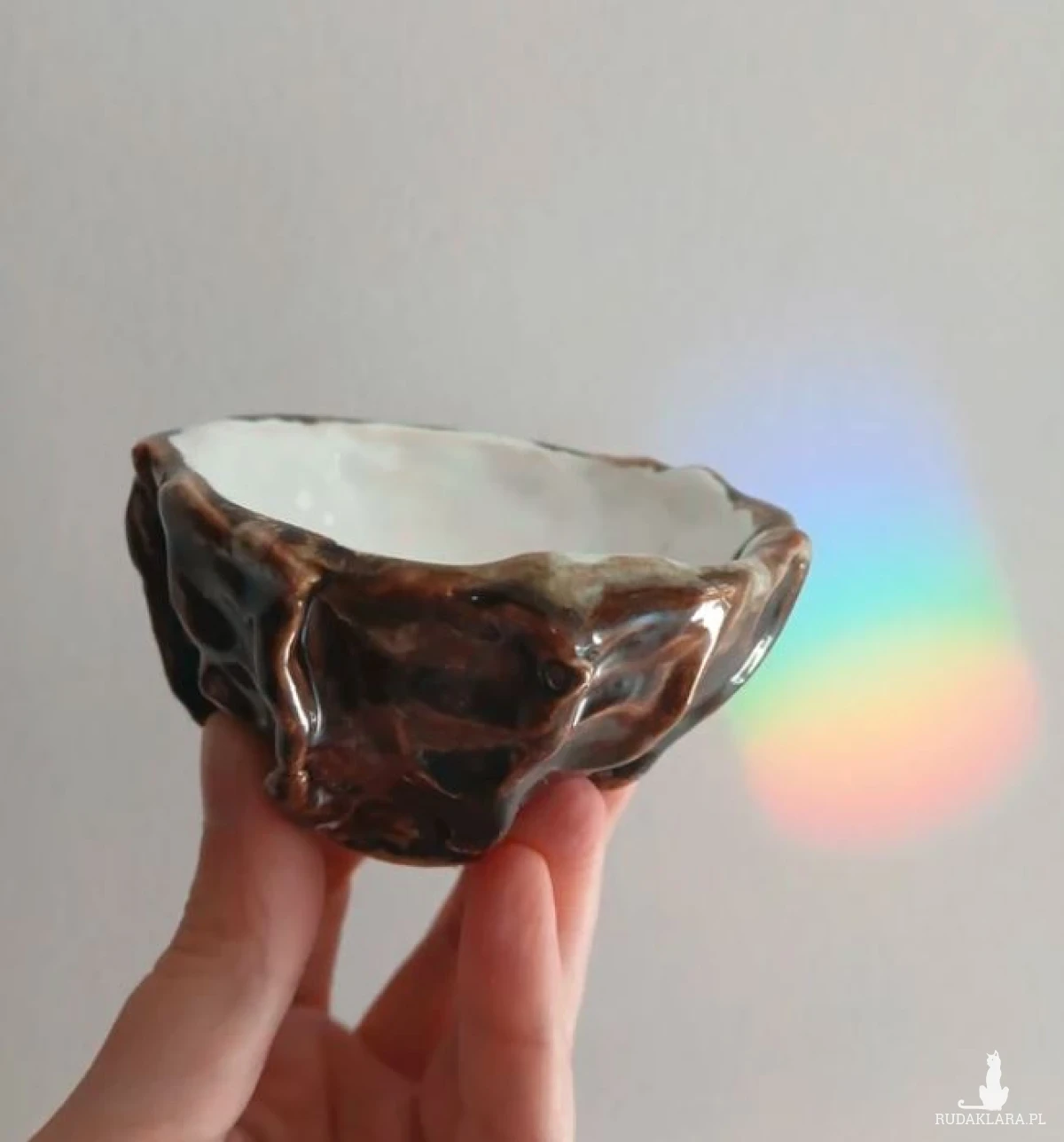 Ceramiczna miseczka ręcznie lepiona z gliny. Unikatowa ceramika użytkowa. Może posłużyć jako miseczka na drobiazgi, rustykalny świecznik na tealight, miseczka na sos sojowy do sushi, pojemnik na przyprawy, podstawka na biżuterię, talerzyk na kadzidełko. Orgnaniczna forma inspirowana naturą przypomina muszelkę lub koralowiec. Galeria sztuki.