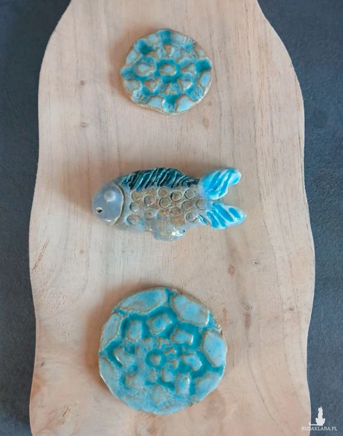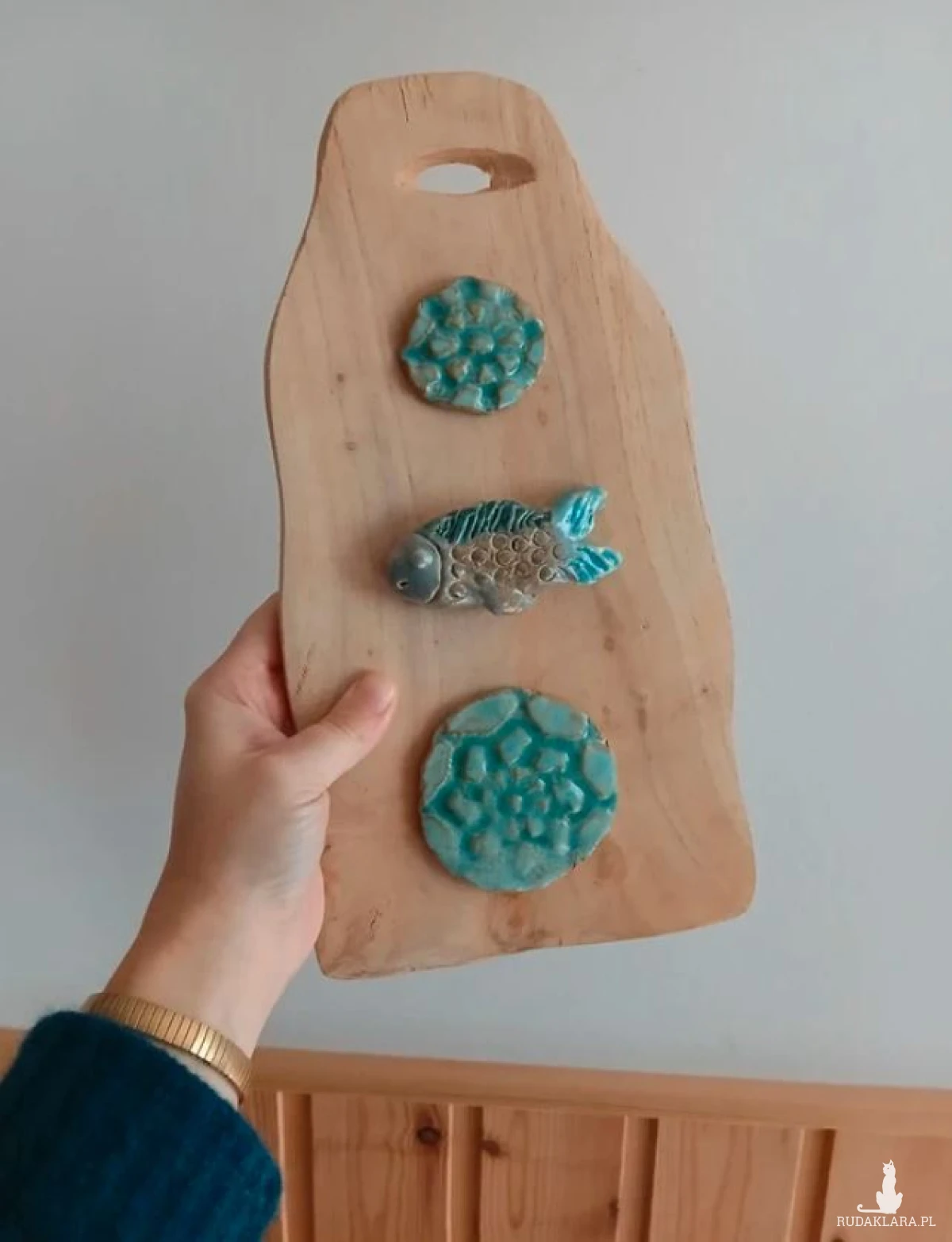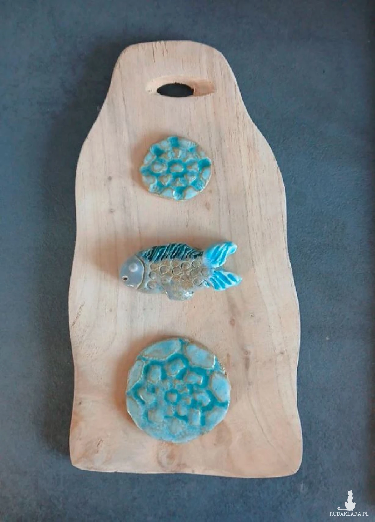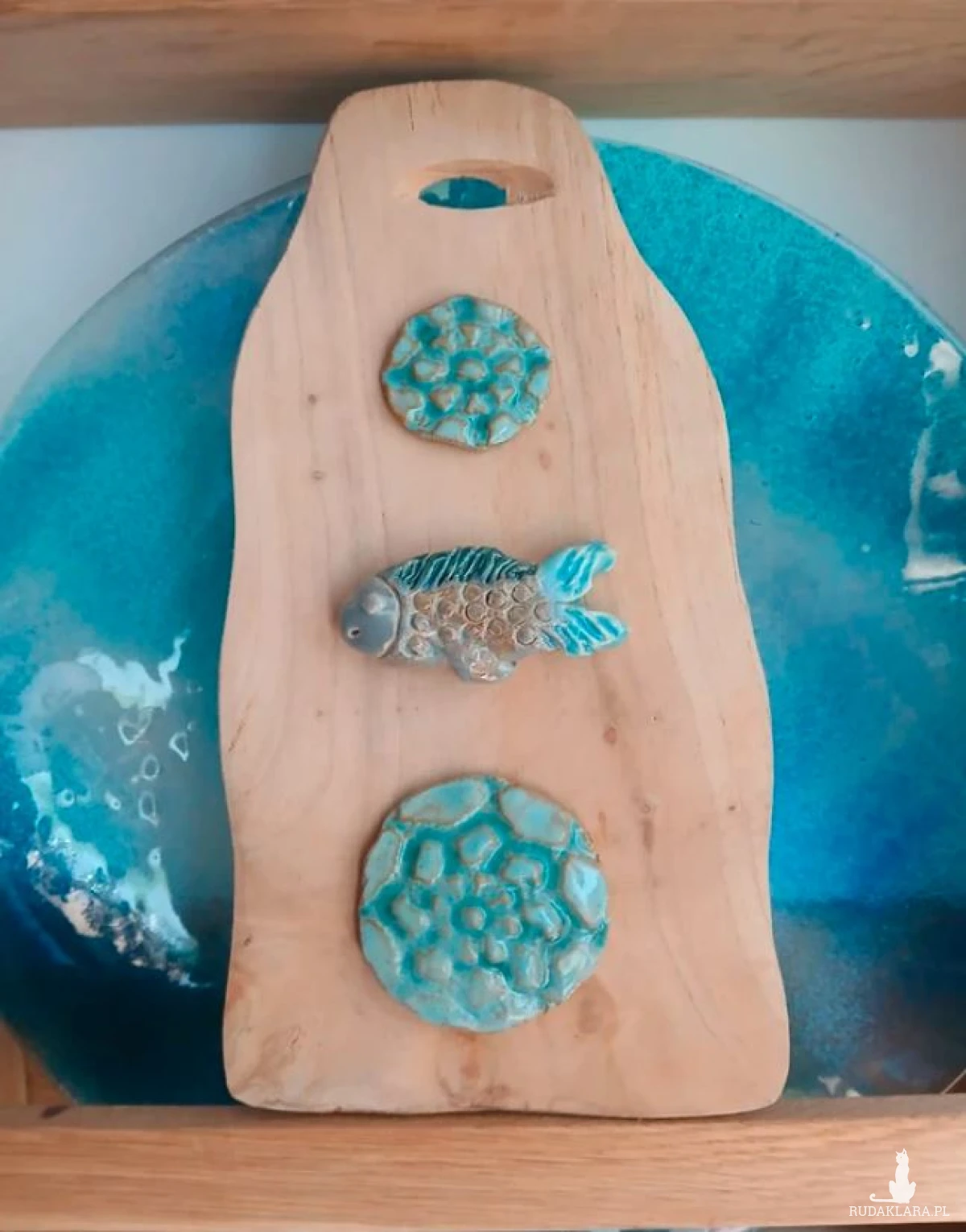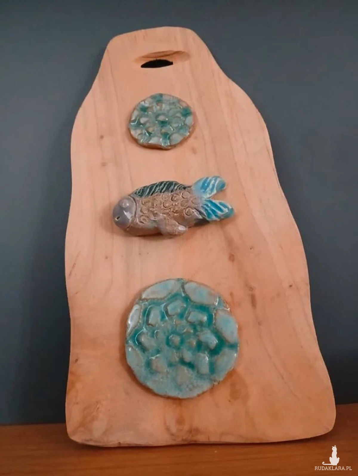 Dekoracyjna deska i ceramiczna mandala - obraz 3D ceramiczna mozaika na drewnianej desce gliniana ryba - dekoracja na ścianę do kuchni do jadalni - eklektyczna, boho, folk, sztuka ludowa, cepelia. Nadmorski klimat, pamiątka z podróży, wakacje nad morzem. Pomysł na prezent.