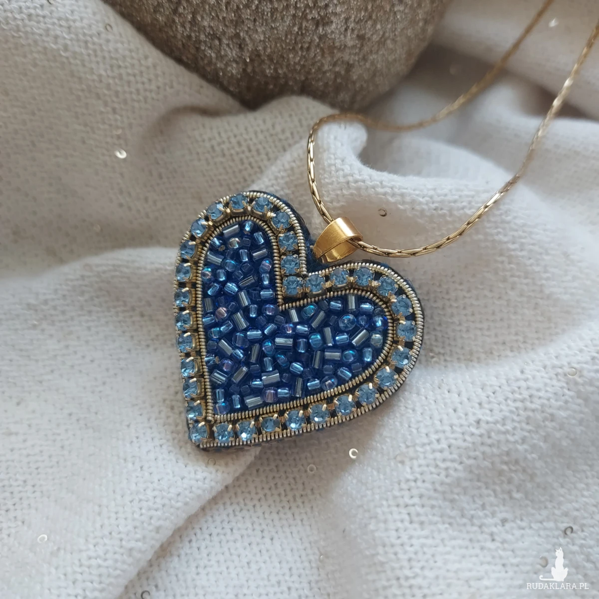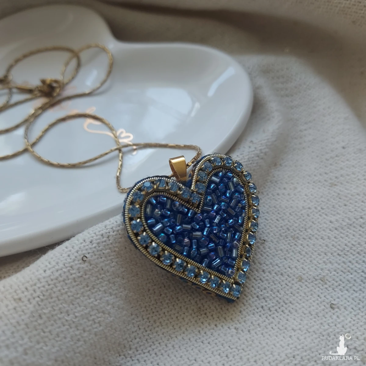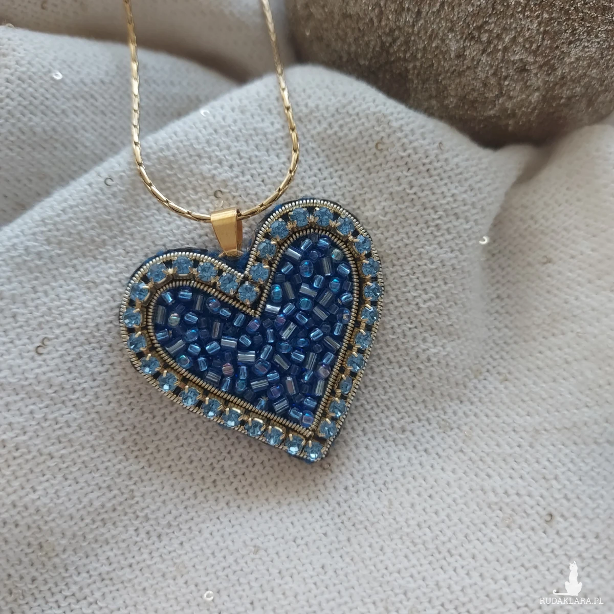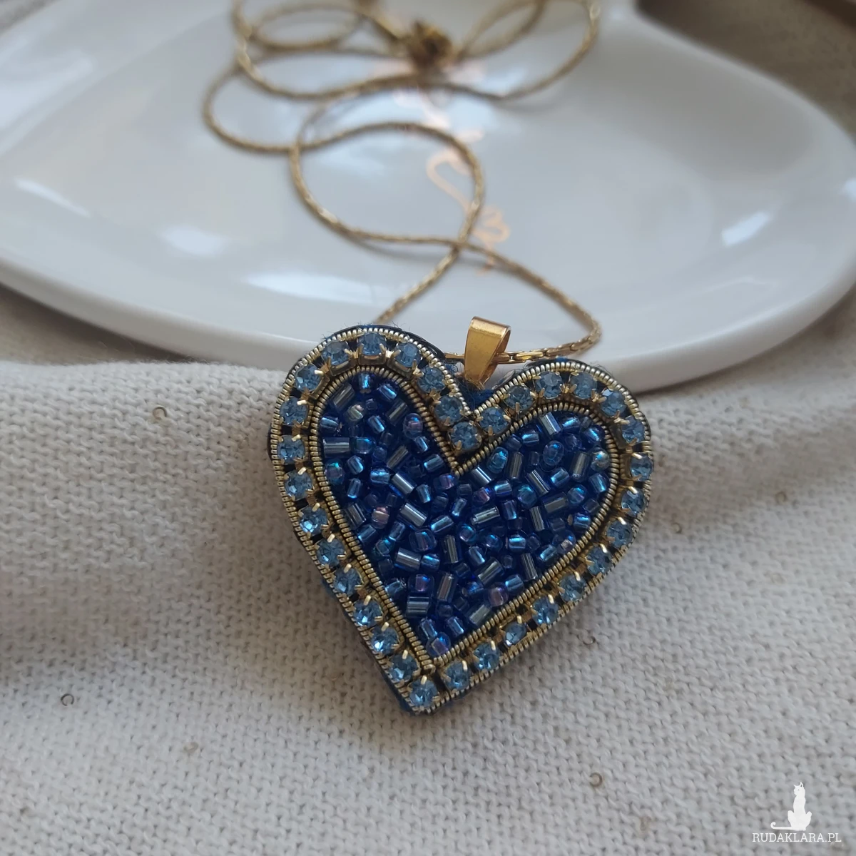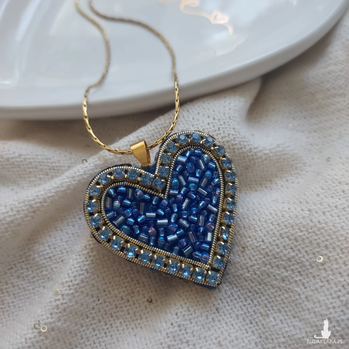 Wisior serce w pięknym szafirowym kolorze - wyjątkowy, niepowtarzalny powstal techniką haftu koralikowego.