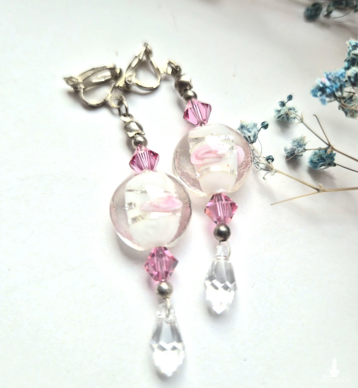 Szklane klipsy w różu z kwiatkami delikatne zwracające uwagę polecam boks M1