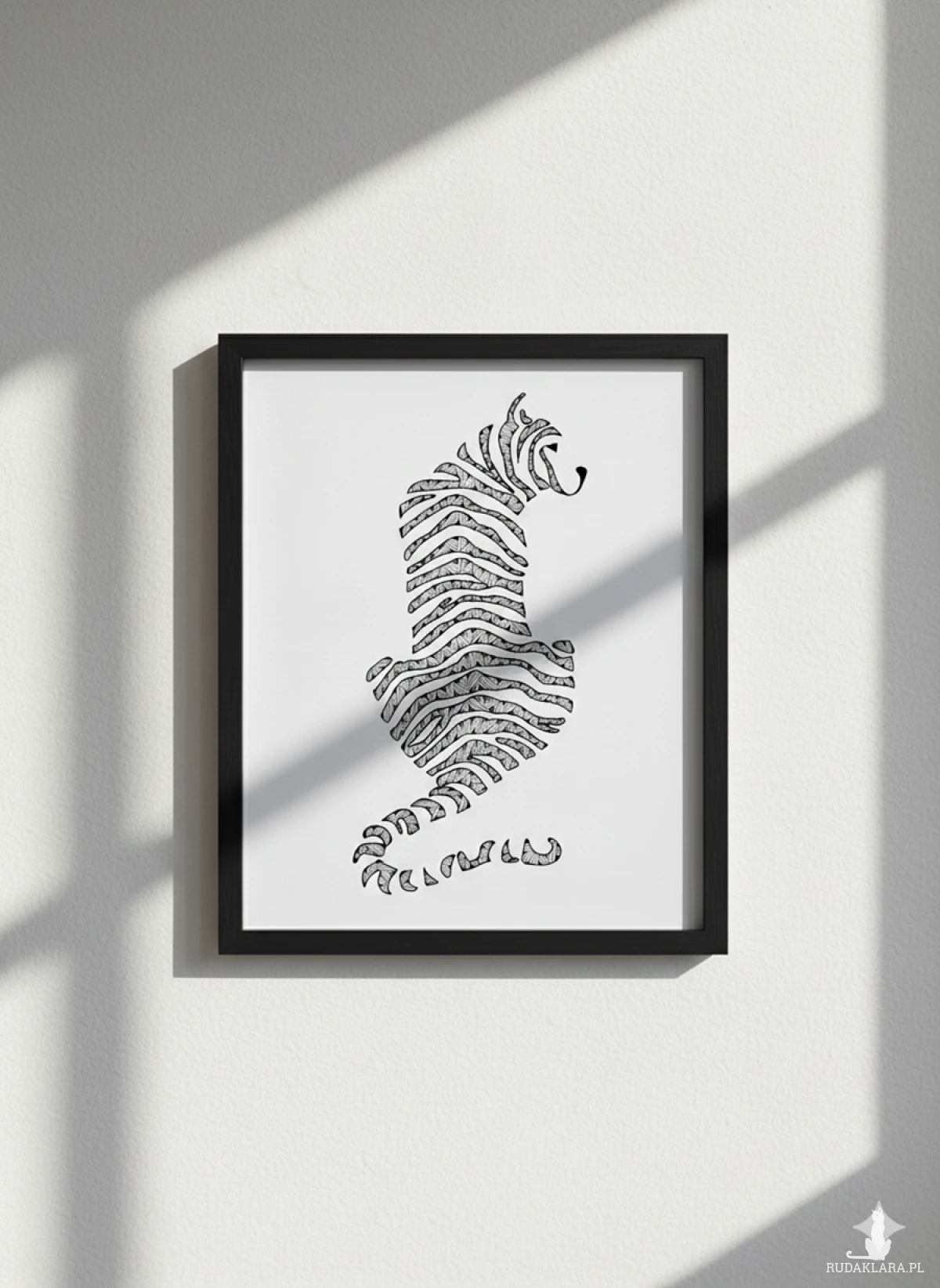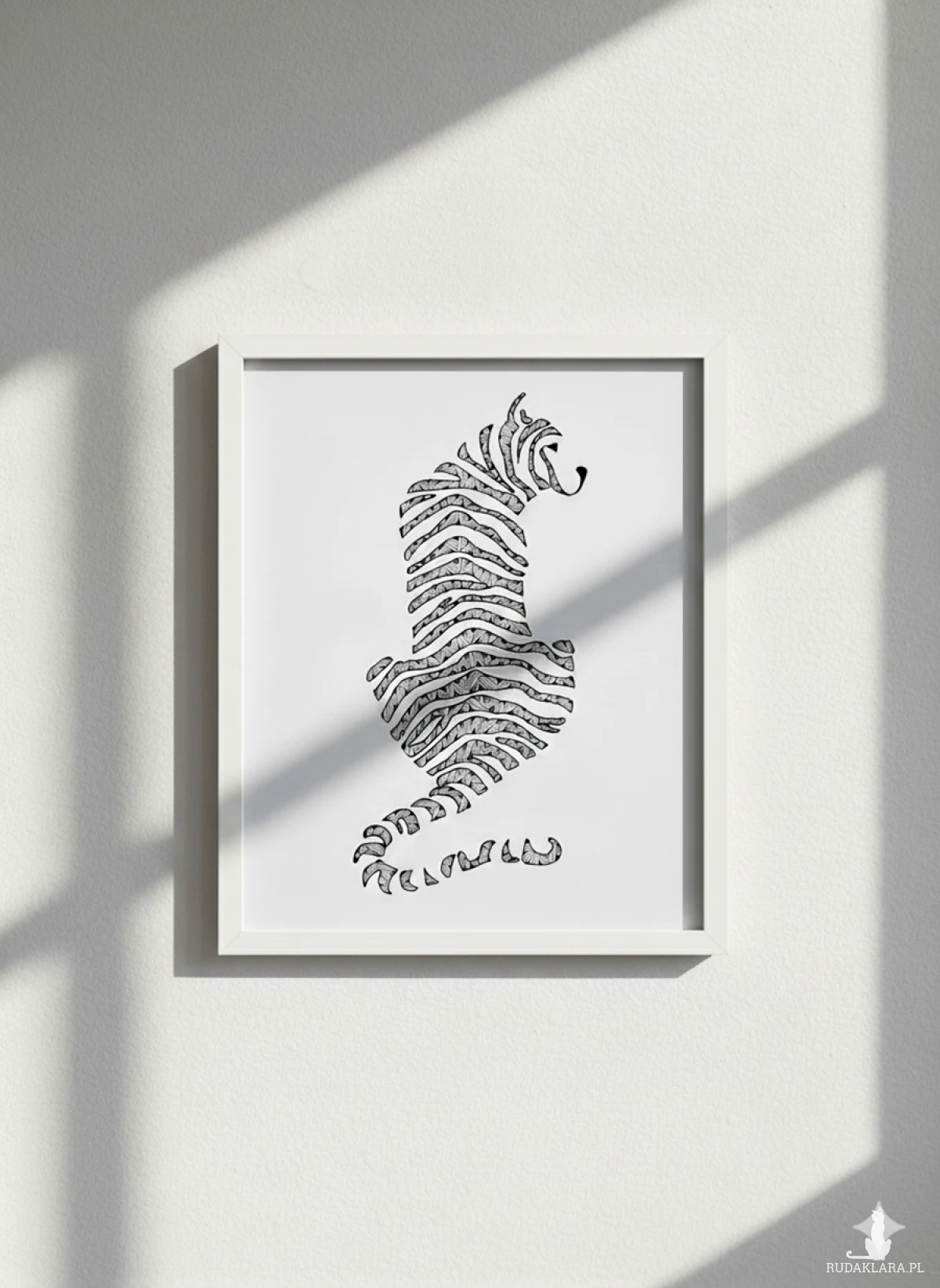 Abstrakcyjna, dekoracyjna interpretacja sylwetki tygrysa, stworzona z falistych pasów wypełnionych misternymi, geometrycznymi wzorami. Rysunek w czerni i bieli o mocno stylizowanym i graficznym charakterze, który nadaje sylwetce zwierzęcia hipnotyzujący ruch.