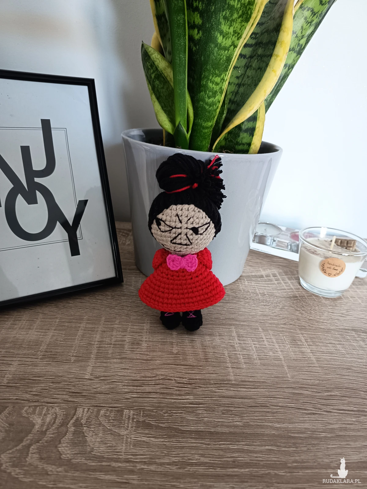 Mała Mi w czarnym wydaniu z rączkami do tyłu szydełkowy brelok zawieszka