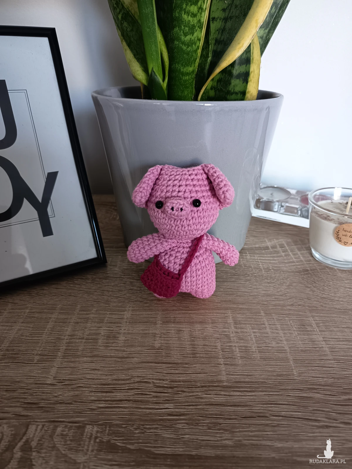 Szydełkowy brelok zawieszka dekoracja różowa świnka z torebką