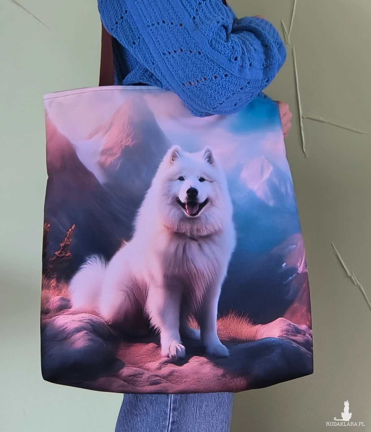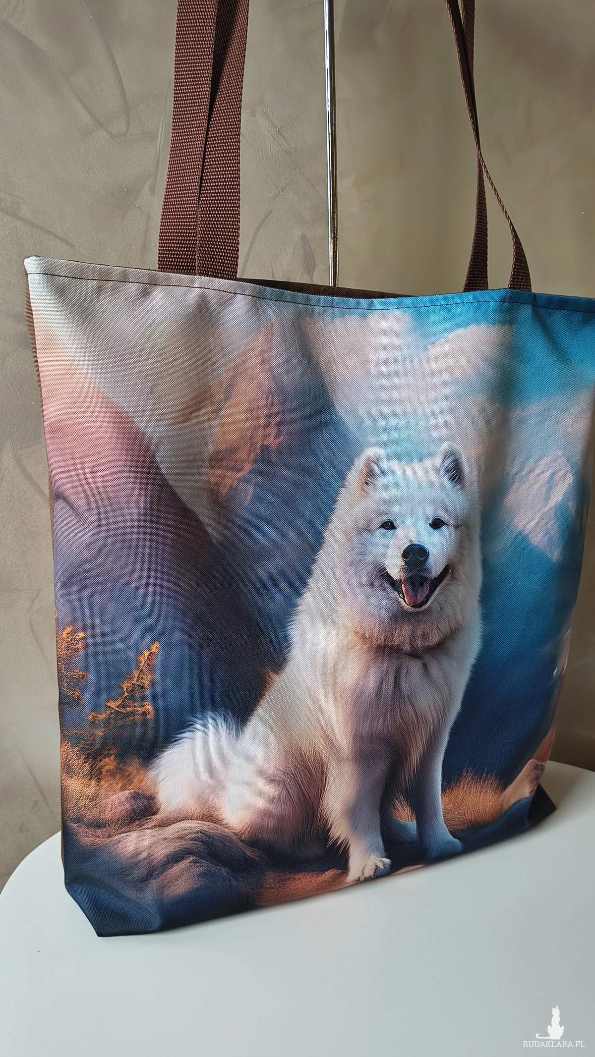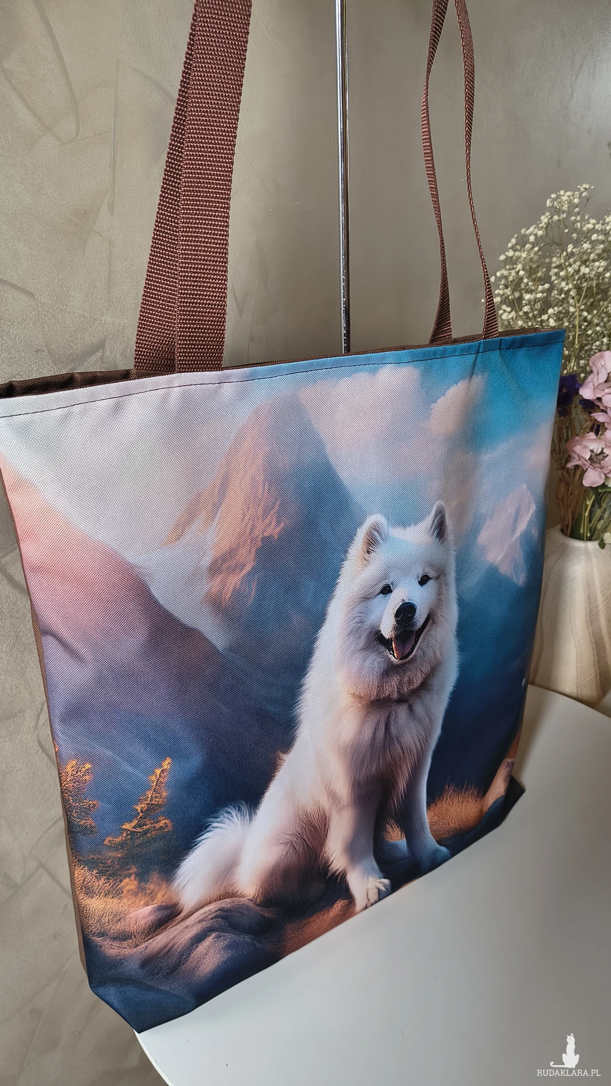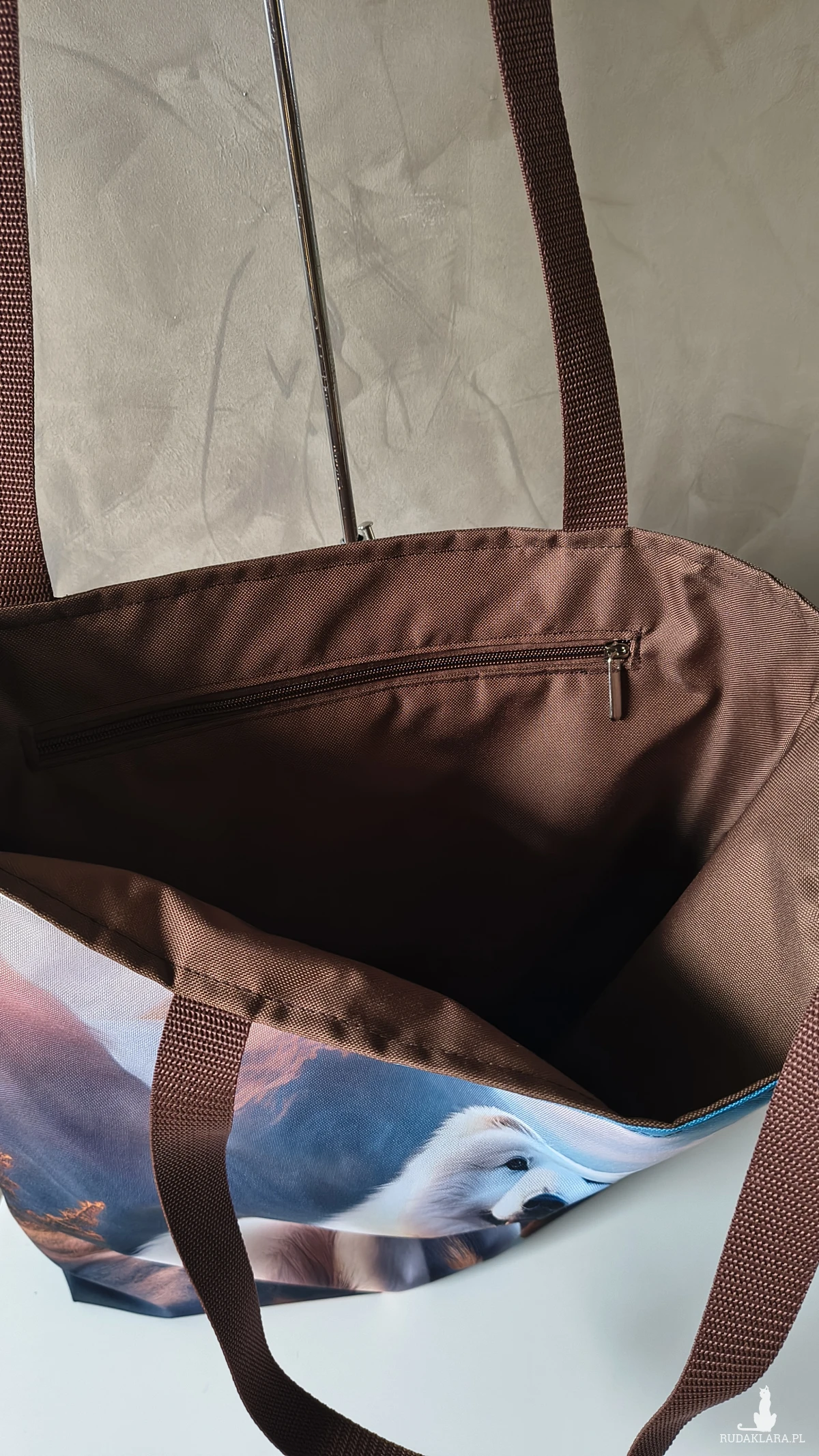 To całkiem spora torba a do tego wytrzymała Wykonana z materiału wodoodpornego, więc nie straszny jej deszcz czy zabrudzenia. Wewnątrz znajduje się wodoodporna podszewka z kieszonką na zamek. Na przedniej ścianie panel z psem. Tył torby brązowy.
