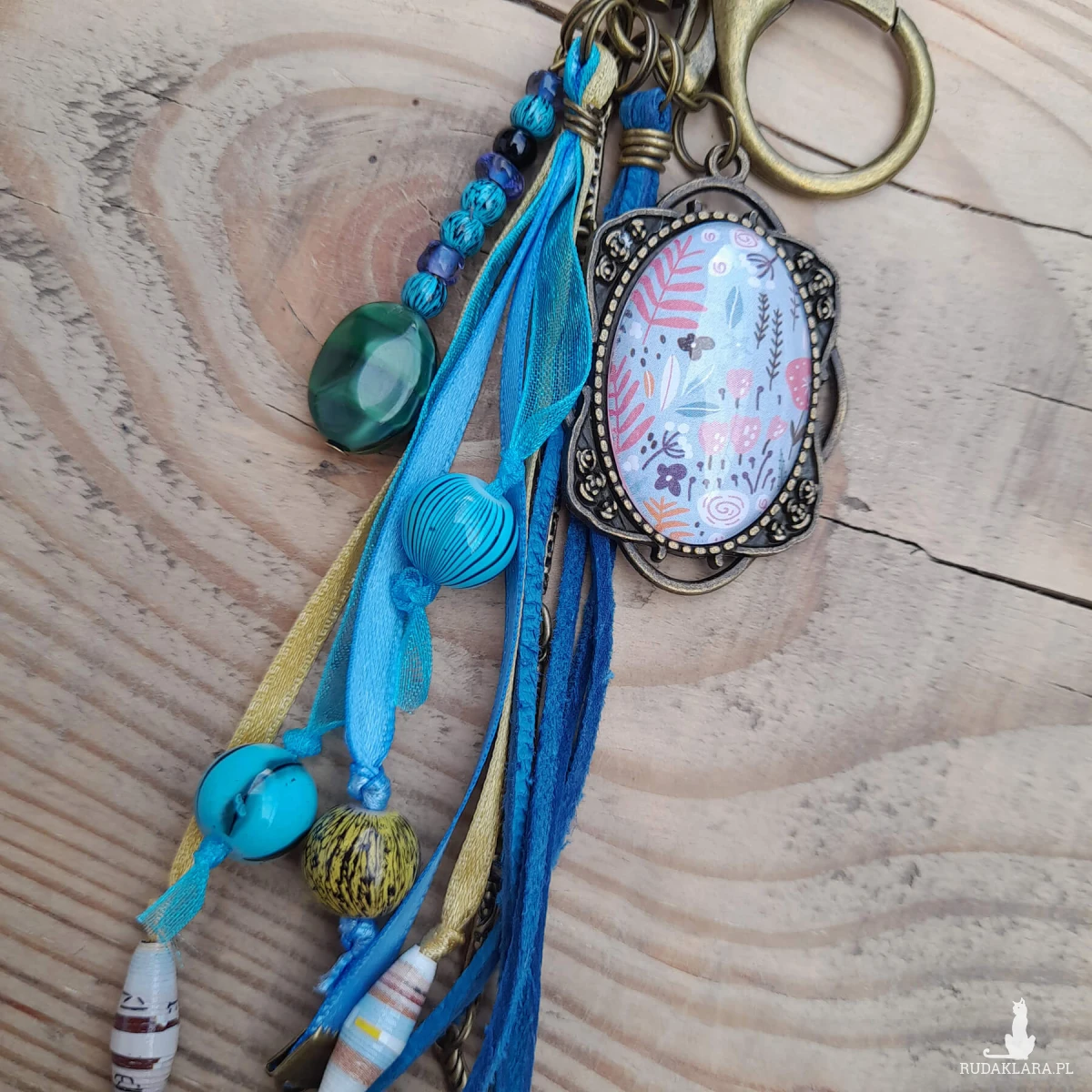 Dodaj odrobinę koloru i wyjątkowego stylu do swoich kluczy lub torebki! Oryginalny, ręcznie wykonany brelok w stylu boho z ozdobną ramką w kolorze starego złota. W ramce znajduje się kolorowy motyw kwiatowy na jasnym tle. Brelok zdobią barwne koraliki w odcieniach zielonego, niebieskiego oraz żółtego, zawieszone na niebieskich tasiemkach. Całość uzupełnia solidne metalowe zapięcie z karabińczykiem i kółkiem na klucze.