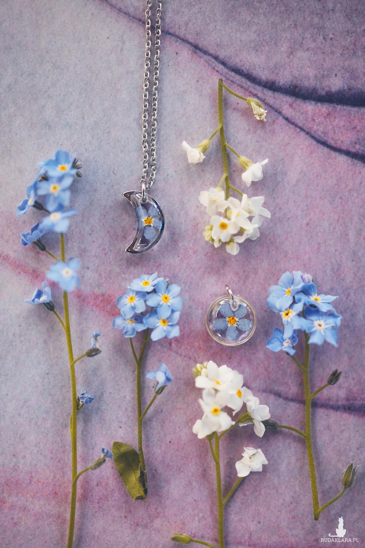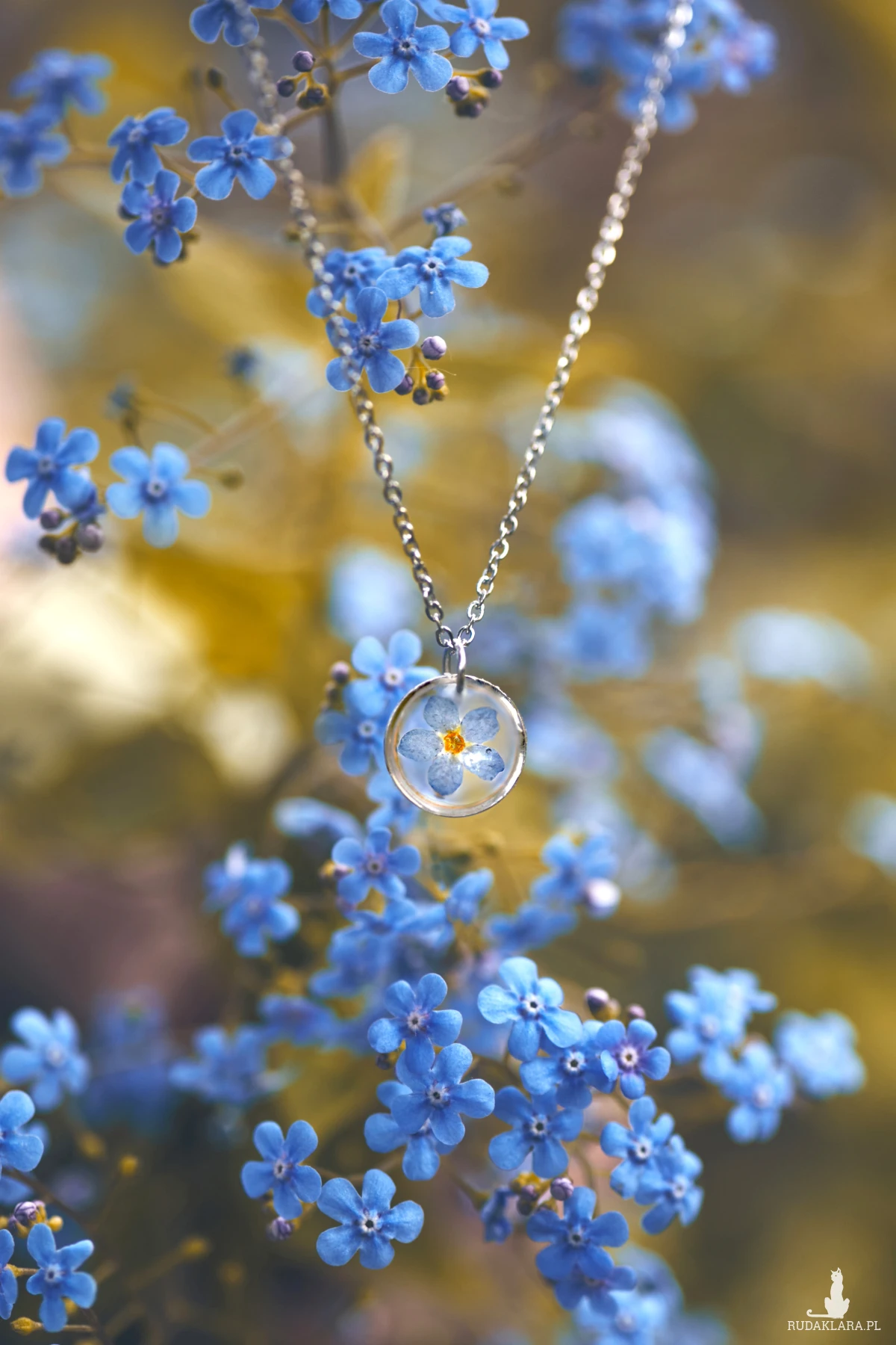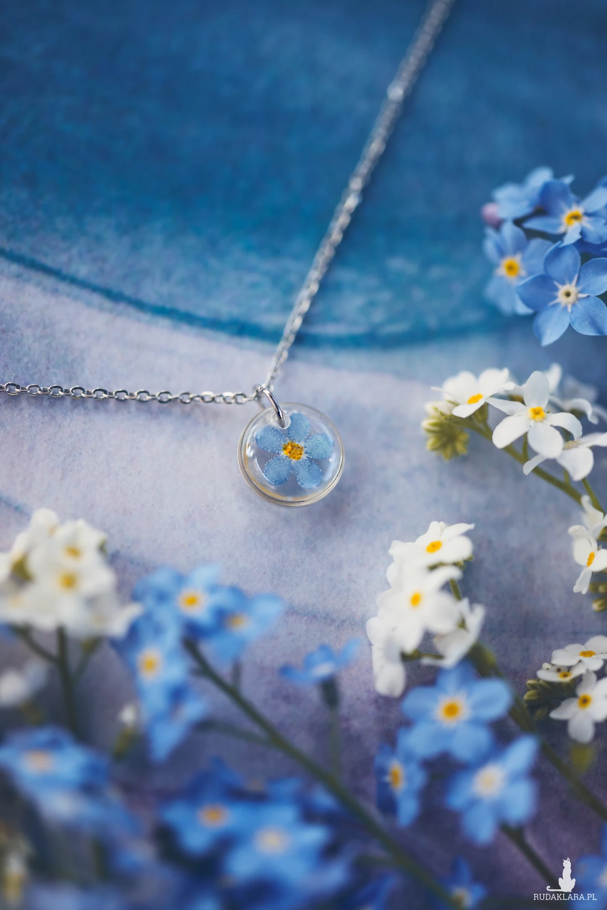 Naszyjnik z prawdziwymi kwiatami to niepowtarzalny prezent o oryginalnym kształcie, który zachwyci każdego! Biżuteria wykonana jest z wysokiej jakości żywicy epoksydowej, odpornej na działanie promieni UV, oraz dodatków ze stali chirurgicznej. W środku naszyjnika znajduje się zasuszony przeze mnie kwiat niezapominajki polskiej, symbolizujący pamięć i wierność.