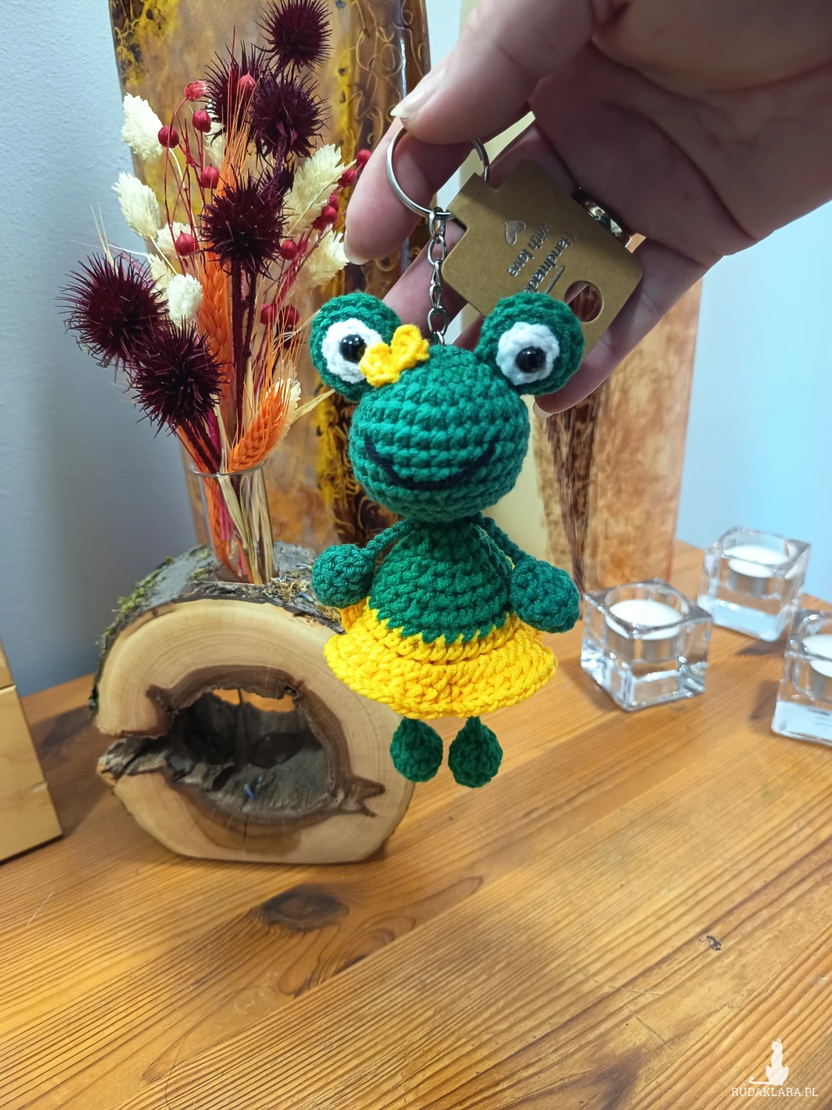Żabka brelok szydełkowy ciemnozielona w żółtej spódniczce