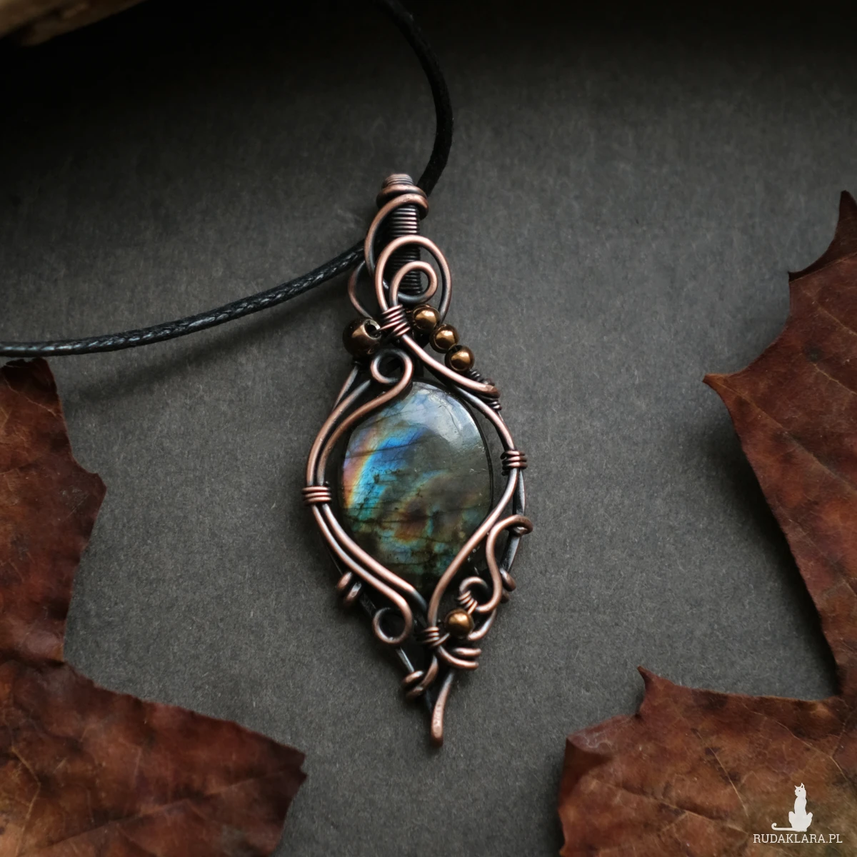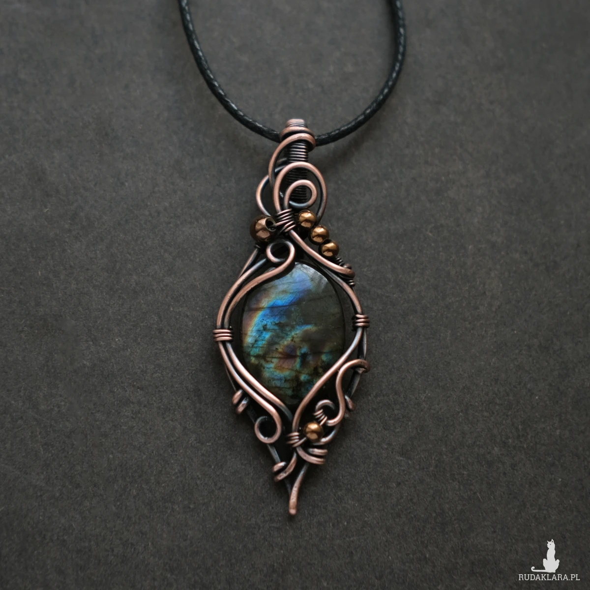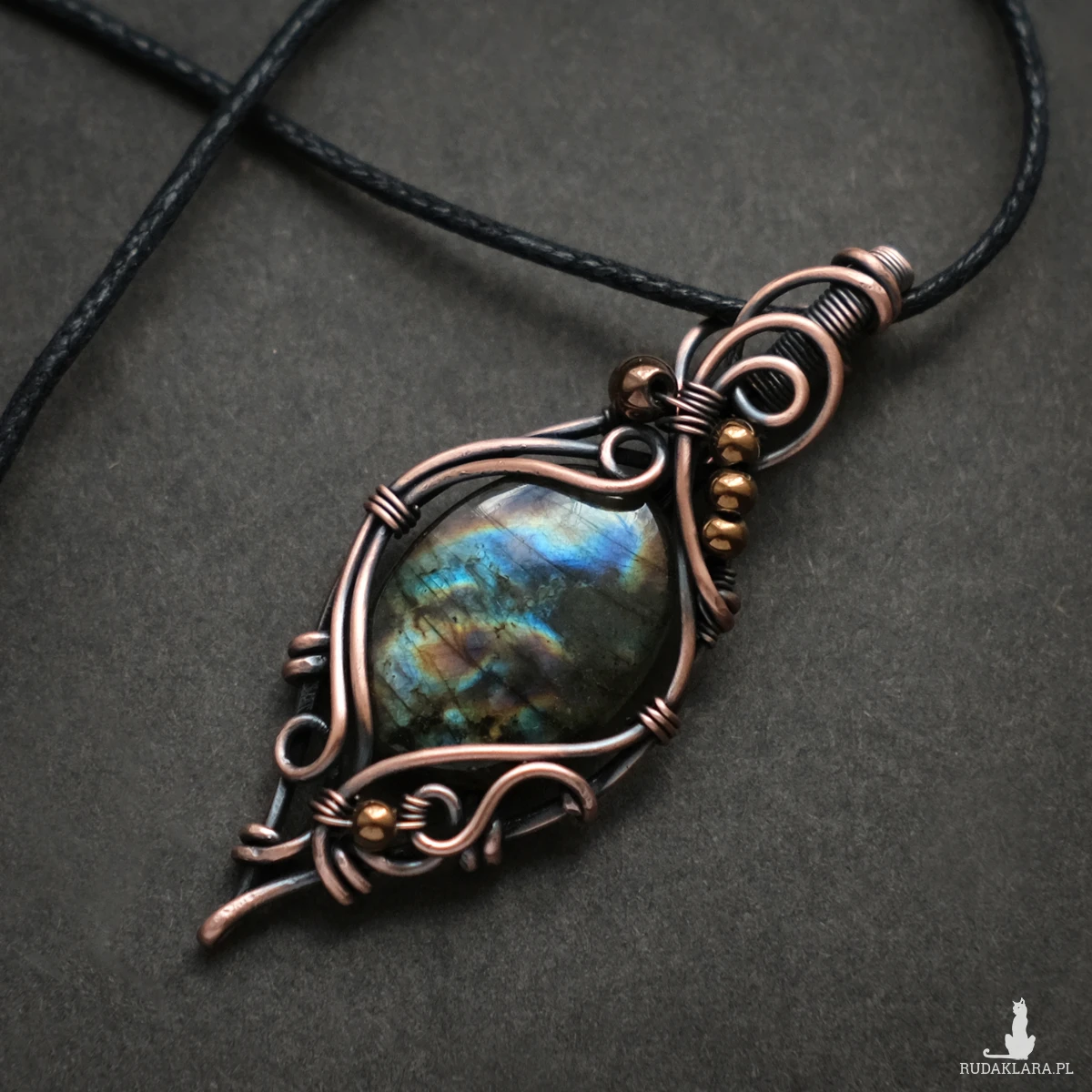 Piękny miedziany wisiorek w elfickim stylu z kamieniem labradorytu. Labradoryt to wyjątkowy kamień, który kochają kobiety. Użyty w oprawie kamień iryzuje w kolorach błękitu, pomarańczu oraz zieleni. Iryzacja jest delikatna, za to ma bardzo ciekawą grę wzorów.