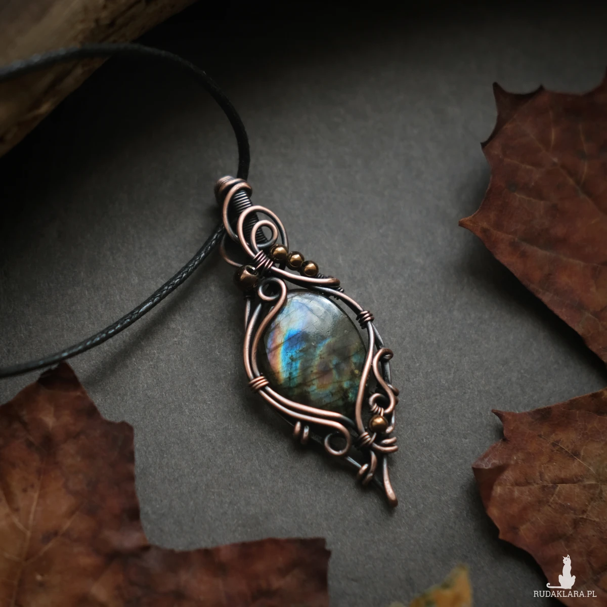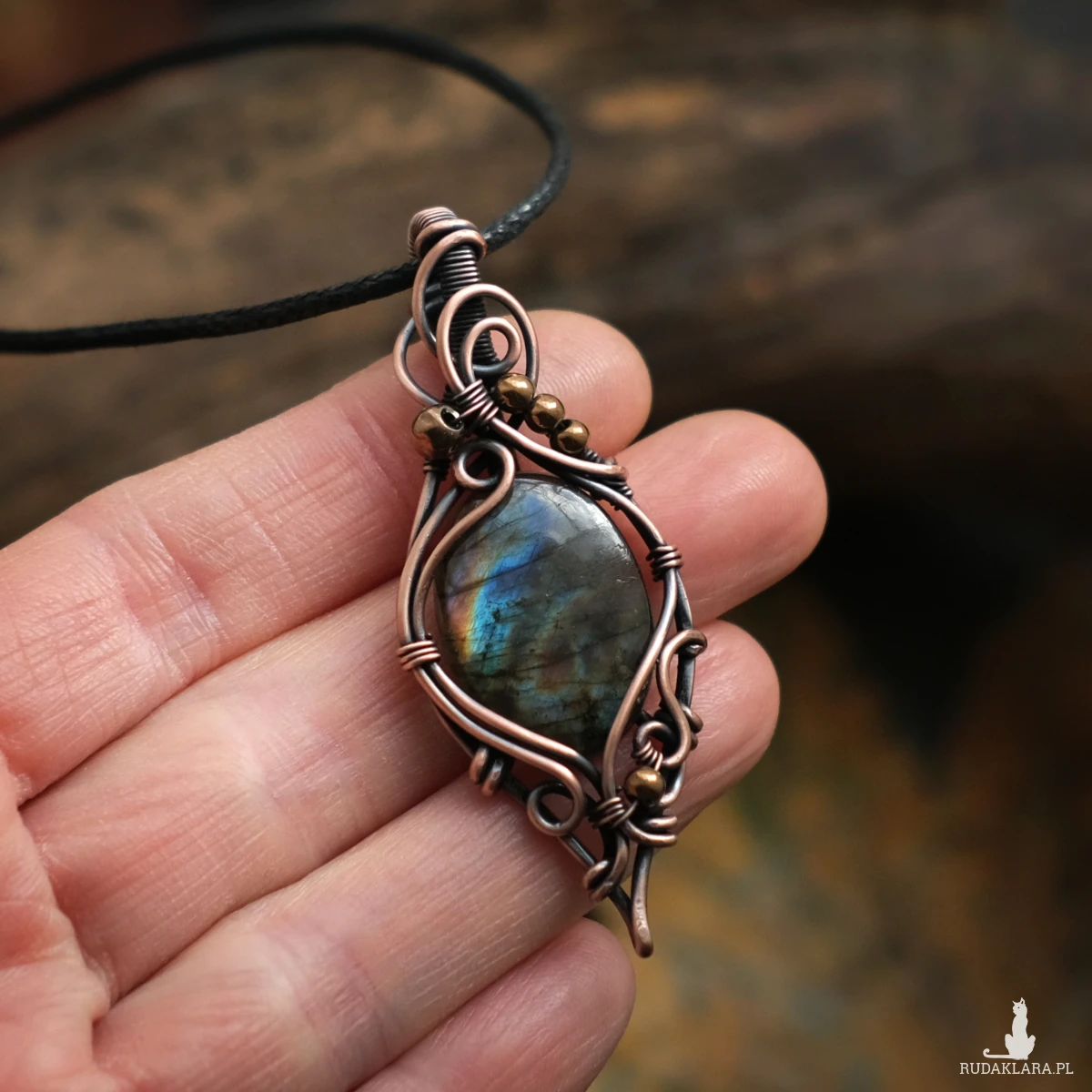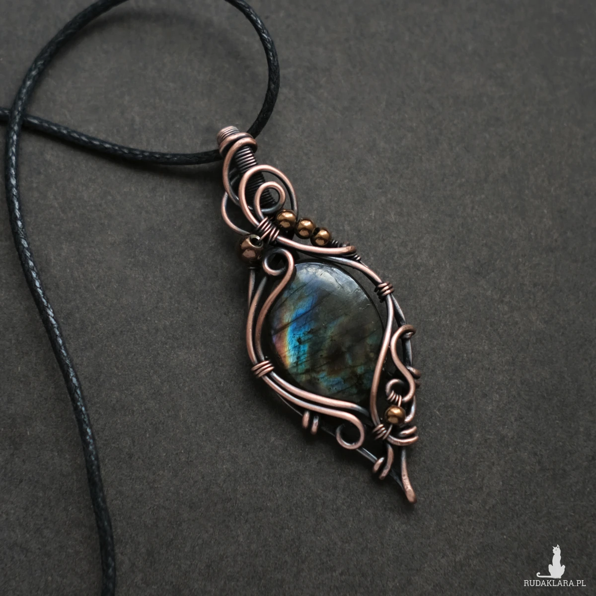 Piękny miedziany wisiorek w elfickim stylu z kamieniem labradorytu. Labradoryt to wyjątkowy kamień, który kochają kobiety. Użyty w oprawie kamień iryzuje w kolorach błękitu, pomarańczu oraz zieleni. Iryzacja jest delikatna, za to ma bardzo ciekawą grę wzorów.