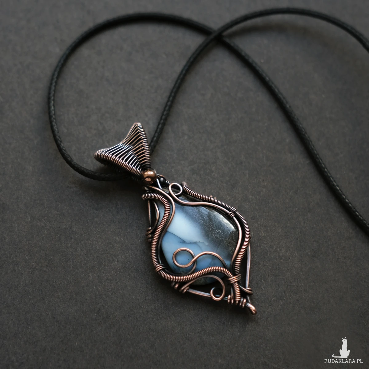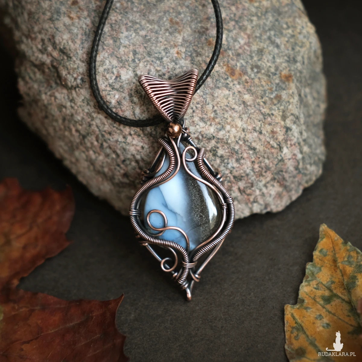 Piękny miedziany wisior w elfickim stylu mieści w sobie kamień niebieskiego opalu o ciekawym deseniu dzielącym go na dwie części - błękitną oraz ciemnoszarą.