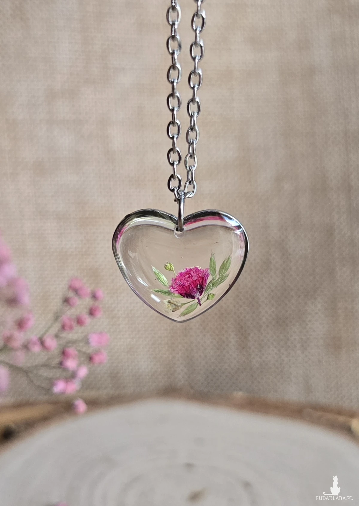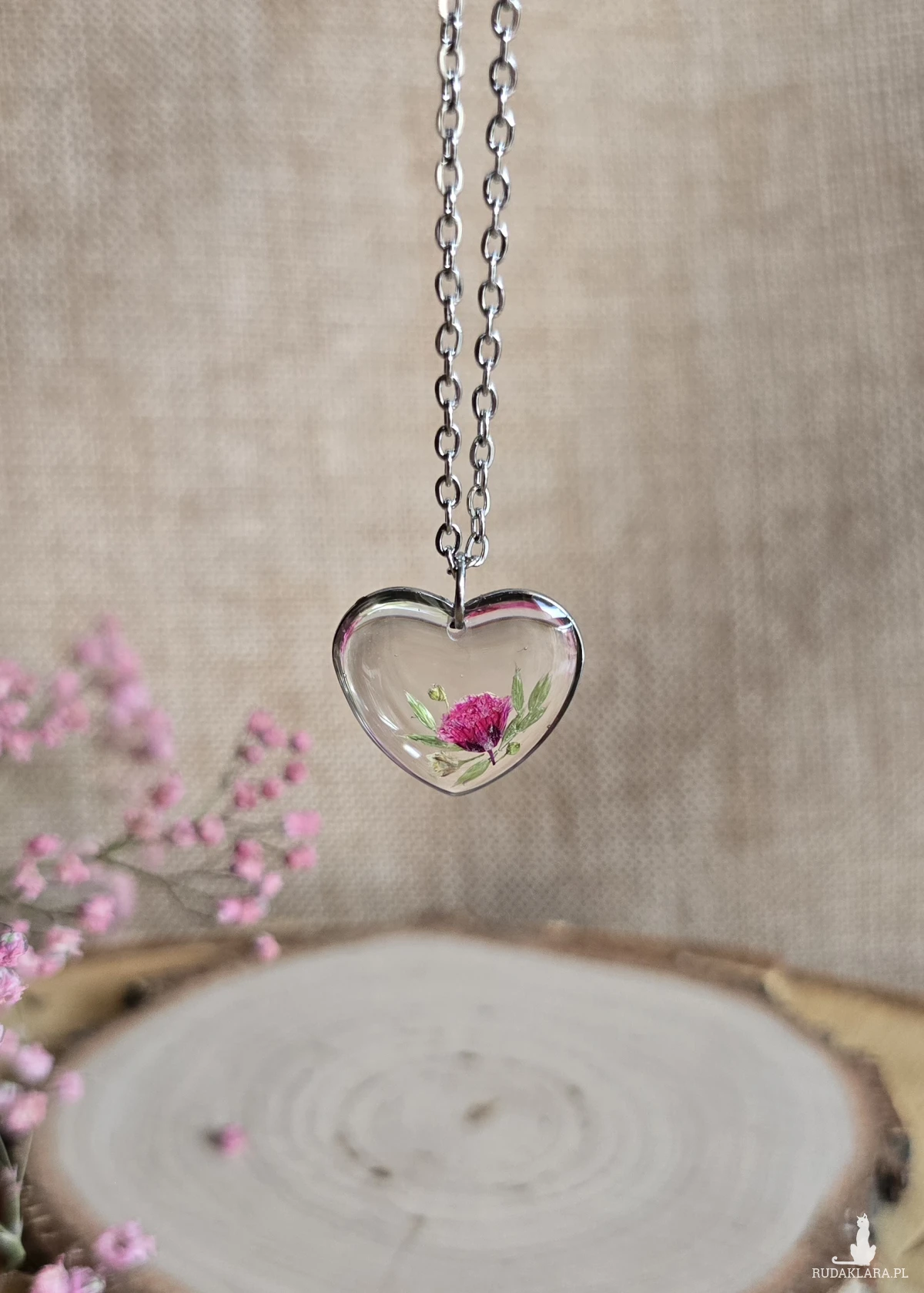 Serce serduszko Srebrna zawieszka srebrny wisiorek naszyjnik żywica z żywicy kwiaty z kwiatami retro naturalna dziewczęca kobieca różowa