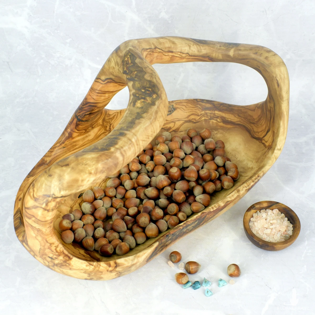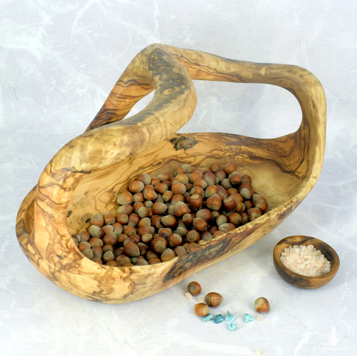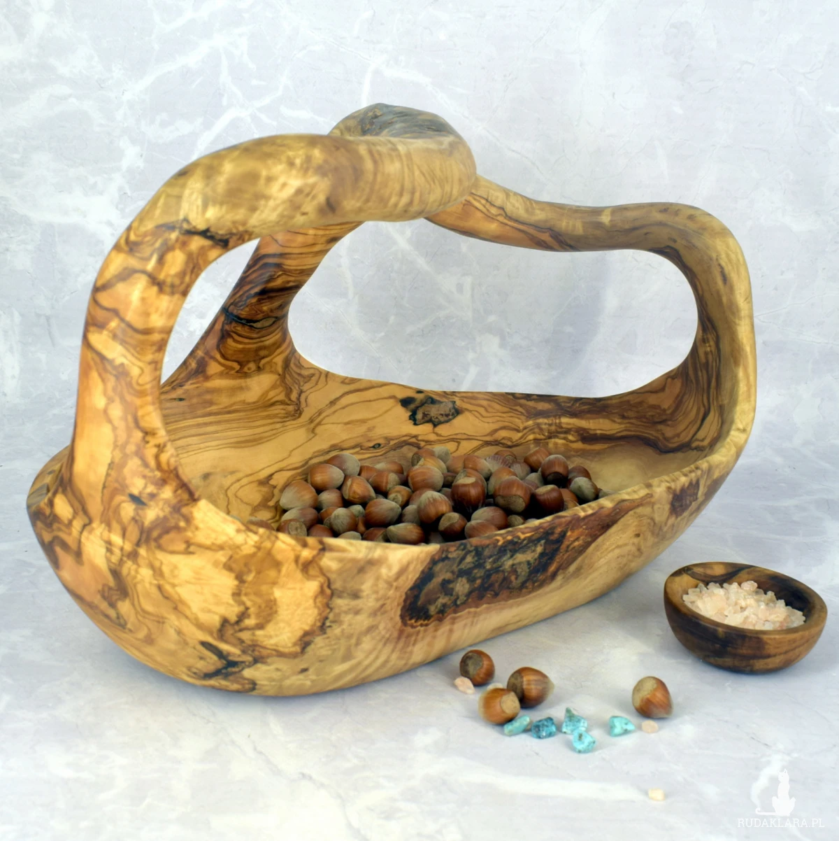 Stylowy duży kosz na owoce z drewna oliwnego, idealny do przechowywania owoców, pieczywa lub drobnych przedmiotów. Świetnie sprawdzi się w kuchni, jadalni czy salonie jako praktyczny element wystroju. Ręcznie wykonany z jednego kawałka drewna. Zabezpieczony naturalnym olejem i woskiem.