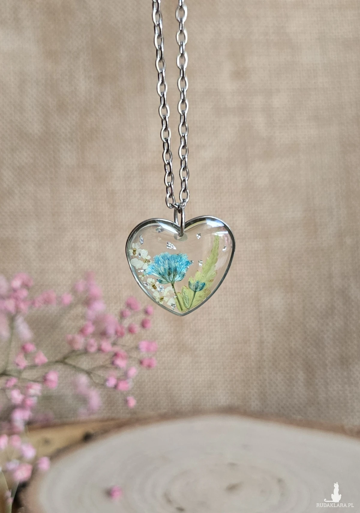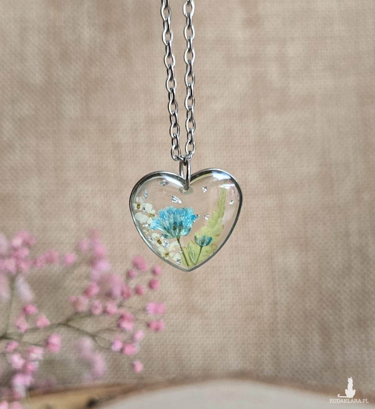 Oferuję Państwu unikalną biżuterię. Zawieszka jest wykonana z suszonych kwiatów i żywicy epoksydowej. Biżuteria jest wspaniałym i oryginalnym prezentem na lata.