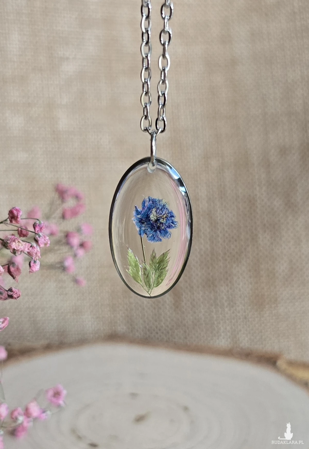 Srebrna zawieszka srebrny wisiorek naszyjnik żywica z żywicy kwiaty z kwiatami jajowata retro naturalna dziewczęca kobieca niebieska gipsówka