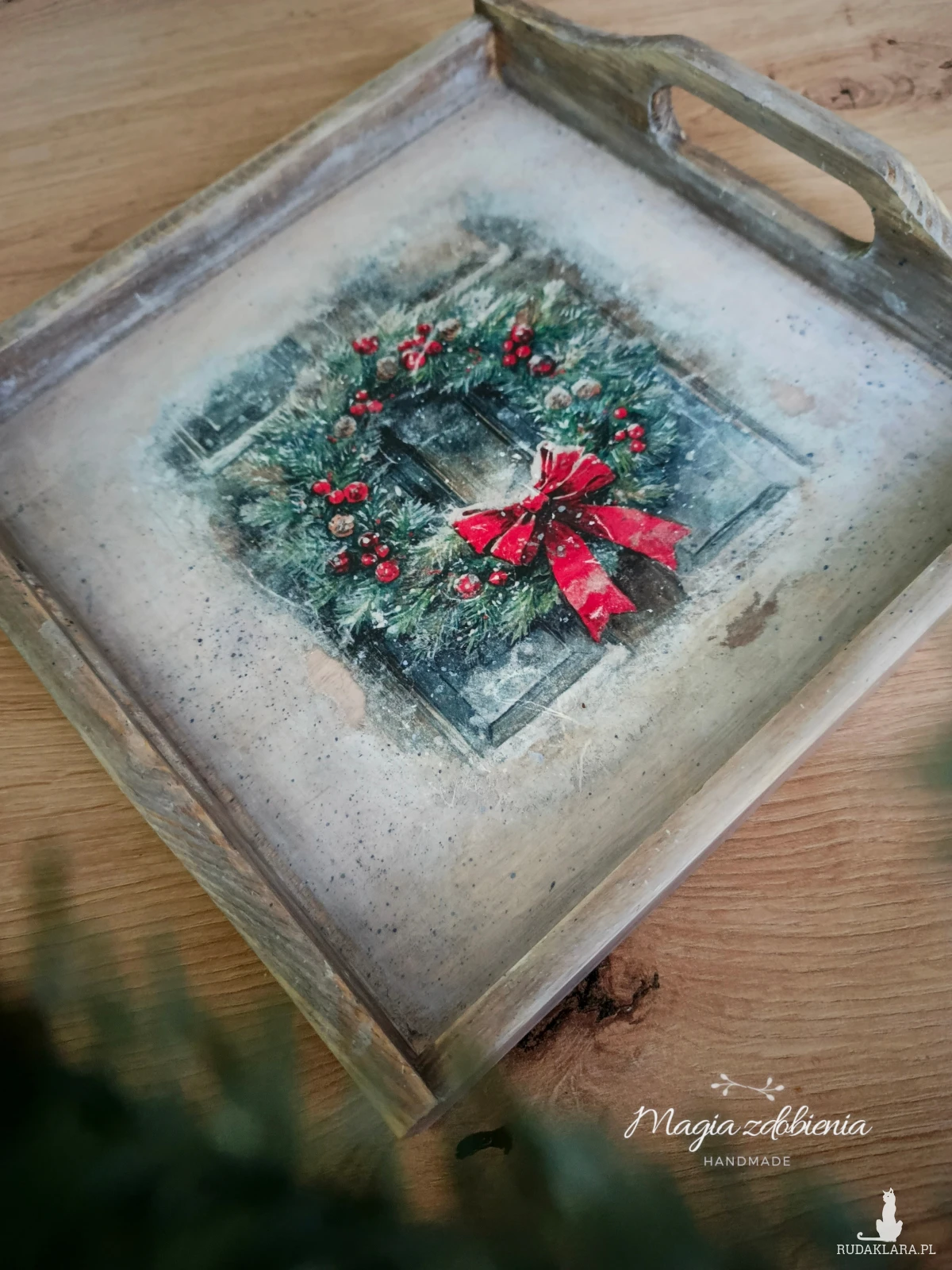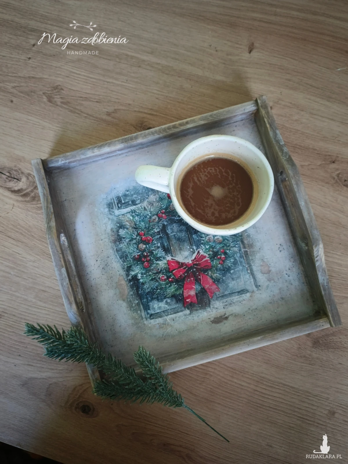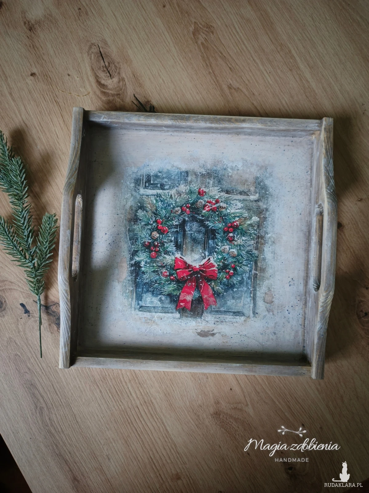 Drewniana taca zdobiona ręcznie, techniką decoupage. Bejcowana, bielona z przetarciami. . Grafika - papier ryżowy. Kilkakrotnie lakierowana ( mat i ultramat ). Wymiary: 24x24x5cm.