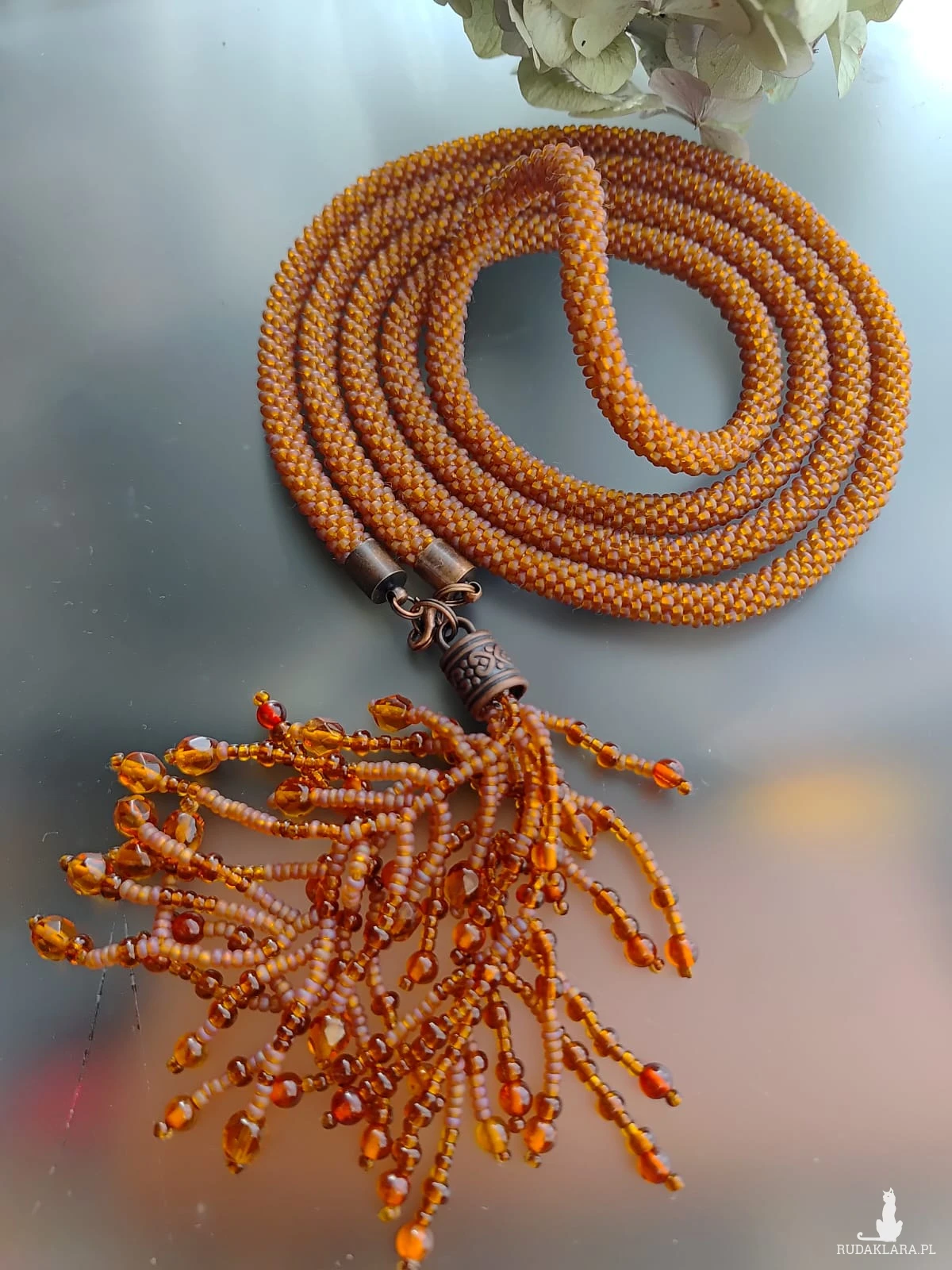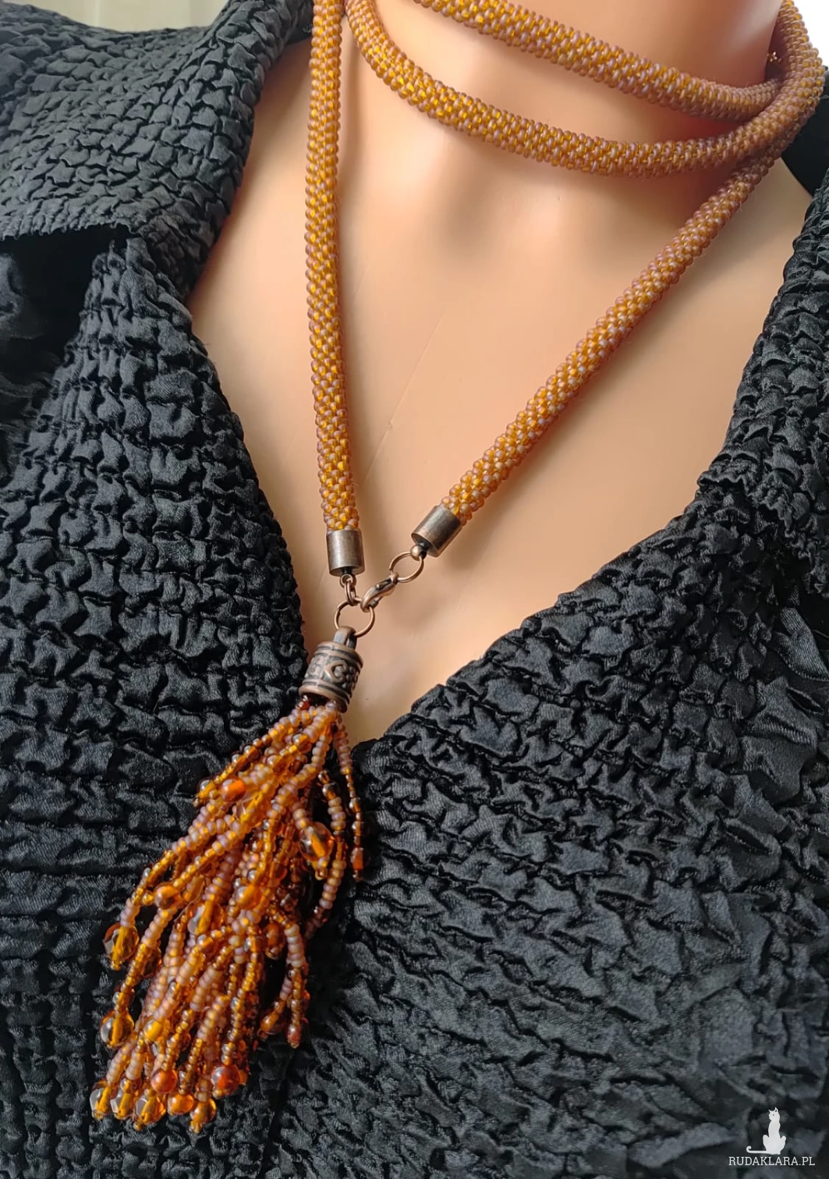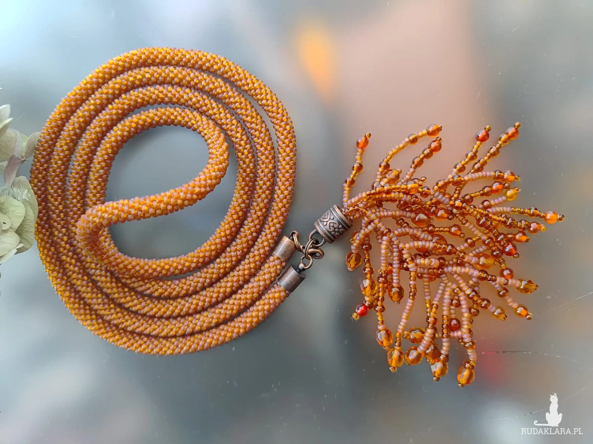 srodkiem, chwost z koralików mieszanych, brązowe koraliki Preciosa w