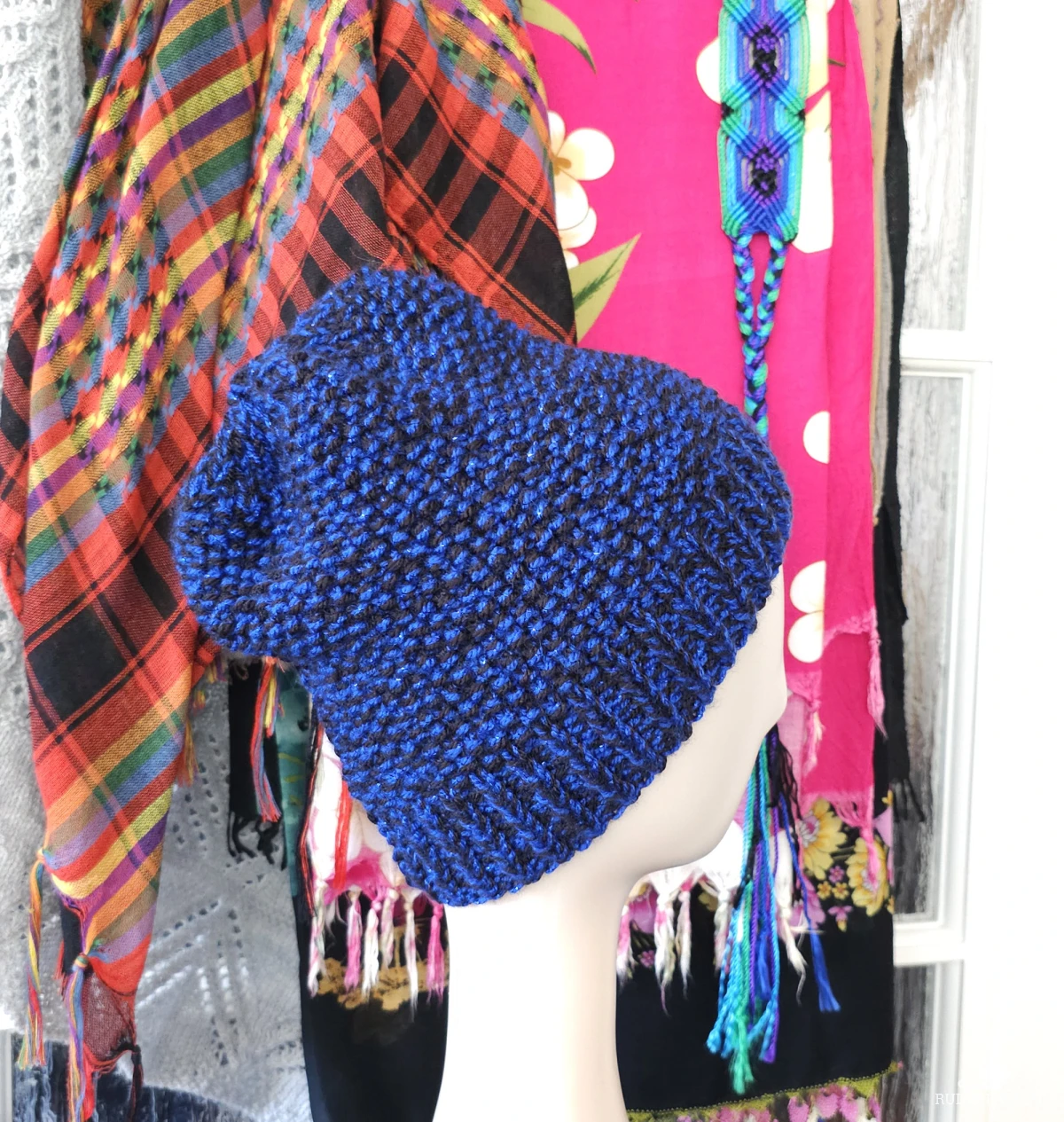 Wykonana z włóczki w głębokim, elektryzującym odcieniu królewskiego niebieskiego z błyszczącą niebieską nitką przeplatanego z czernią, co nadaje jej unikalny, dwukolorowy melanż.