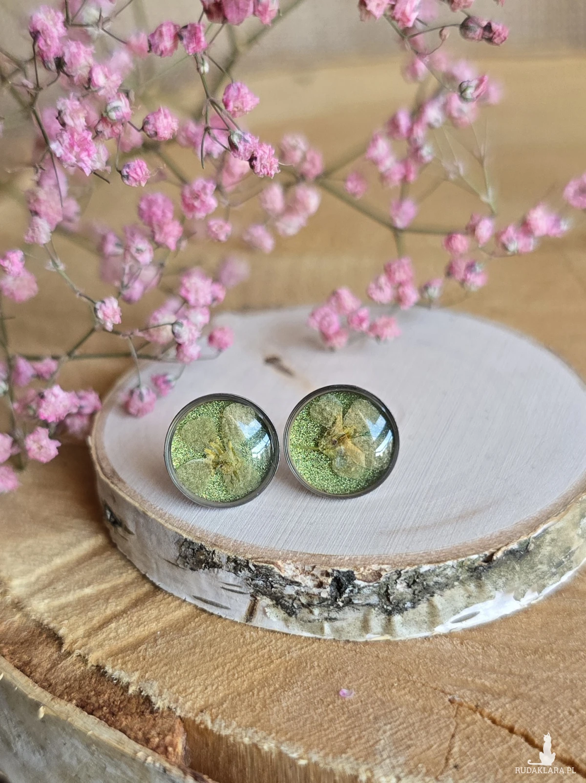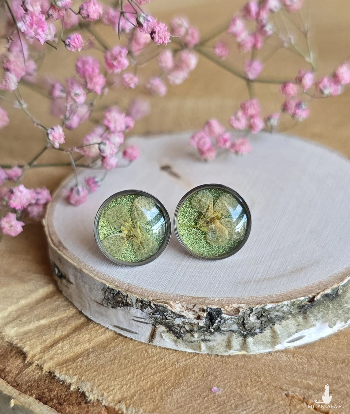 Srebrne kolczyki z kwiatami wkręty sztyfty z żywicy żywica epoksydowa z suszonymi prawdziwymi kwiatami zielone