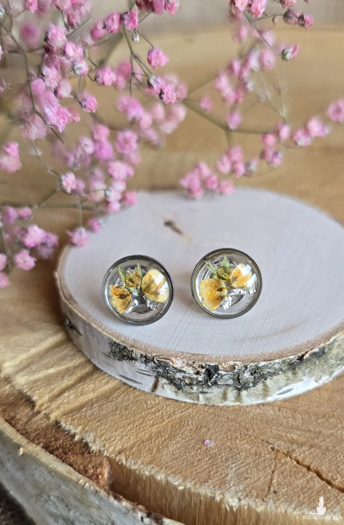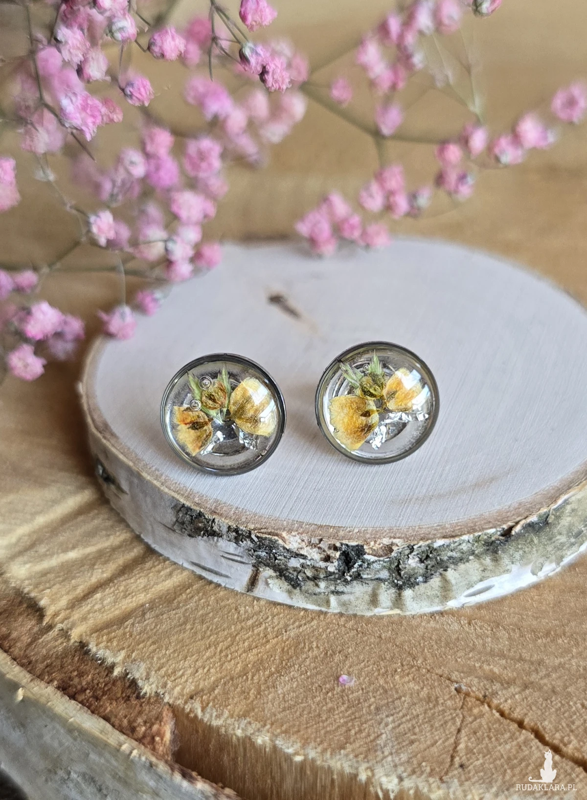 Srebrne kolczyki z kwiatami wkręty sztyfty z żywicy żywica epoksydowa z suszonymi prawdziwymi kwiatami żółte