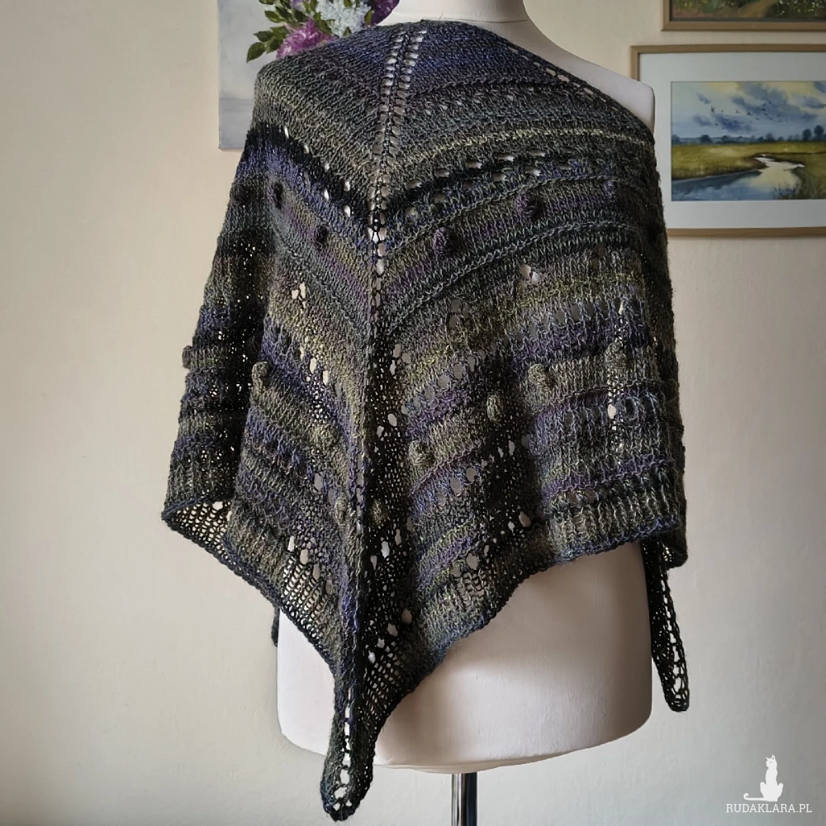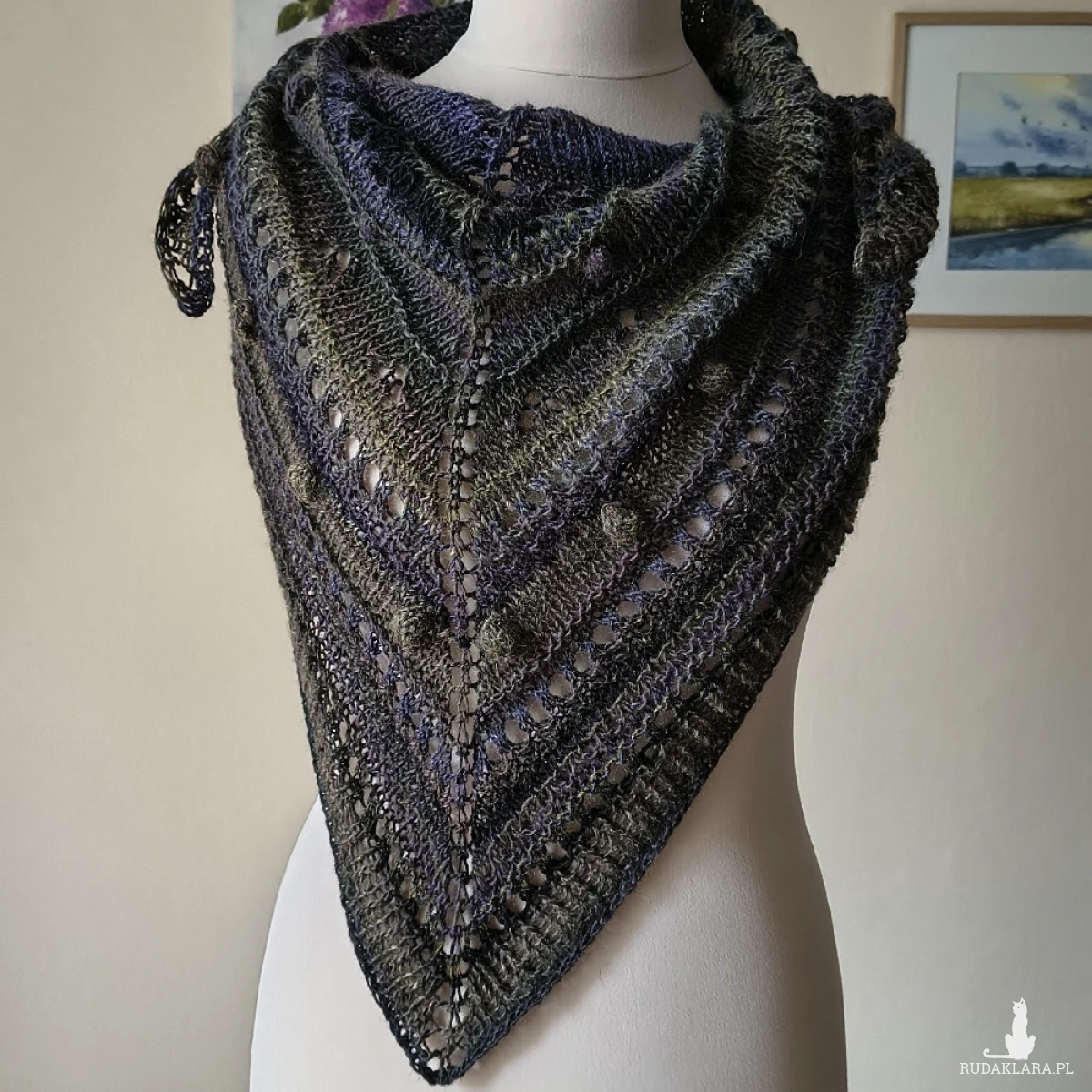 Chusta wykonana ręcznie na drutach z doskonałej hiszpańskiej włóczki, będącej mieszanką wełny i akrylu (przewaga wełny). Chusta jest przyjemna dla skóry, lekka i ciepła. Ciekawe wzory i faktura, w połączeniu z kolorystyka dają urokliwy efekt rustico. Chusta świetnie sprawdzi się o każdej porze roku. Wymiary chusty: ok. 173 cm. bok najdłuższy, ok. 78 cm wysokość trójkąta. Pranie ręczne.