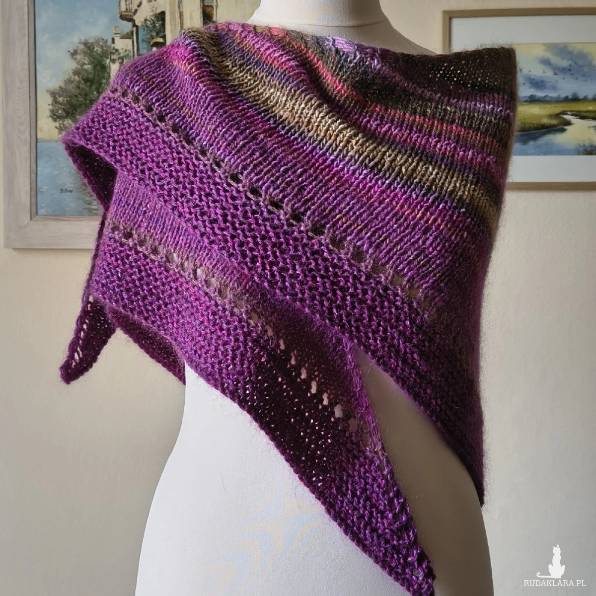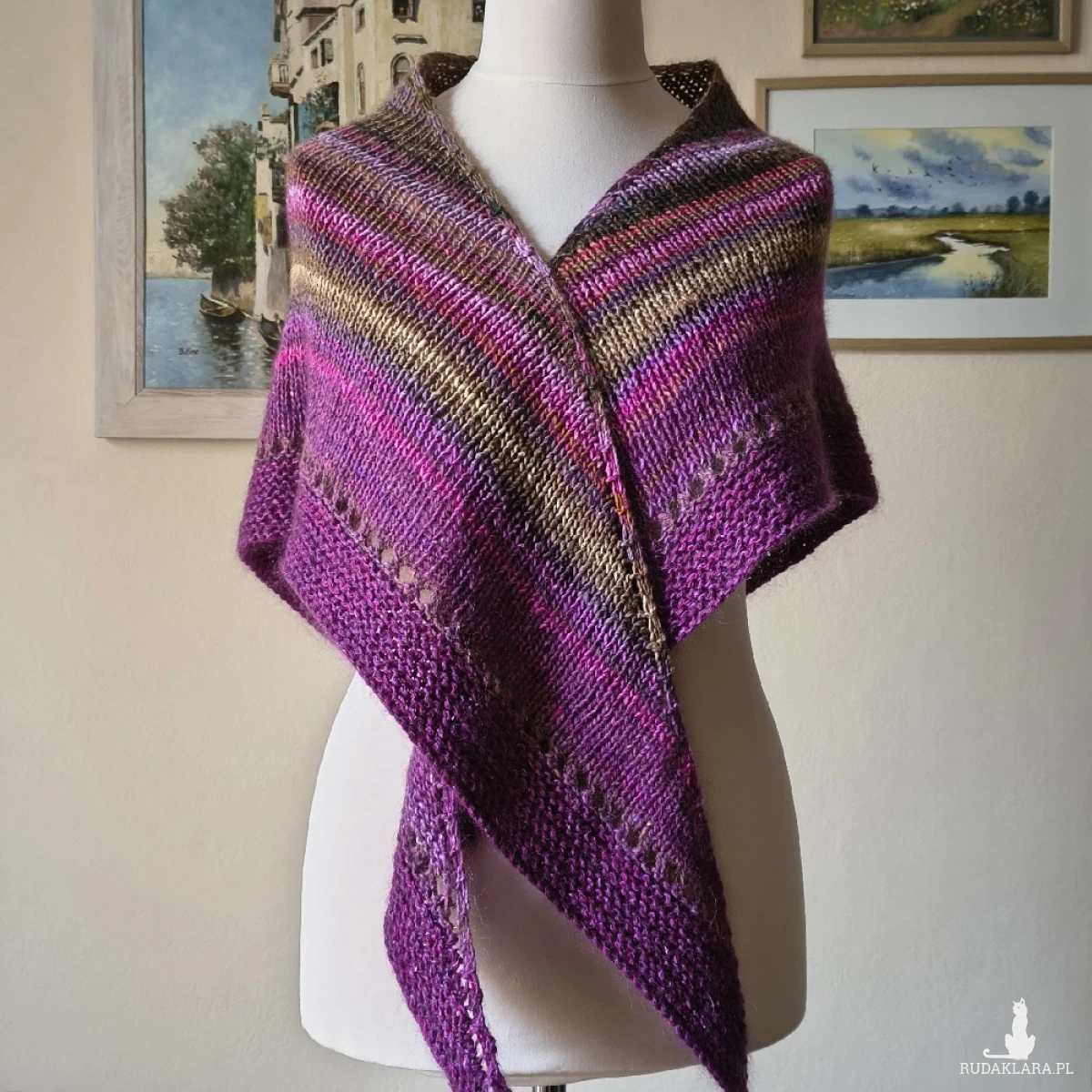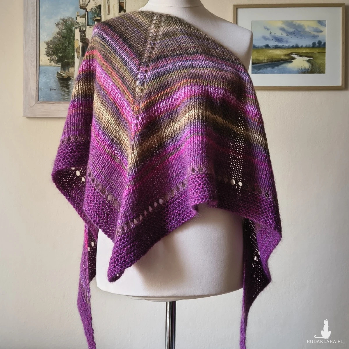 Miła, puchata, mięsista, lejąca i bardzo ciepła chusta, wykonana ręcznie na drutach podwójną nitką z doskonałych włóczek (w tym wyjątkowej, kultowej i niestety bardzo drogiej włóczki japońskiej firmy Noro), kanadyjskiego, szlachetnego jedwabiu z moherem i wełenki 100% merino. Łączny skład włóczek to: jedwab, moher, wełenka merino i minimalna ilość poliamidu. Niestety zdjęcia nie oddają piękna kolorów ich gradientów i uroku włóczek. kolorystyka włóczek jedwabno-moherowych została dobrana w taki sposób, aby jak najlepiej wyeksponować japońską Noro. Chusta jest twarzowa, a jej barwy niecodzienne i oryginalne. Jest przy tym bardzo ciepła: doskonała do zimowego otulenia, jak i okrycia w cieplejszych miesiącach. Wymiary: 202 cm. najdłuższy bok, 66 cm. wys. trójkąta. Na cenę chusty ma wpływ cena włóczek. Pranie wyłącznie ręczne.