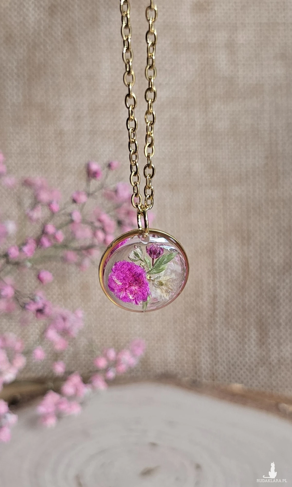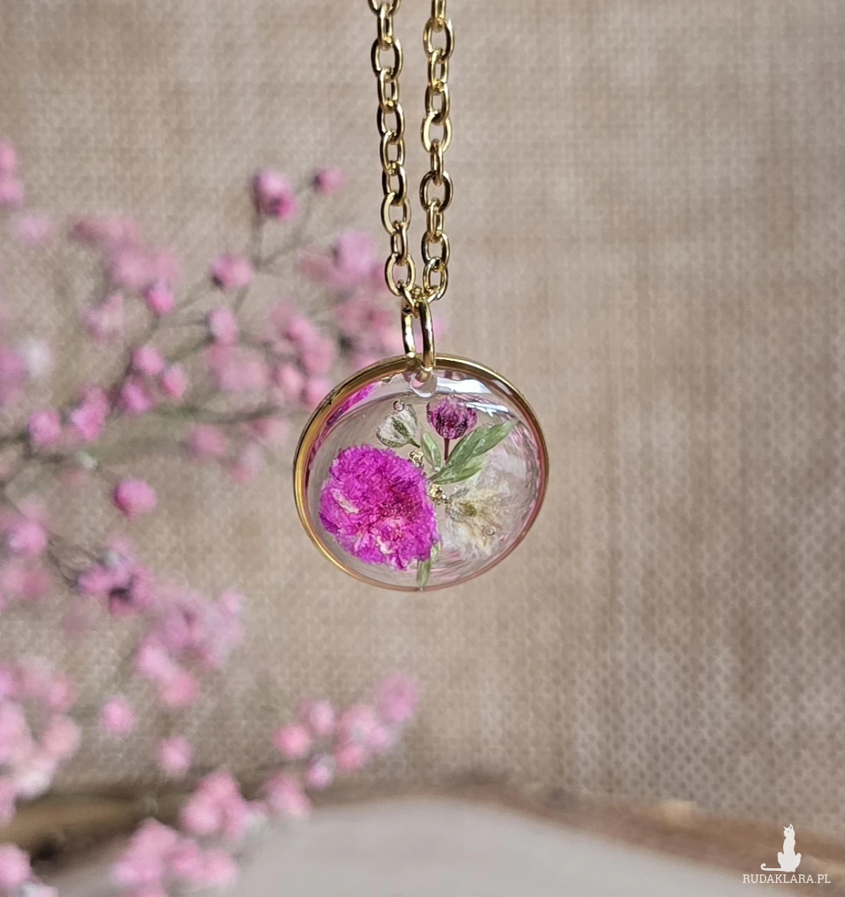 Oferuję Państwu unikalną biżuterię. Zawieszka jest wykonana z suszonych kwiatów i żywicy epoksydowej. Biżuteria jest wspaniałym i oryginalnym prezentem na lata.