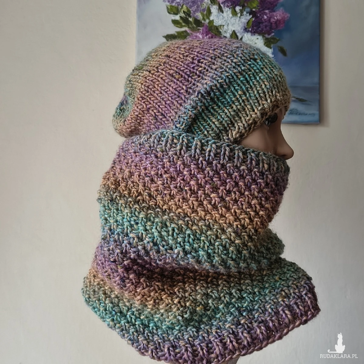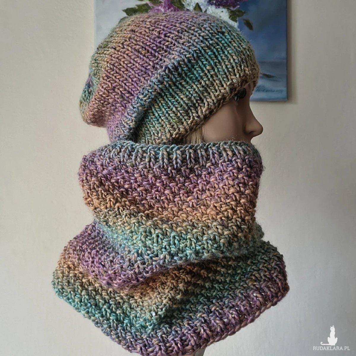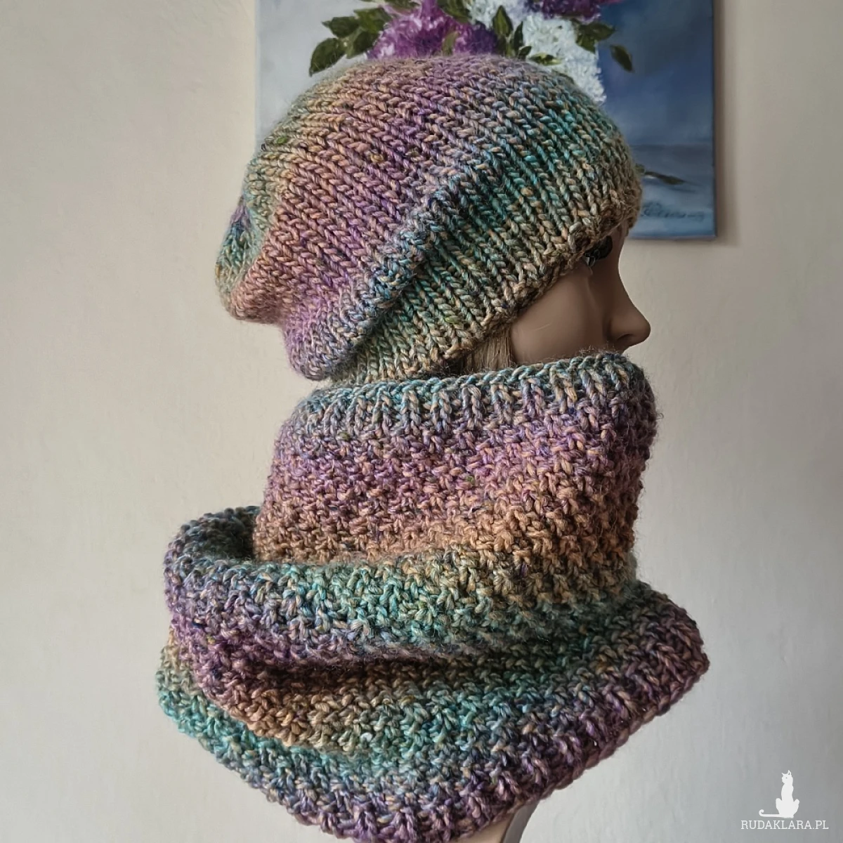 Miły, ciepły, bezszwowy komplet (robiony naokoło, a nie zszywany) wykonany ręcznie na drutach z doskonałej hiszpańskiej włóczki o składzie: 47% akryl, 47% wełna, 6% wiskoza. Pomimo wełny w składzie, komplet jest niezwykle miły. Super dodatek do zimowych stylizacji. Twarzowa kolorystyka i przytulny tweedowy efekt włóczki. Czapka z nieco przedłużonym tyłem pomieści bujną fryzurę. Wymiary: dł. czapki 26,5 cm, polecam dla obwodów głowy 55-57 cm. Brak klasycznego ściągacza nie grozi rozciągnięciem czapki. Wymiary komina: dł. 34 cm, szer. góra: 54 cm, dół; 60 cm. Komplet w rzeczywistości prezentuje się lepiej niż na zdjęciu.