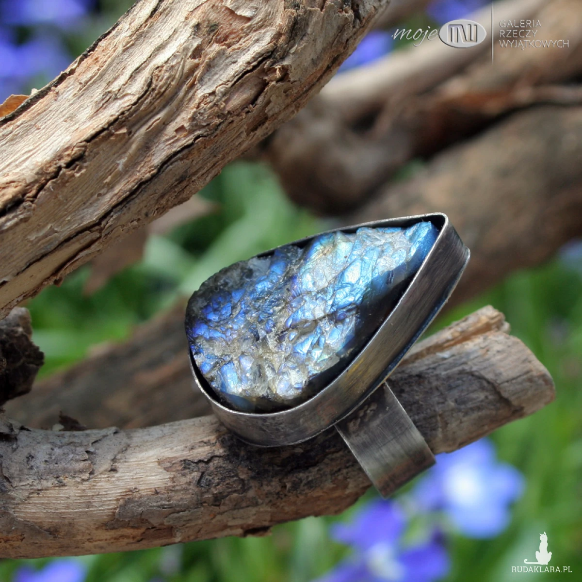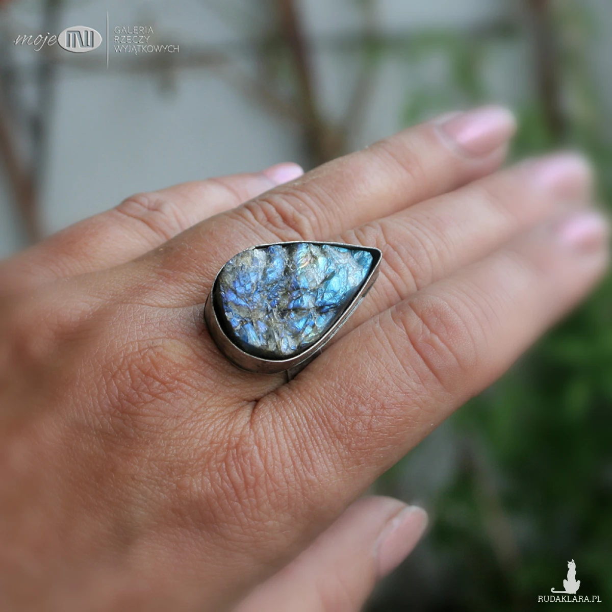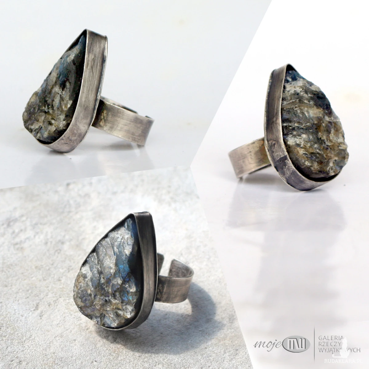 Pierścionek z surowym labradorytem w kształcie łzy. Kamień oprawiony jest prosto w srebro - szeroka obrączka i minimalistyczna oprawa.