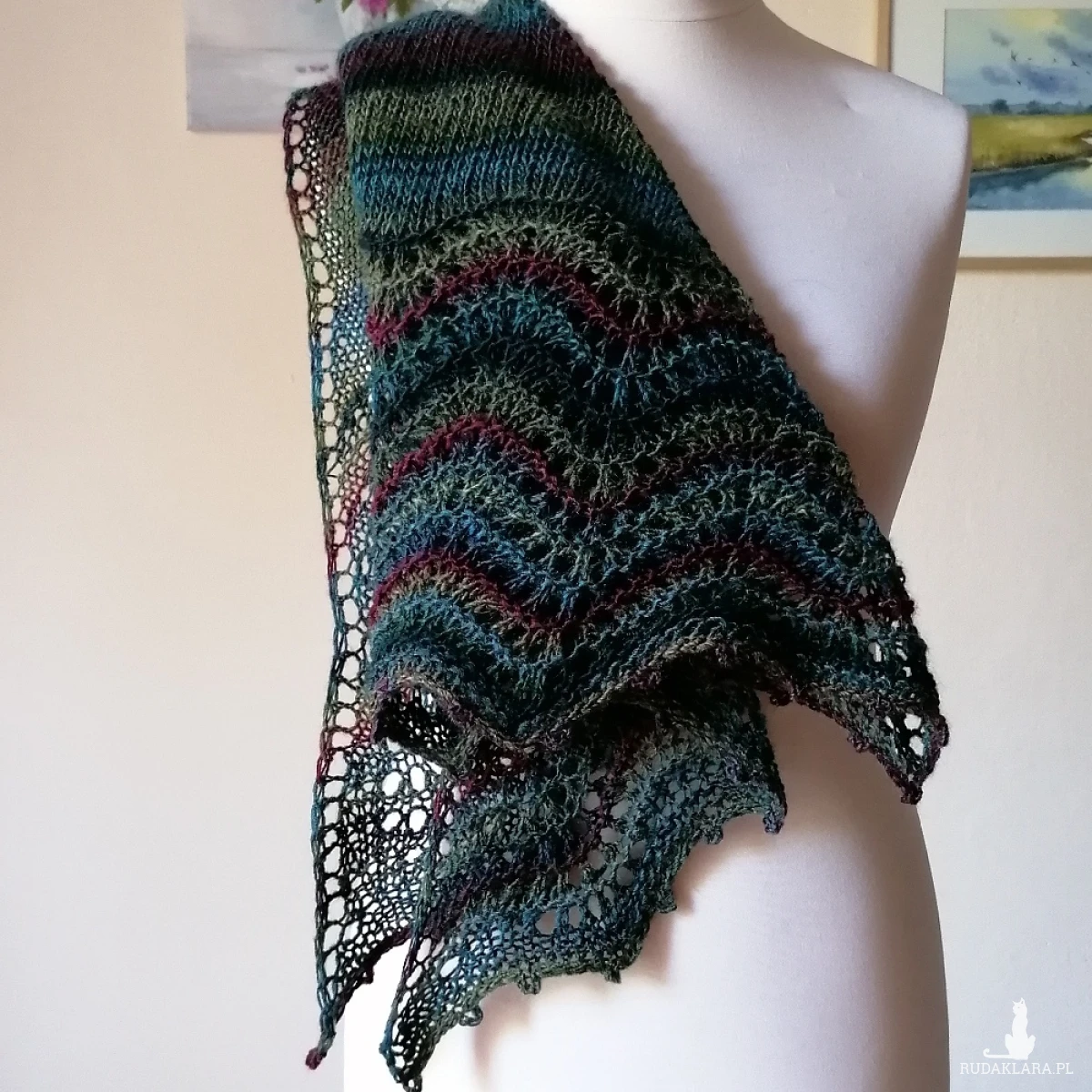 Miła, lekka, świetnie układająca się chusta wykonana ręcznie na drutach z doskonałej hiszpańskiej włóczki wełniano - akrylowej (przewaga wełny). Chusta jest przyjemna dla skóry, a ciekawy układ kolorystyczny czyni ją interesującą dla oka. Wymiary chusty: 174 cm. bok najdłuższy, 74 cm wysokość trójkąta. Pranie ręczne.