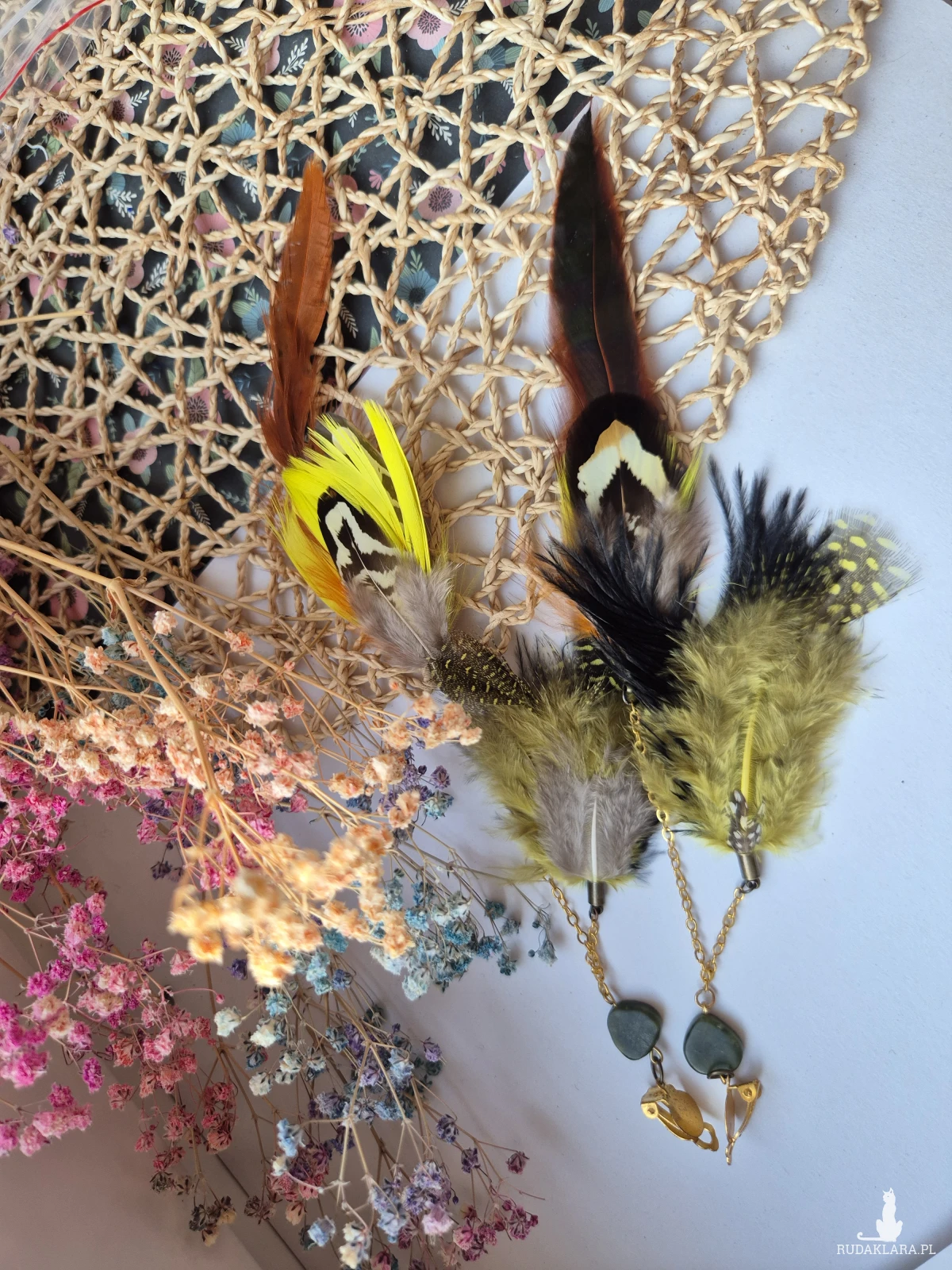 Klipsy kolory jesieni pióra eleganckie lekkie boho rękodzieło,polecam