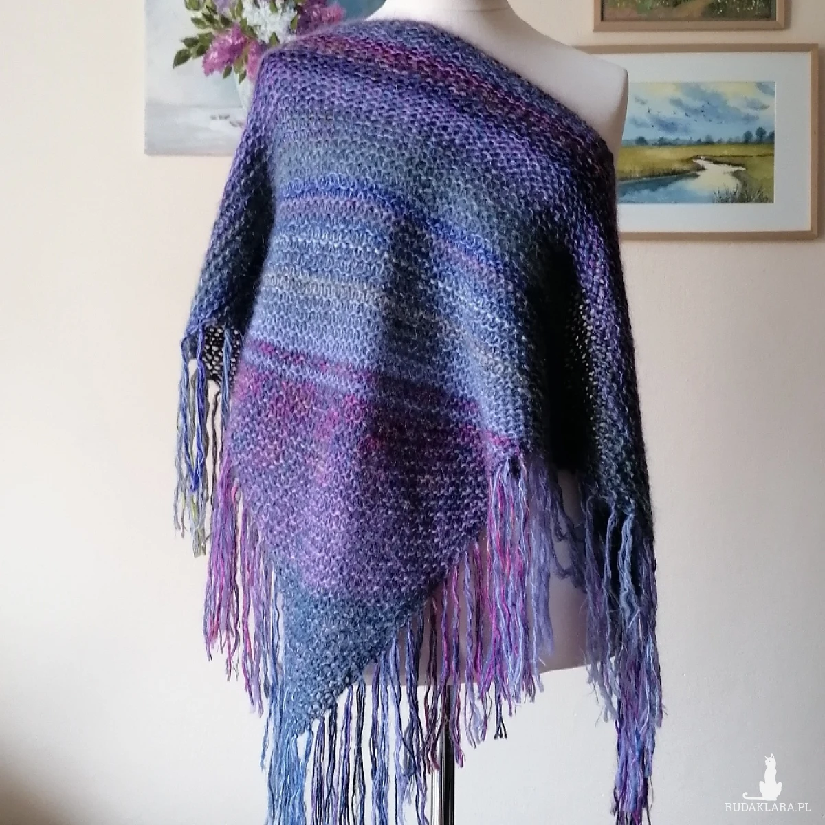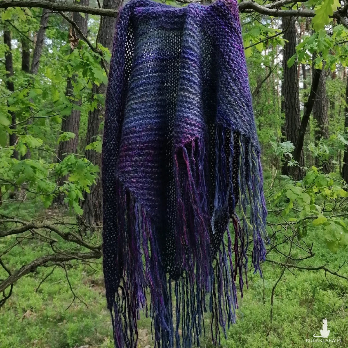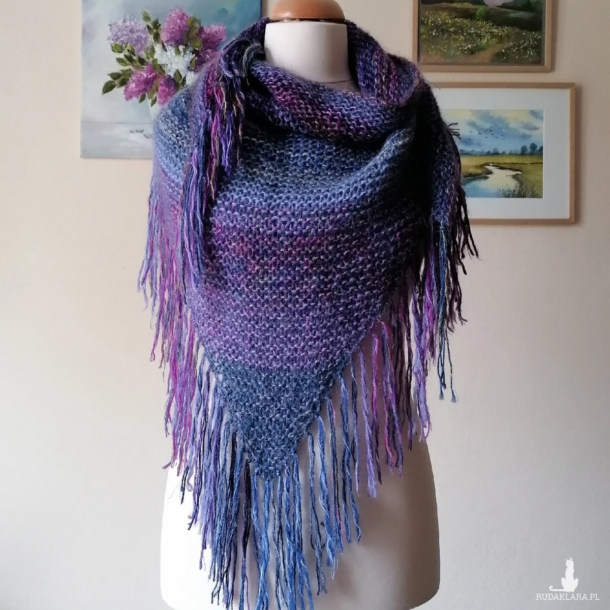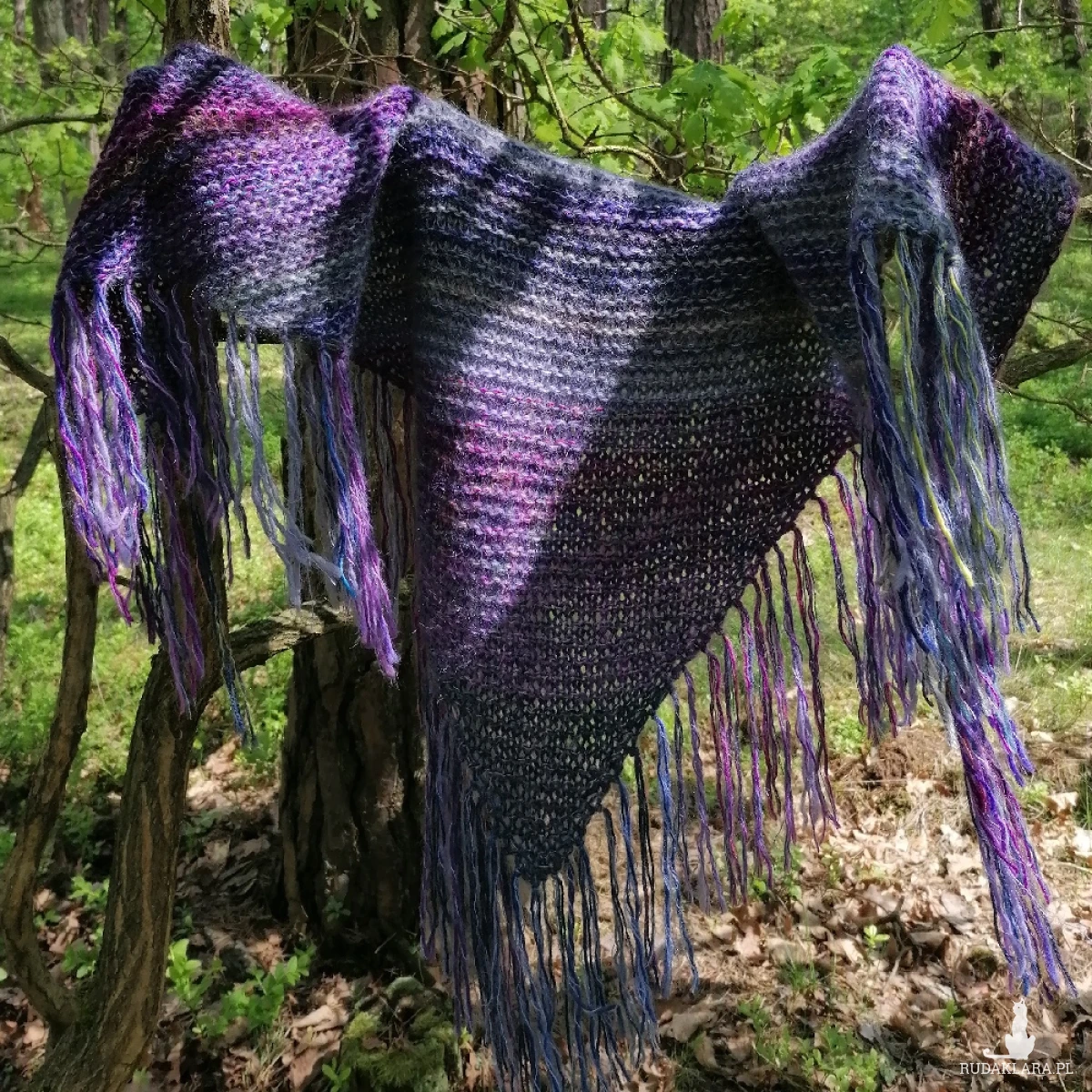 Mięsista, a przy tym lekka, lejąca, milutka i pięknie układająca się chusta, wykonana ręcznie na drutach z indywidualnie dobranych włóczek (nitka podwójna i potrójna), o składzie: wełna, alpaka, wełenka merino, kaszmir, moher, jedwab, niewielka ilość akrylu. Absolutnie niepowtarzalna, miłą, twarzowa, jedyna w swoim rodzaju. Niestety zdjęcia nie oddają cudnych niuansów kolorystycznych, ani miękkości włóczek. Wymiary bez frędzli: 172 cm bok najdłuższy, 76 cm wys. trójkąta. Pranie ręczne.