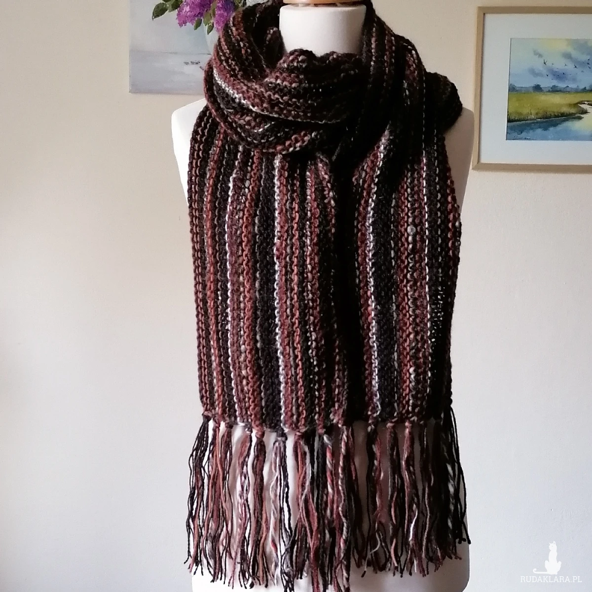 Dwustronny, mięsisty szal wykonany ręcznie na drutach z indywidualnie dobranych, delikatnych, a przy tym ciepłych włóczek, o składzie: wełna, wełenka merino, jedwab, alpaka, niewielka ilość akrylu. Niezwykle miękki, pięknie się układający. Wymiary bez frędzli: dł. 240 cm., szer. na płasko 22 cm. Zdjęcia nie oddają miękkości i faktury (zgrubienia, melanże) użytych włóczek. Polecam zarówno paniom, jak i panom. Pranie ręczne.